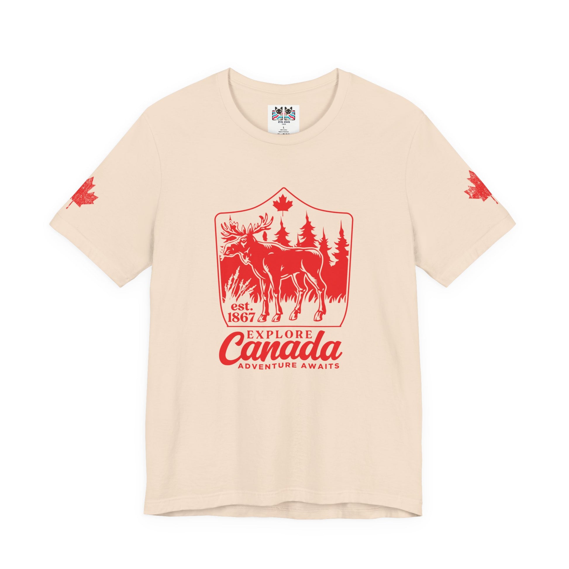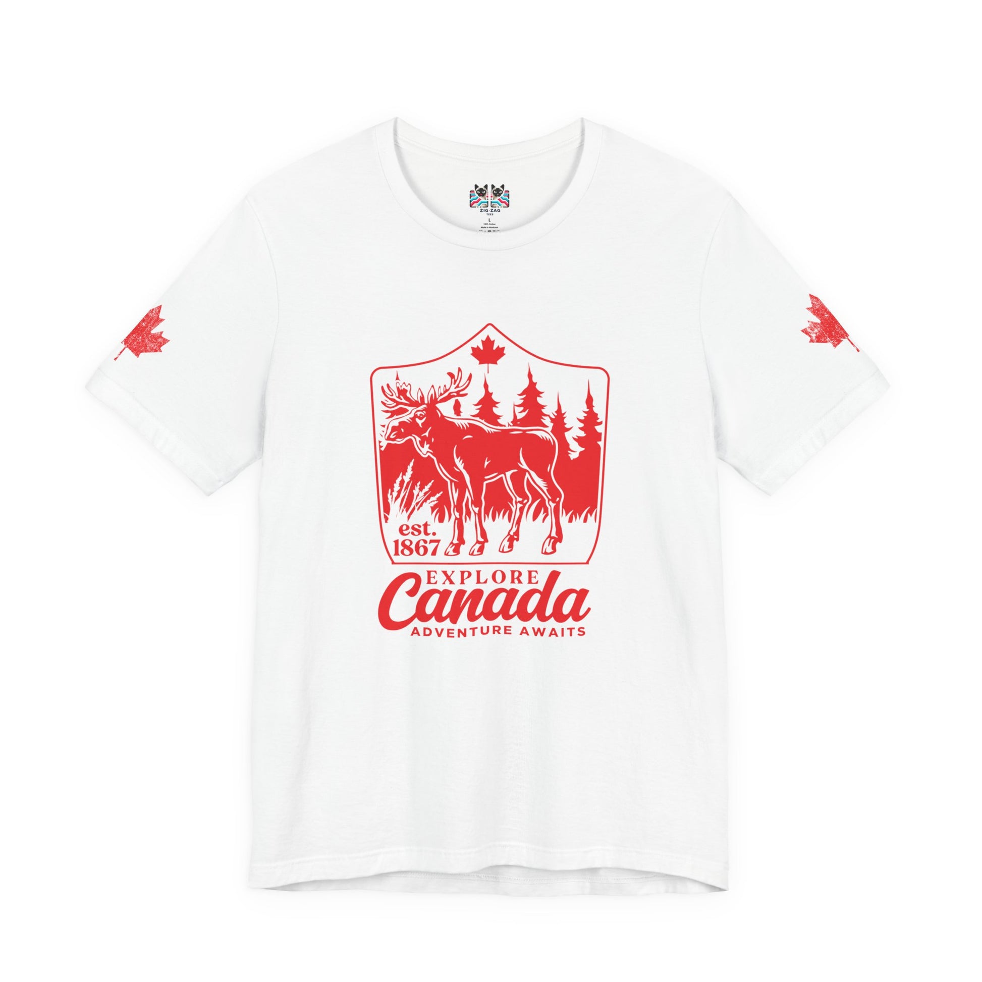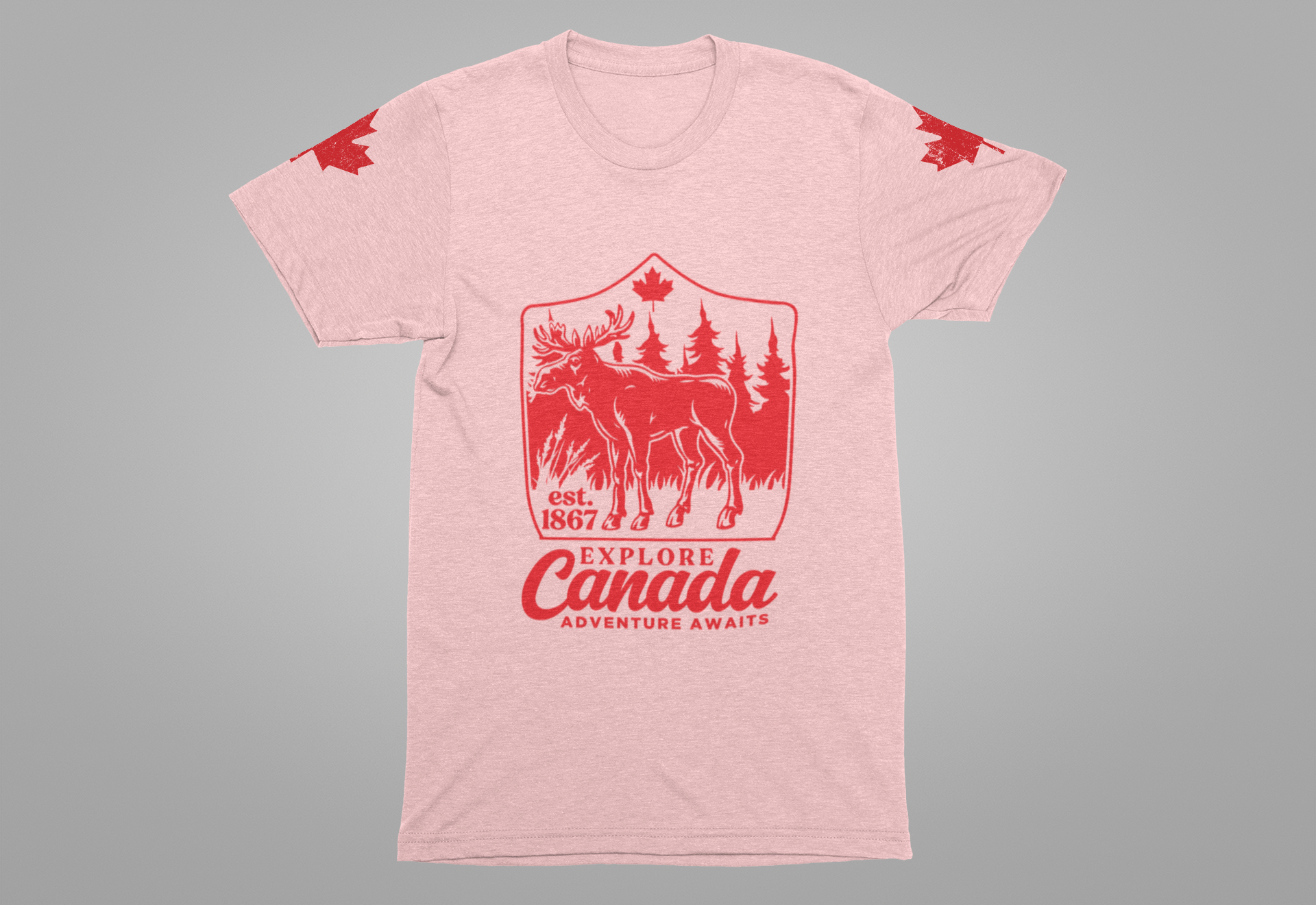 Head into the wild with this adventurous t-shirt featuring a Canadian Moose in front of a pine forest, crowned by a bold maple leaf at the top. The energetic design and uplifting "Explore Canada Adventure Awaits" text make this tee perfect for outdoor lovers, travelers, and anyone seeking the beauty of Canadian nature. Crafted from soft fabric, it’s ideal for casual wear, hiking, and celebrating the spirit of Canada’s wilderness heritage.