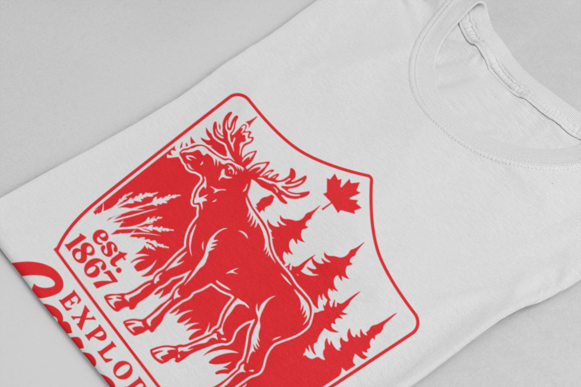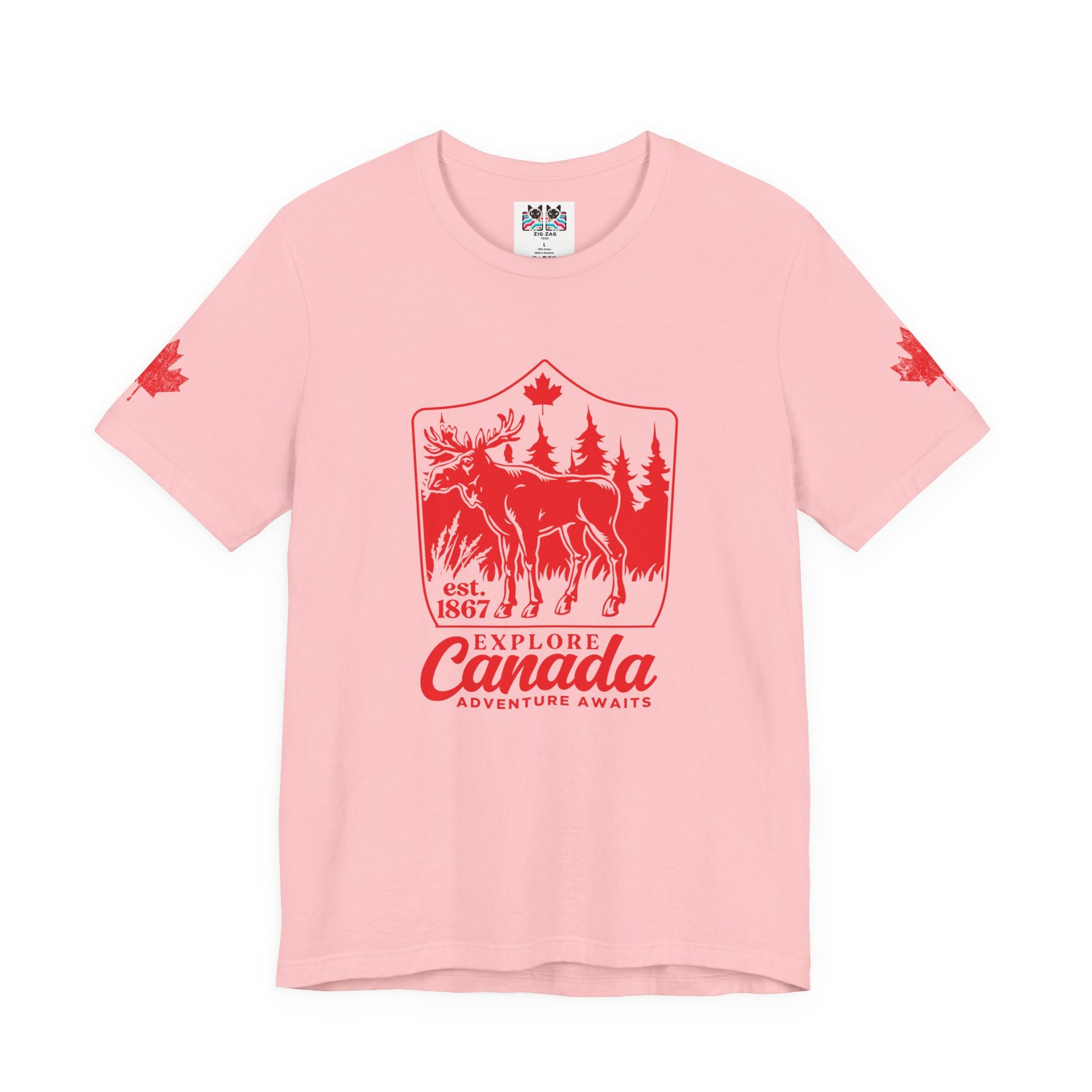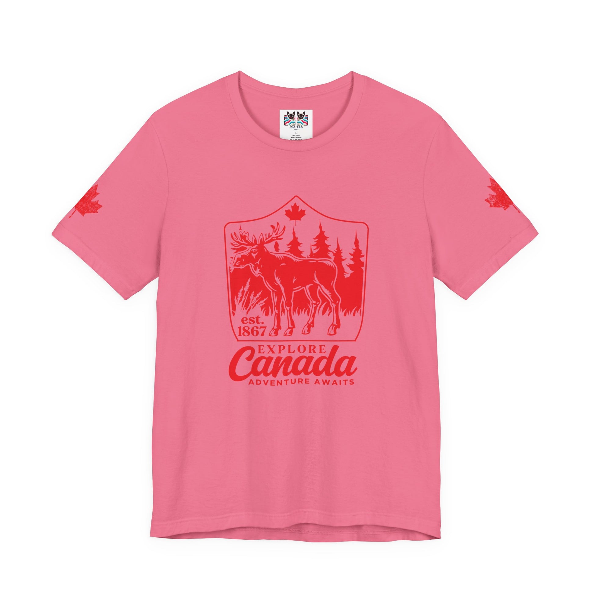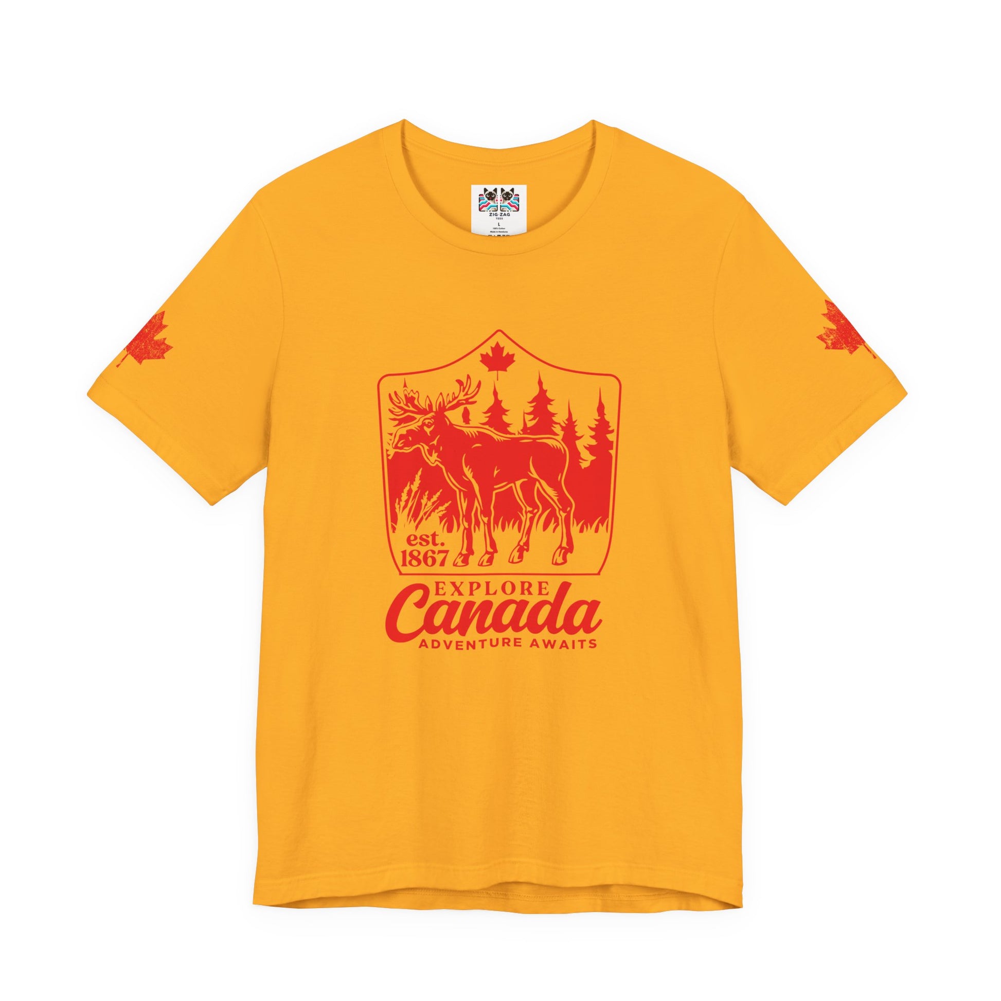 Head into the wild with this adventurous t-shirt featuring a Canadian Moose in front of a pine forest, crowned by a bold maple leaf at the top. The energetic design and uplifting "Explore Canada Adventure Awaits" text make this tee perfect for outdoor lovers, travelers, and anyone seeking the beauty of Canadian nature. Crafted from soft fabric, it’s ideal for casual wear, hiking, and celebrating the spirit of Canada’s wilderness heritage.