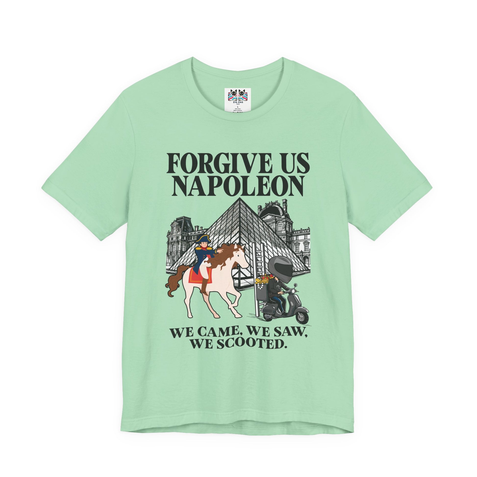 Make history fun with this action-packed t-shirt featuring Napoleon on horseback, dramatically chasing cartoon thieves riding a scooter loaded with a ladder and stolen jewels, set against the backdrop of the Louvre Museum. Large text reads "Forgive Us Napoleon" at the top, while the quippy slogan "We Came, We Saw, We Scooted" finishes off the bottom. This shirt is perfect for art lovers, Paris fans, or anyone who appreciates a creative, humorous twist on legendary capers.