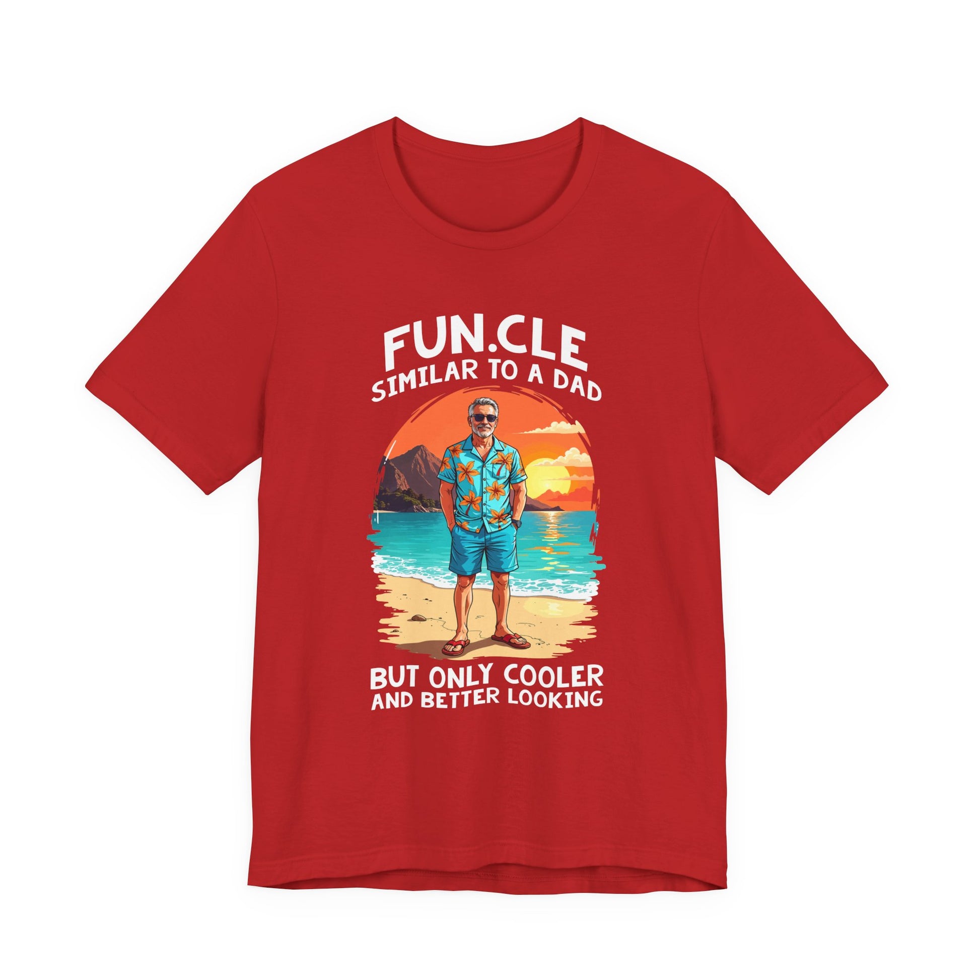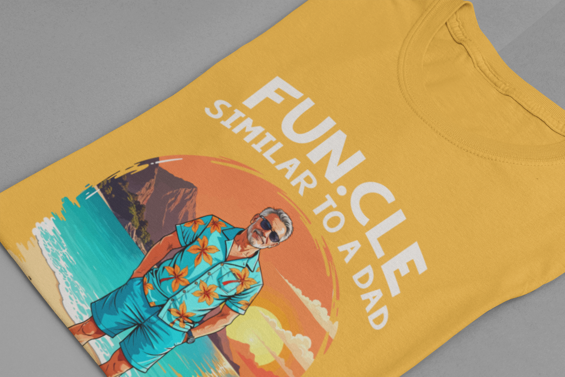 Celebrate the ultimate “fun-cle” with this vibrant T-shirt depicting a laid-back man in beach shirt, shorts, and slippers, standing on the shore with hands in pockets against a beautiful sunset background. Featuring the quirky phrase “FUN.CLE Similar to a Dad But Only cooler and better looking,” this tee is perfect for uncles who love good times and great style. A great gift for fun-loving uncles, family gatherings, or anyone who wants to flaunt their cool side at the beach.