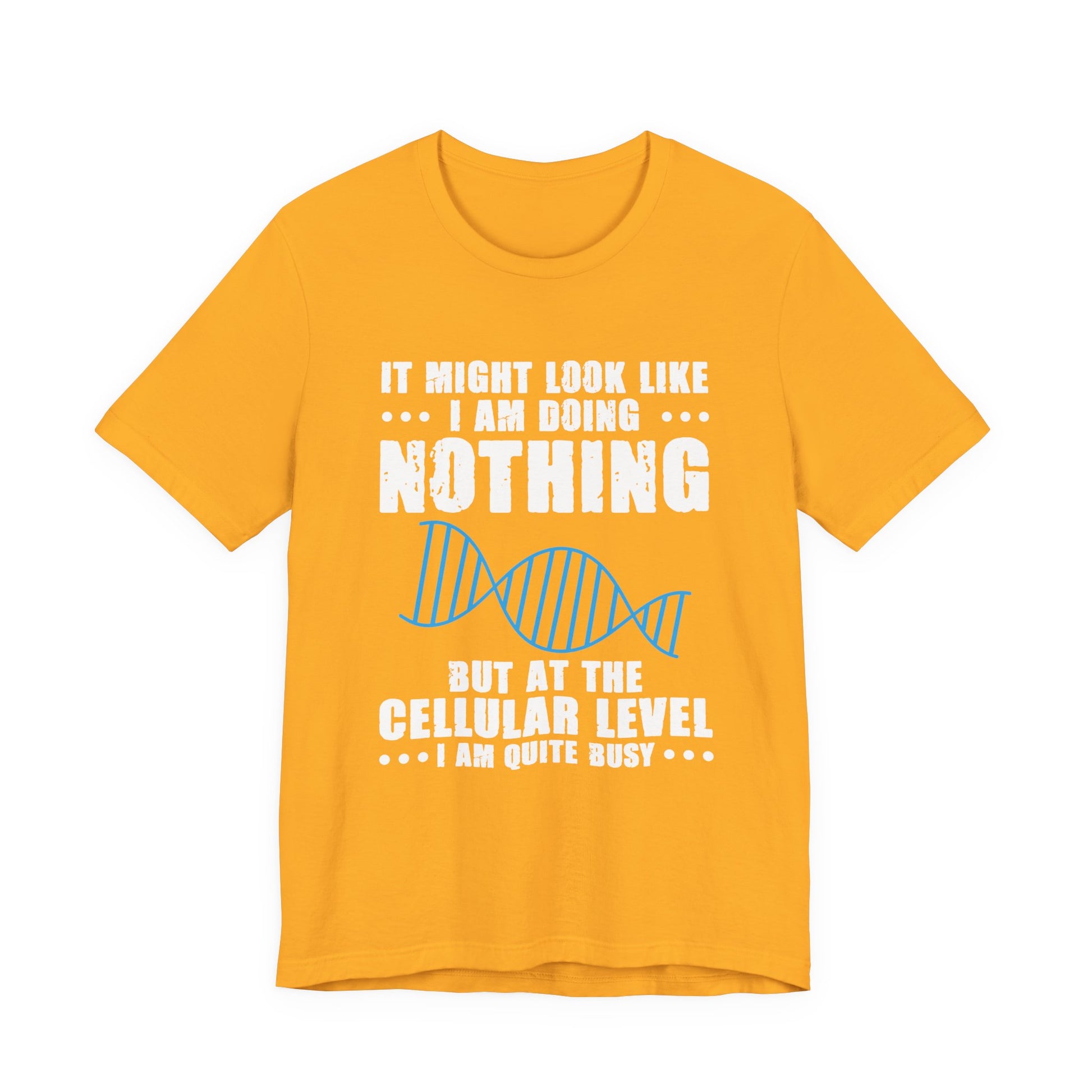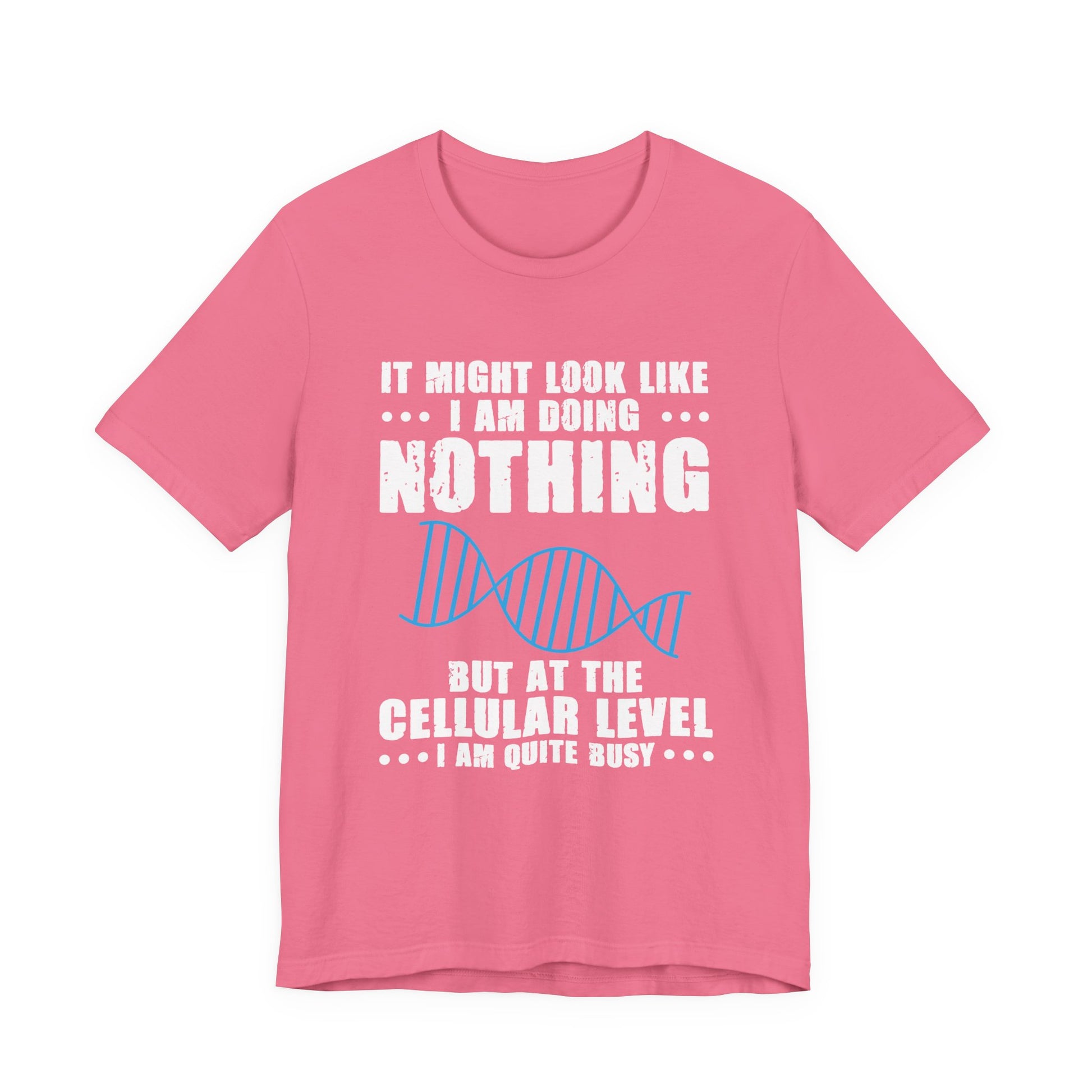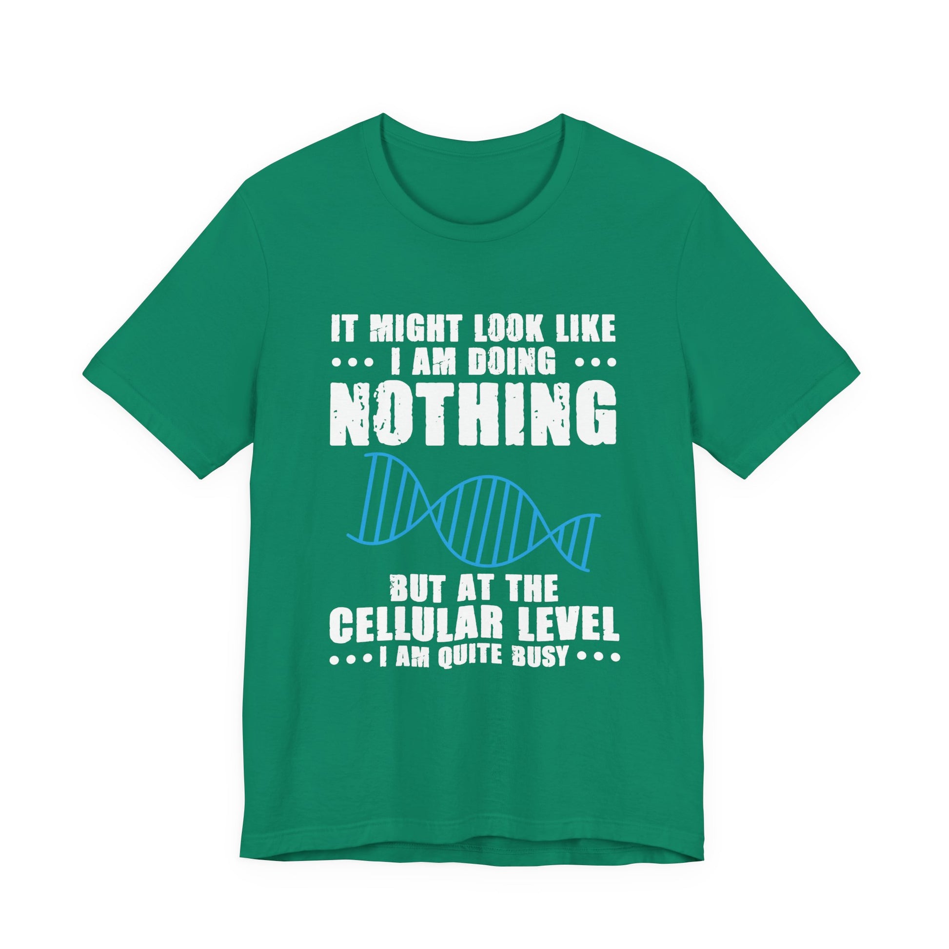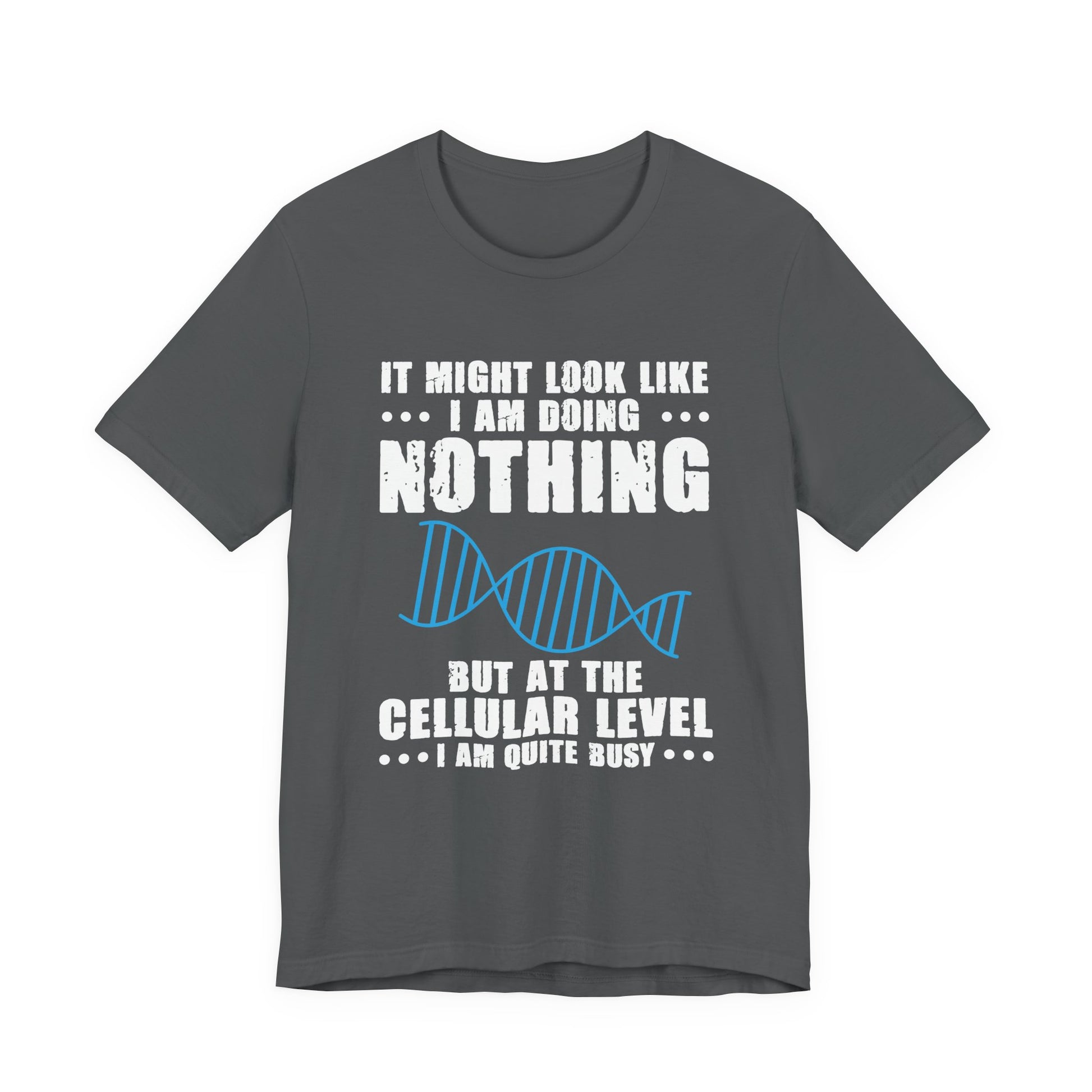 Let your sense of humor shine on a microscopic scale with this witty biology tee! Featuring a graphic of a cell or microscopic fibers, paired with the text “It might look like I’m doing nothing, But at the Cellular level, I’m Quite busy,” this shirt is perfect for biologists, lab techs, med students, and science enthusiasts. A fun gift for anyone who loves science jokes and nerdy conversation starters.