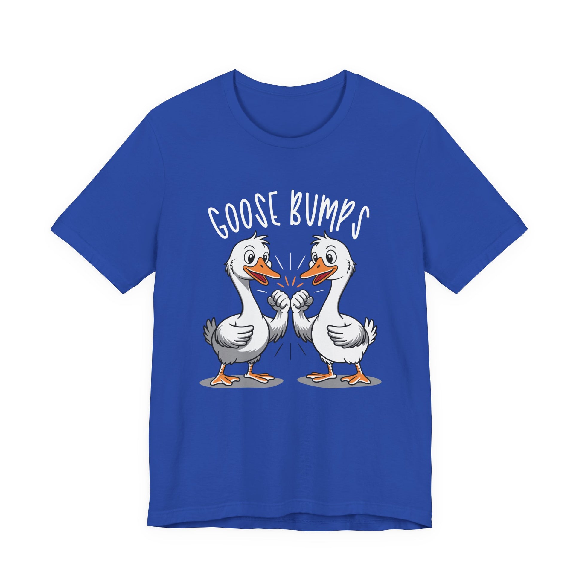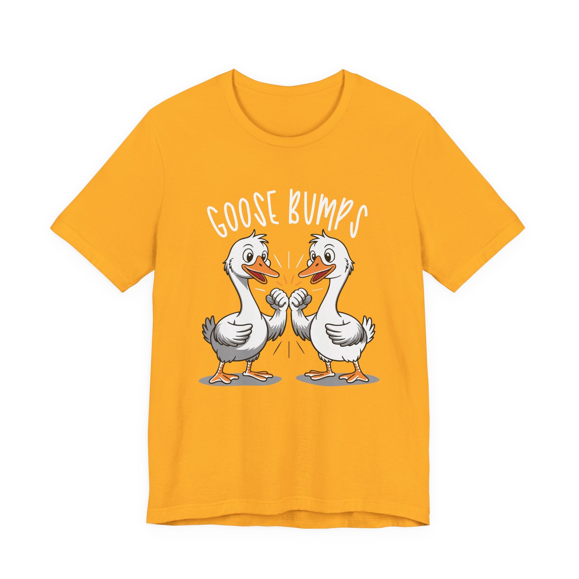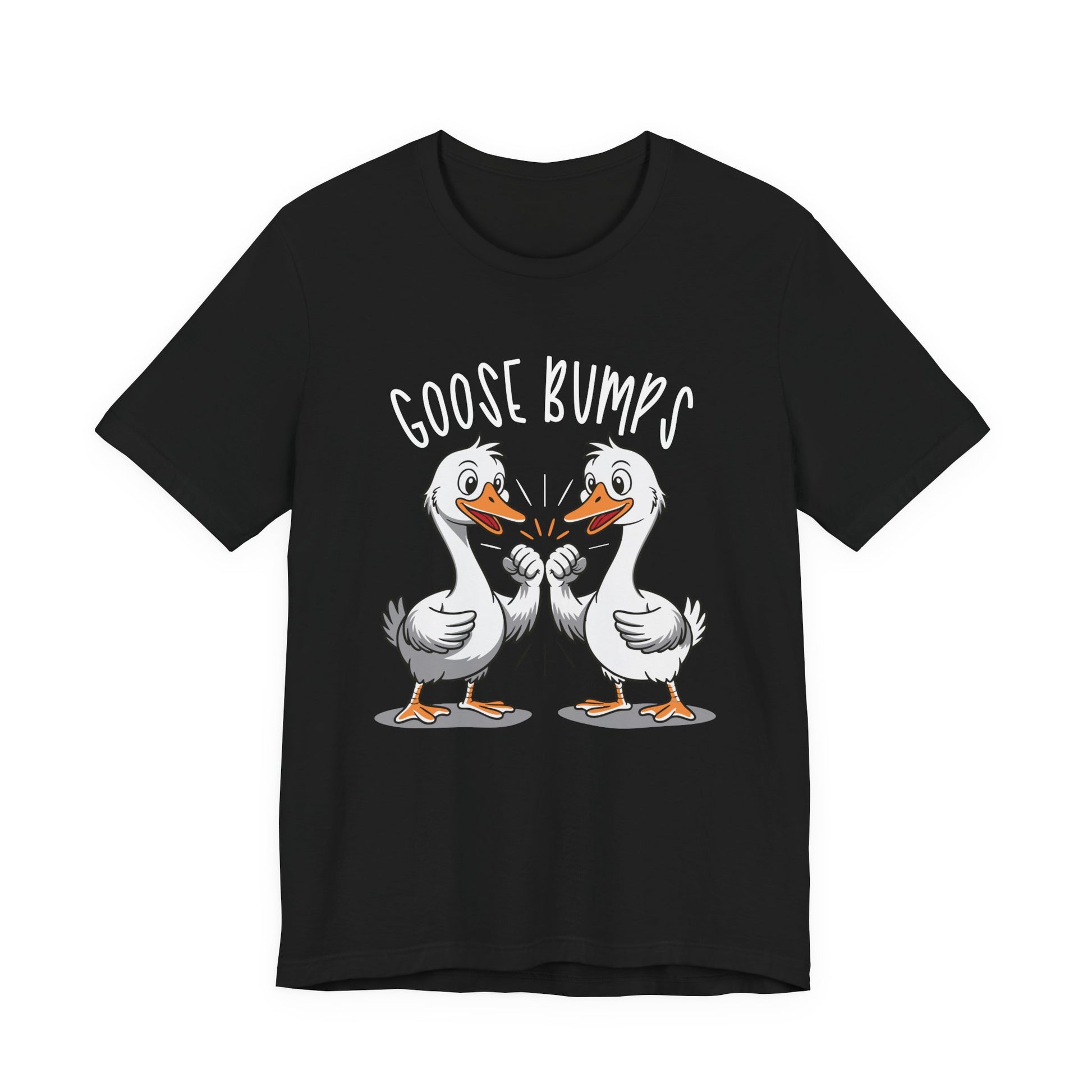 Bring some humor and heartwarming vibes with this playful “Goose Bumps” tee! Featuring two happy geese bumping fists in a cartoon style, it’s perfect for animal lovers, pun fans, and anyone who appreciates clever wordplay. A lighthearted gift for friends, family, or anyone who enjoys a good laugh with their casual wear.
