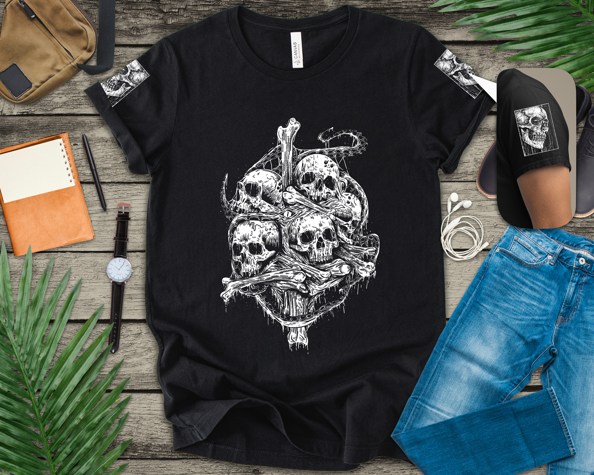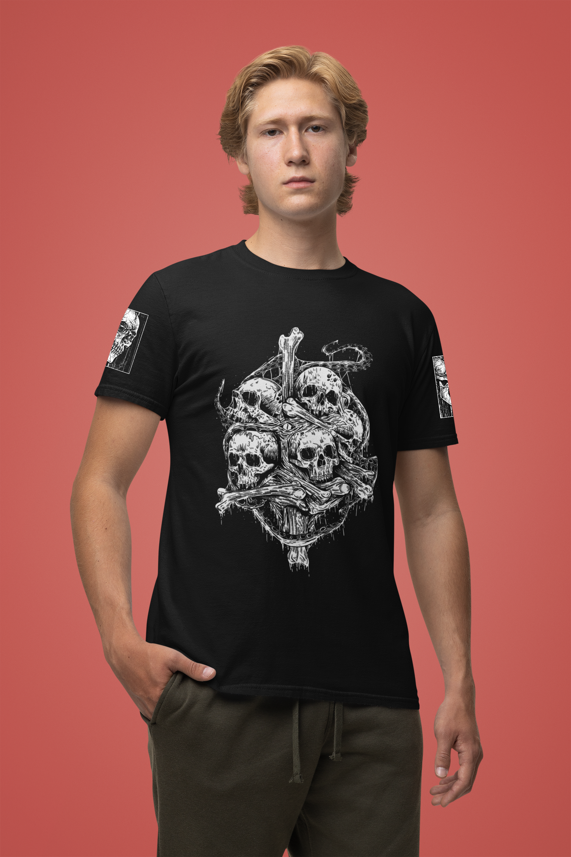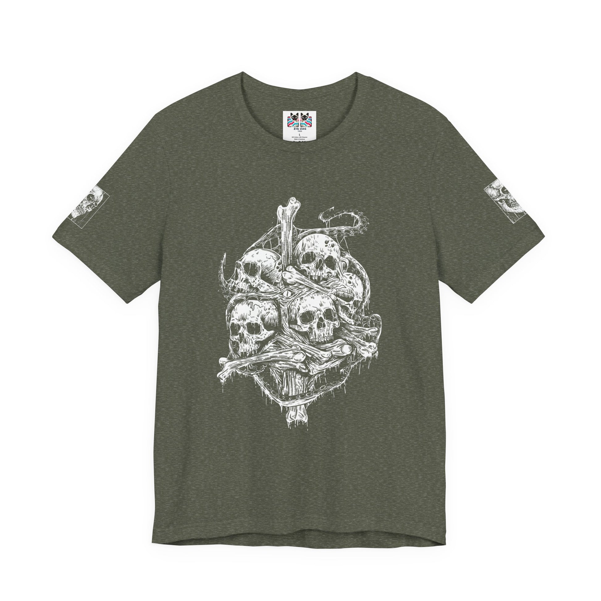 This powerful design speaks to themes of mortality, memento mori (remember you must die), and the gothic tradition of using death imagery as artistic expression. The pile of skulls with bones creates a striking visual that's both unsettling and captivating, appealing to fans of dark aesthetics, heavy metal culture, horror movies, and alternative fashion. The detailed artwork shows multiple perspectives and anatomical accuracy that art enthusiasts will appreciate.
