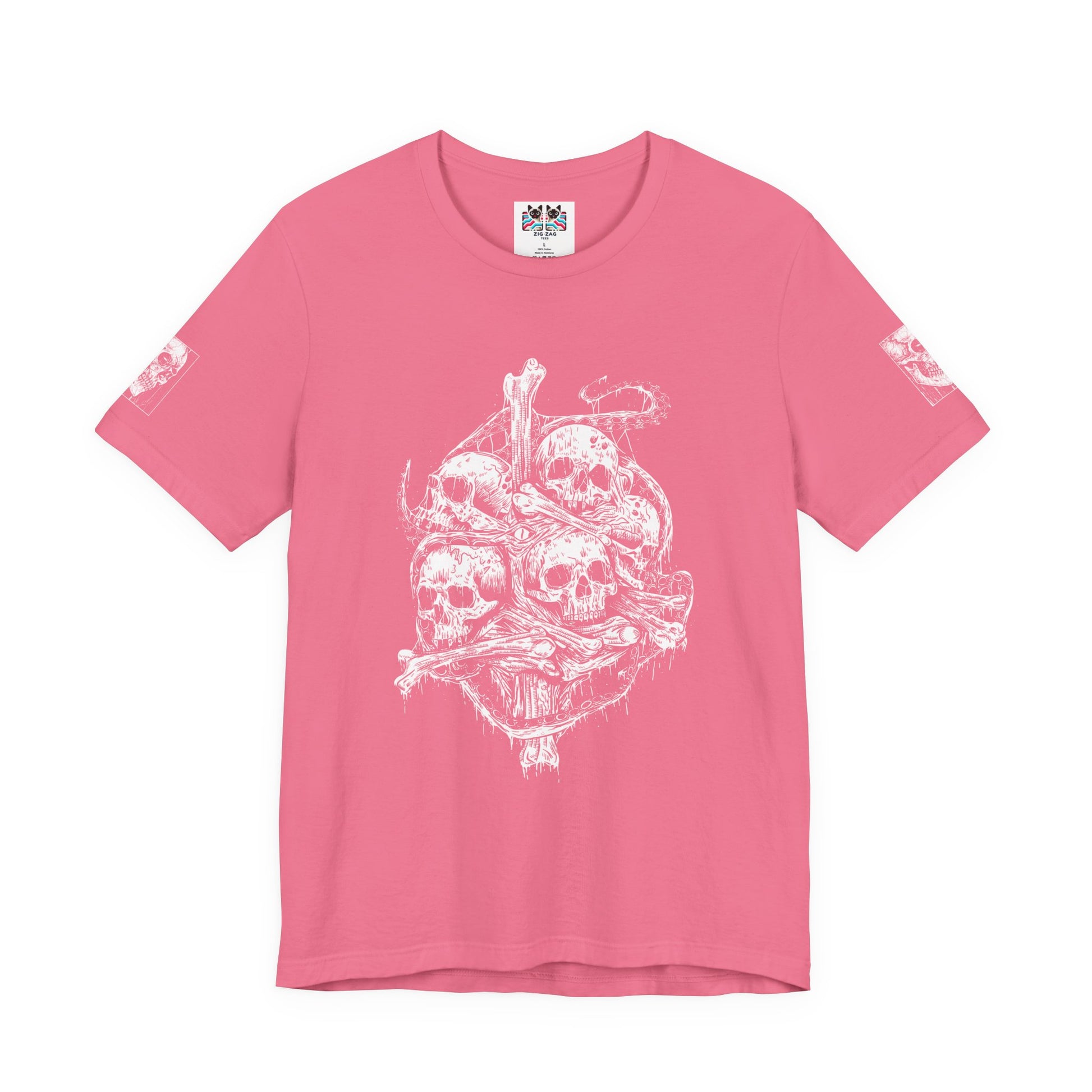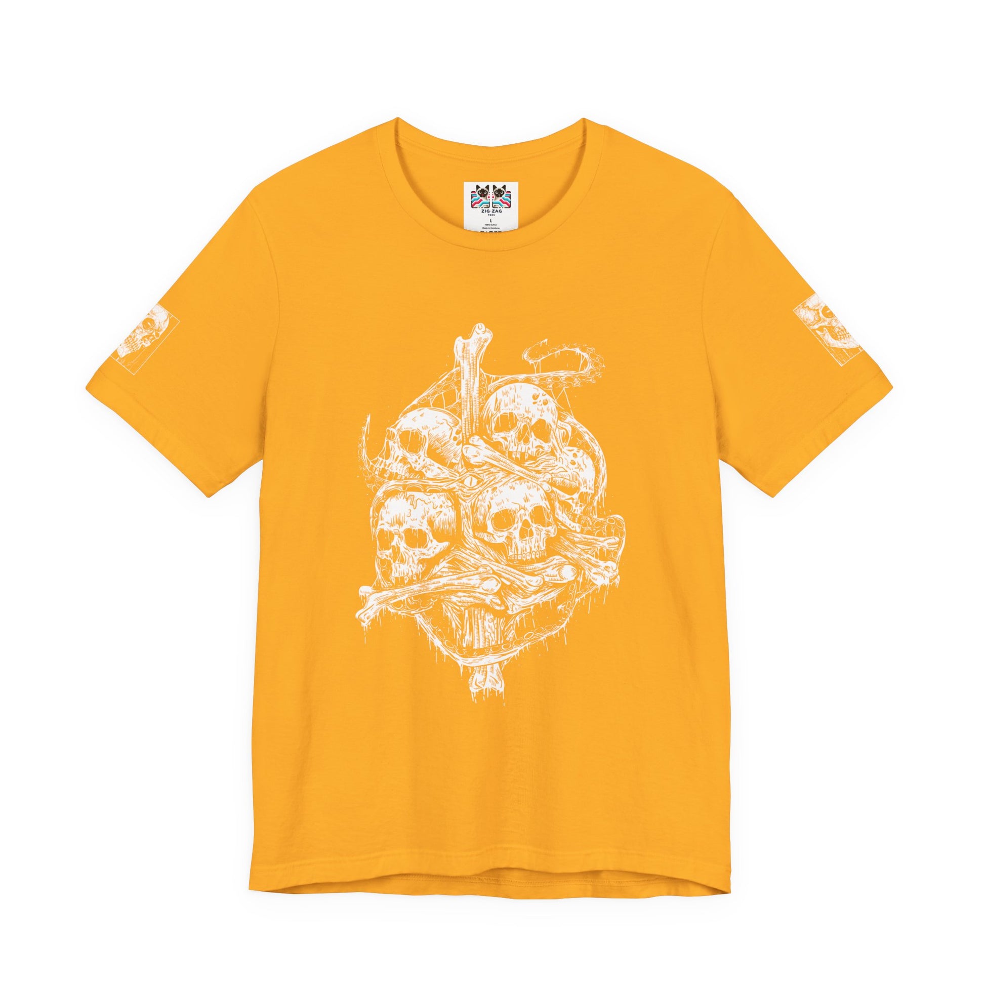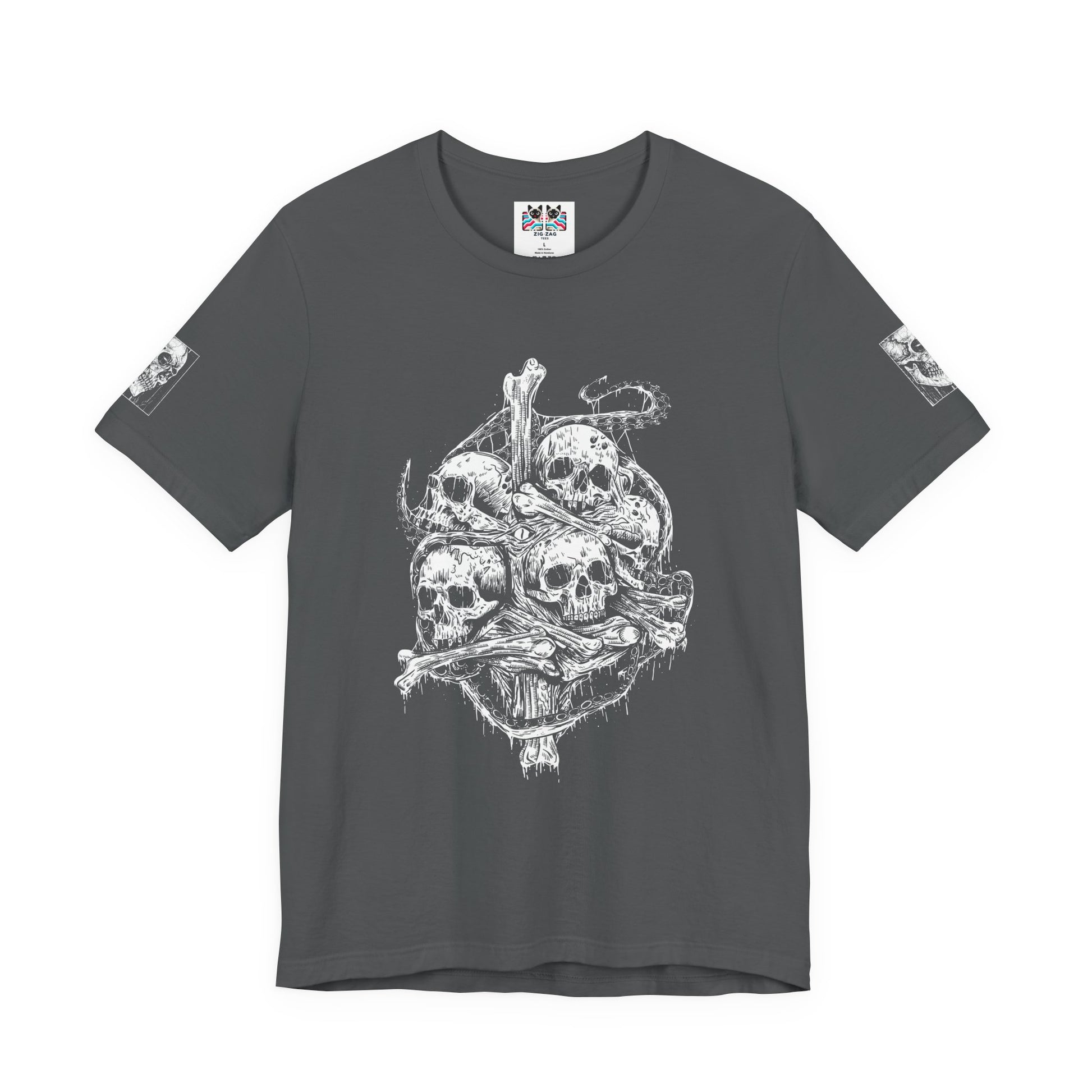 Features matching skull sleeve accents. The unisex fit is designed for all body types. Premium black fabric provides the perfect canvas for this striking white ink design. A bold gift for horror lovers, metal fans, gothic fashion enthusiasts, and dark art collectors.