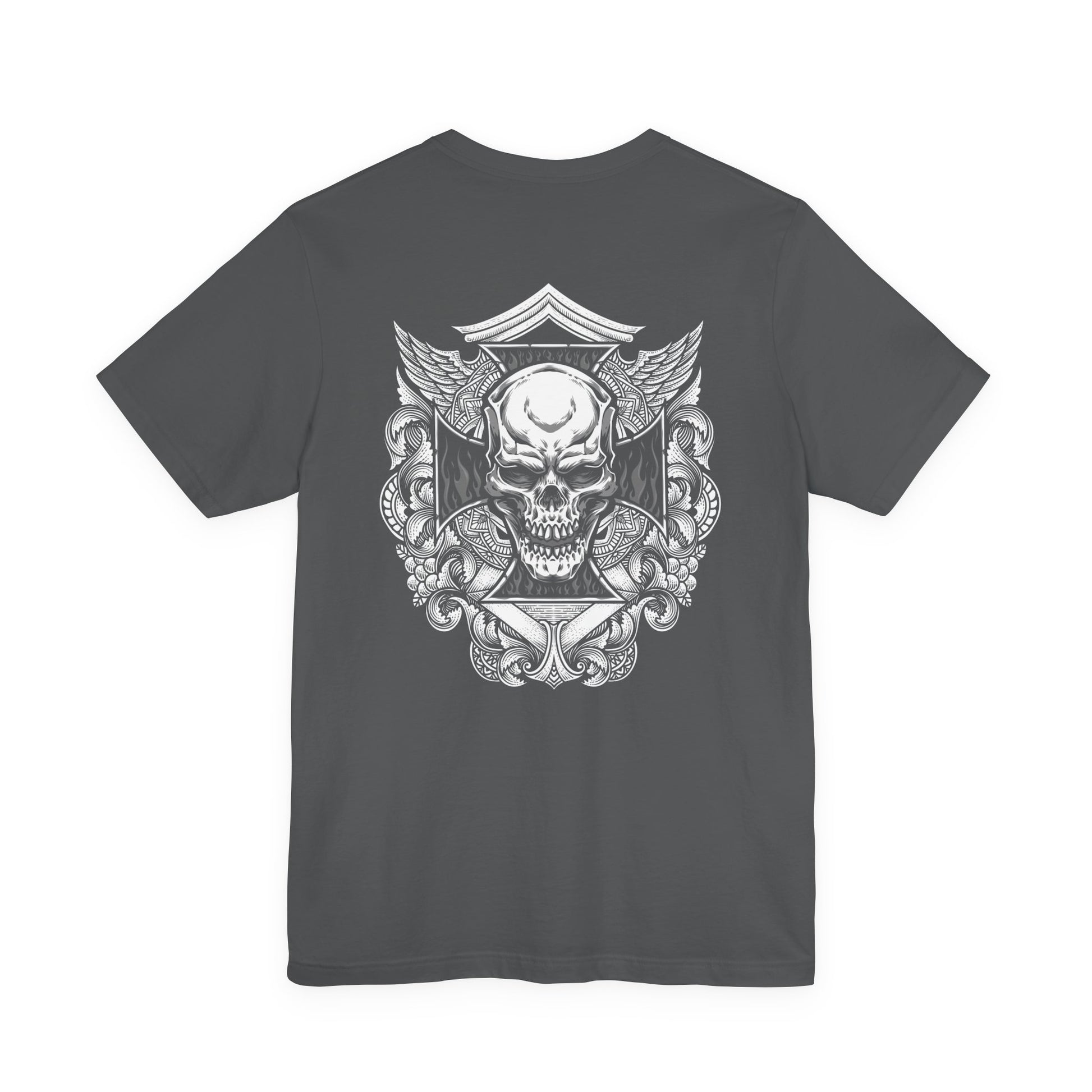 Bring bold gothic energy to your wardrobe with this detailed skull t-shirt featuring an ornate winged skull crest on the front surrounded by filigree, bones, and armor-style elements. The back design showcases a large central skull with wings and intricate baroque patterns, creating a powerful tattoo-inspired graphic that pops on dark fabric. Perfect for metalheads, bikers, gothic fashion fans, and anyone who loves dark ornamental art, this tee is ideal for concerts, festivals, or everyday alternative style.