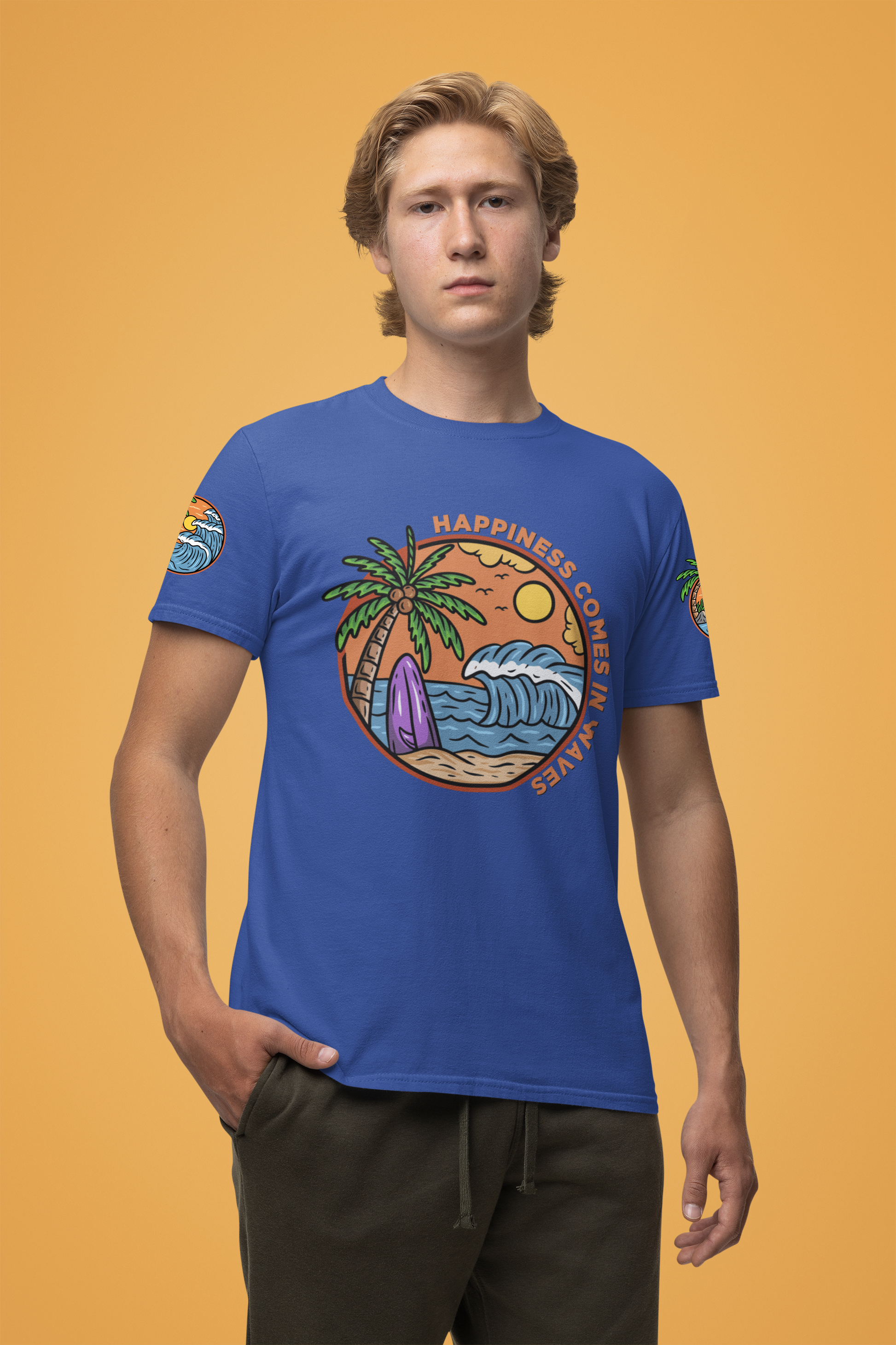 Ride the wave of positivity with this vibrant "Happiness Comes in Waves" beach t-shirt featuring a stunning circular design of ocean waves, palm trees, and a surfboard under a glowing sunset. The retro-style illustration captures the laid-back beach lifestyle and the natural ebb and flow of joy in life, reminding us that happiness, like ocean waves, comes and goes in beautiful rhythms.
