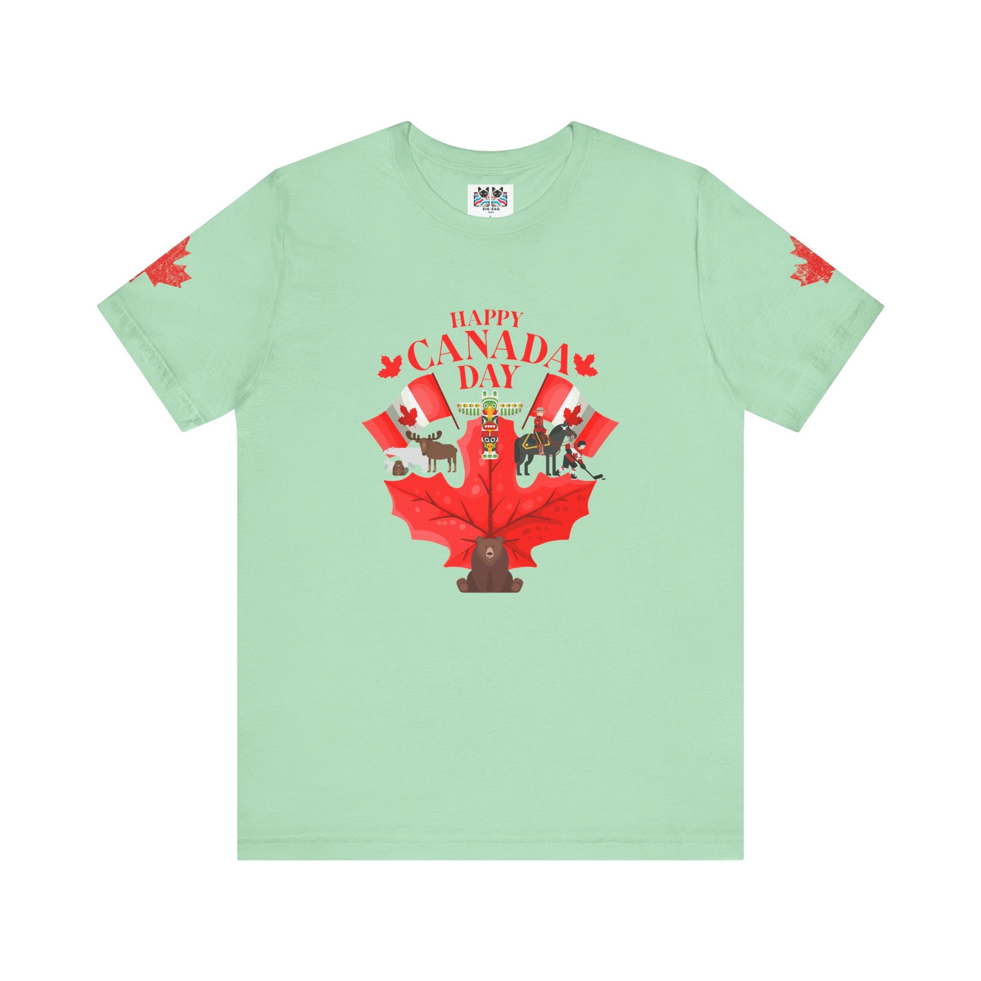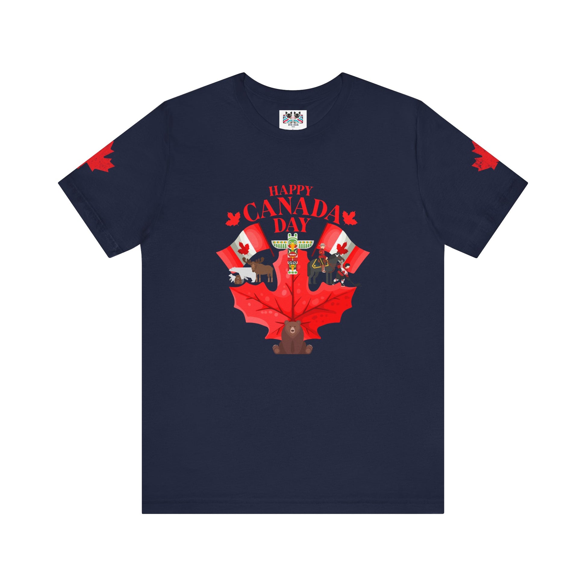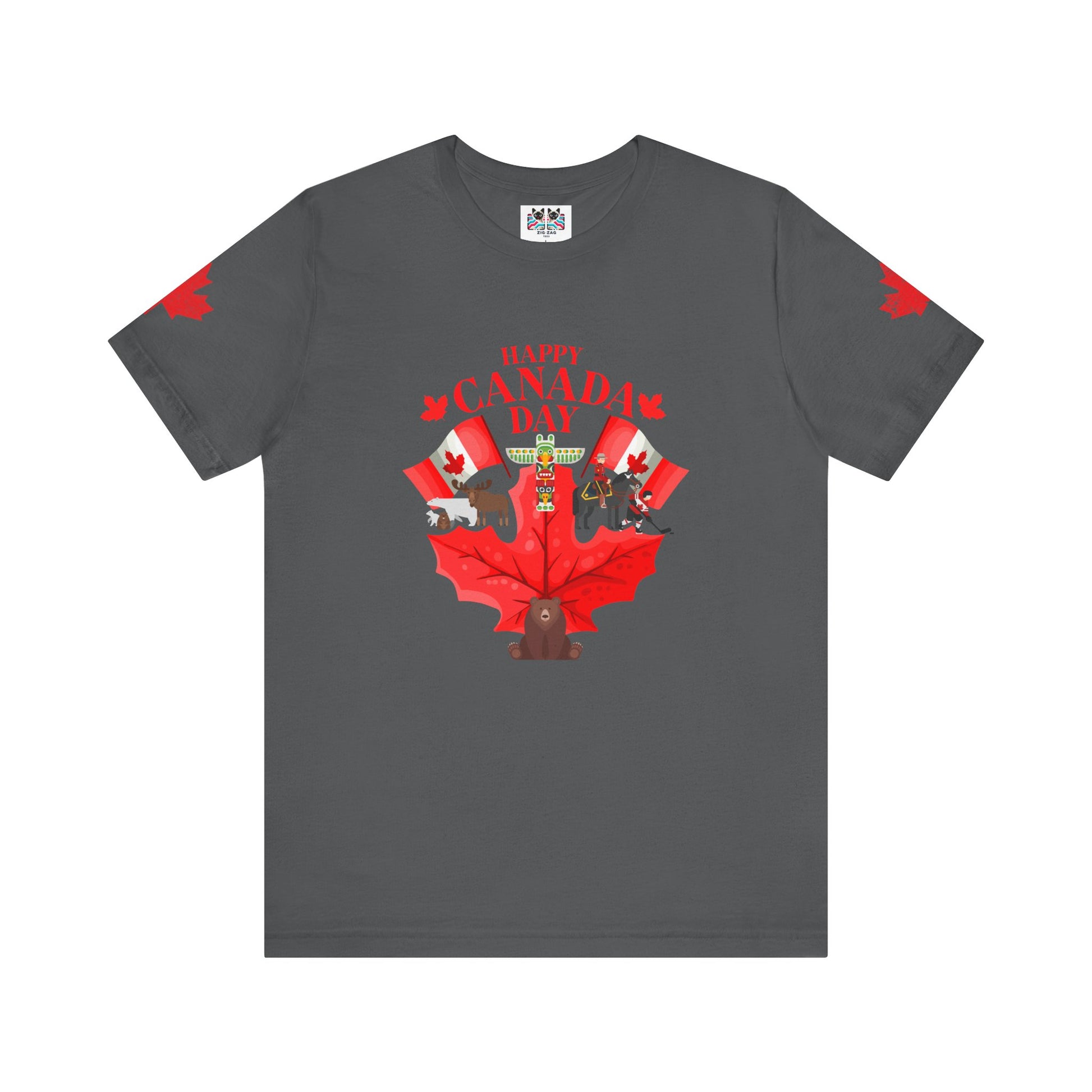 Celebrate Canada Day in vibrant style with this playful t-shirt featuring a large red maple leaf at the center, surrounded by festive Canadian icons. The graphic showcases fun designs, including patriotic animals (bear, moose), hockey, Mountie, maple flags, and Canada-themed balloons. "Happy Canada Day" is boldly printed at the top, creating a cheerful and spirited look. Maple leaf accents appear on both sleeves, making this tee perfect for family gatherings, parades, and anyone proud to show off their Canadian roots.
