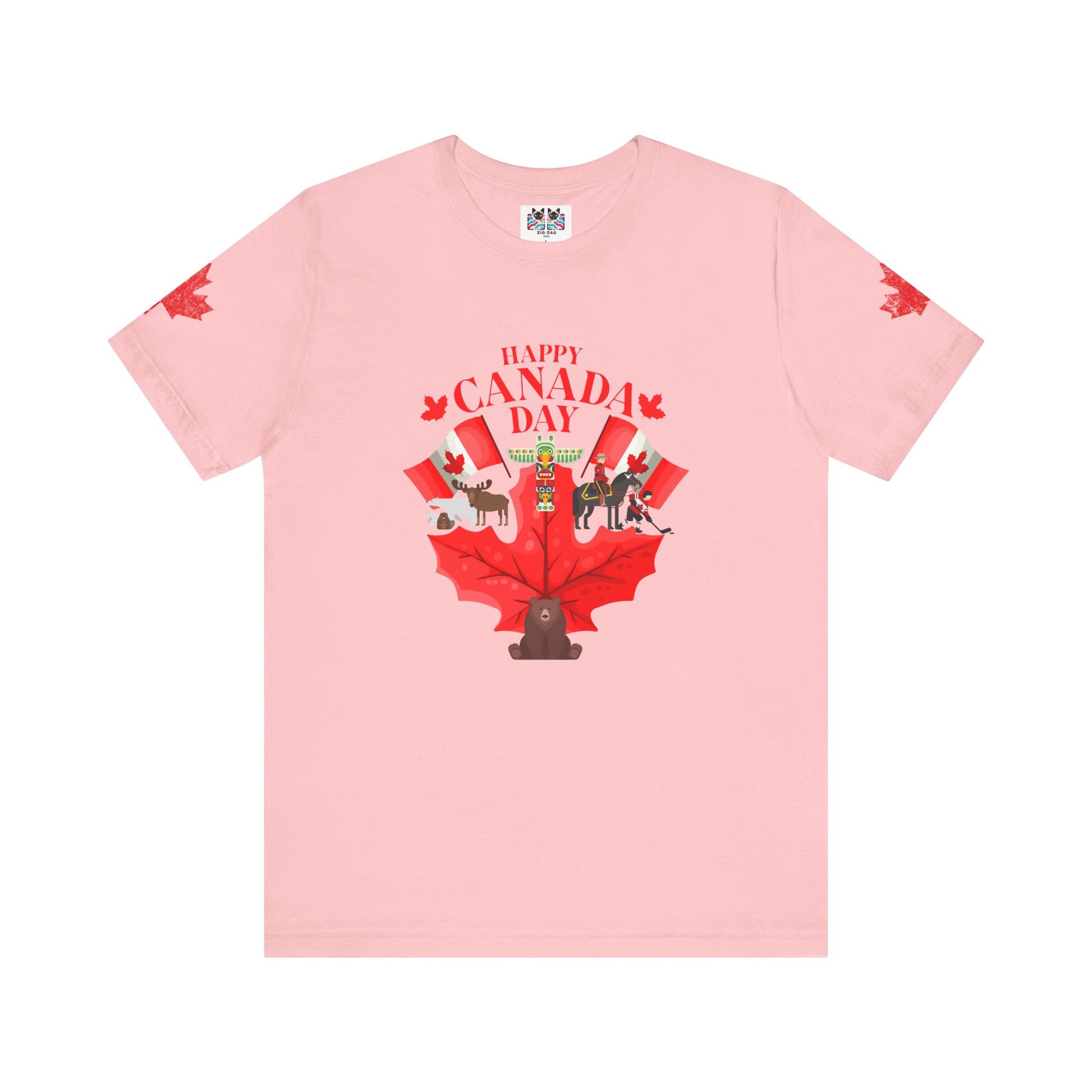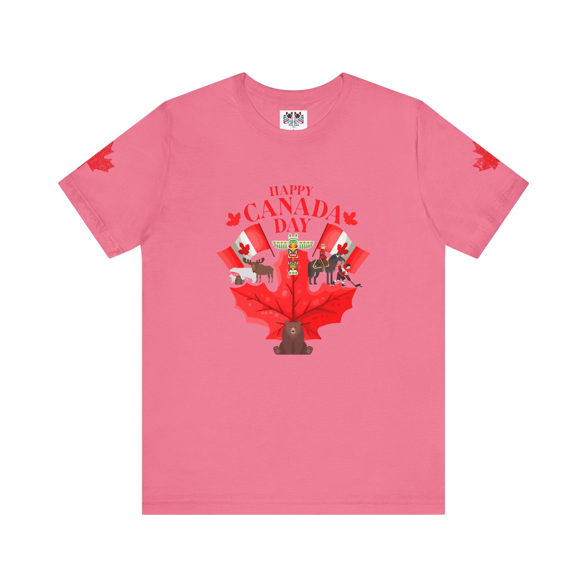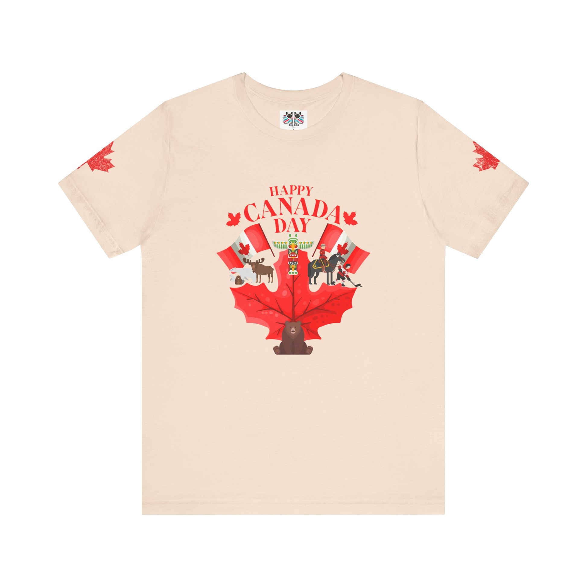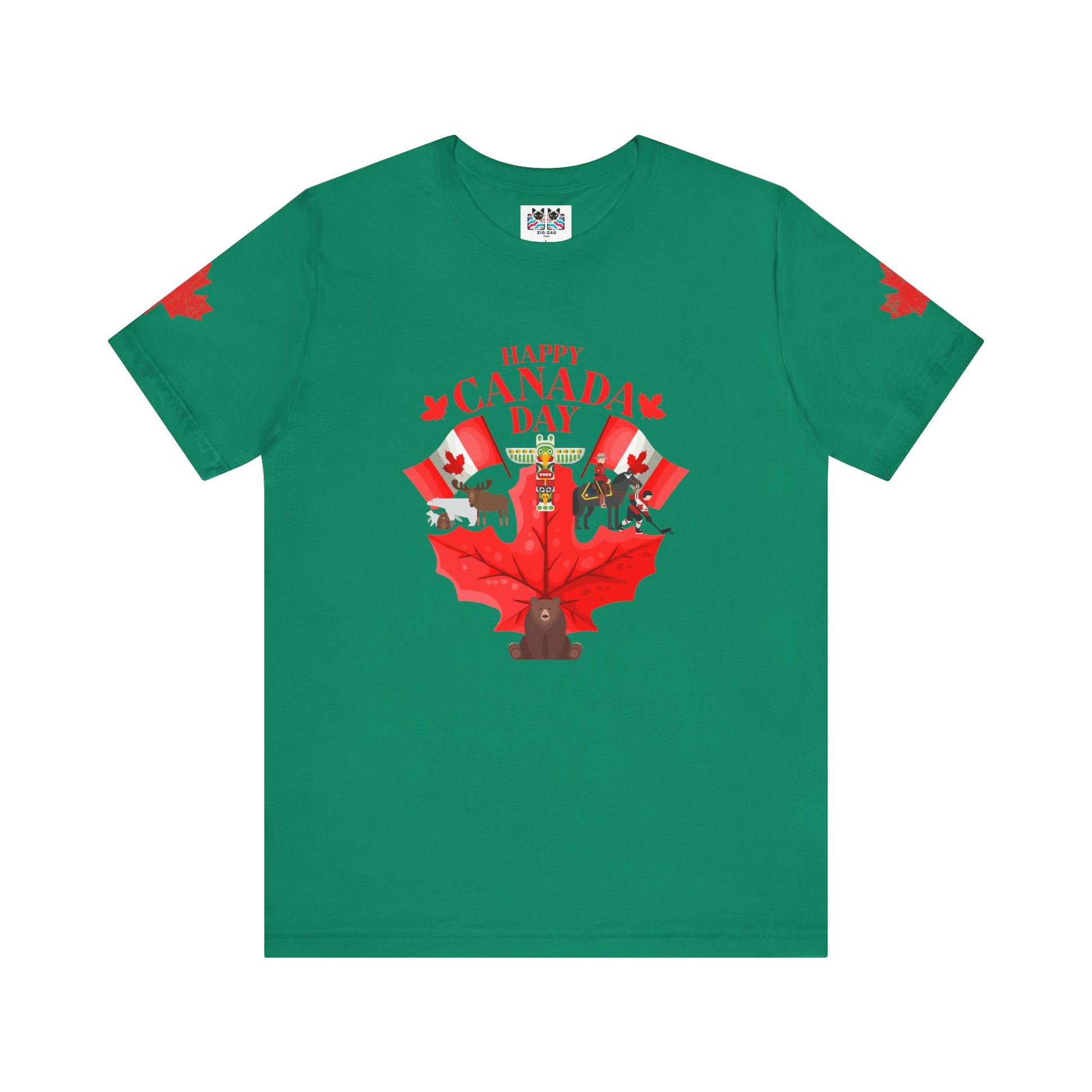 Celebrate Canada Day in vibrant style with this playful t-shirt featuring a large red maple leaf at the center, surrounded by festive Canadian icons. The graphic showcases fun designs, including patriotic animals (bear, moose), hockey, Mountie, maple flags, and Canada-themed balloons. "Happy Canada Day" is boldly printed at the top, creating a cheerful and spirited look. Maple leaf accents appear on both sleeves, making this tee perfect for family gatherings, parades, and anyone proud to show off their Canadian roots.