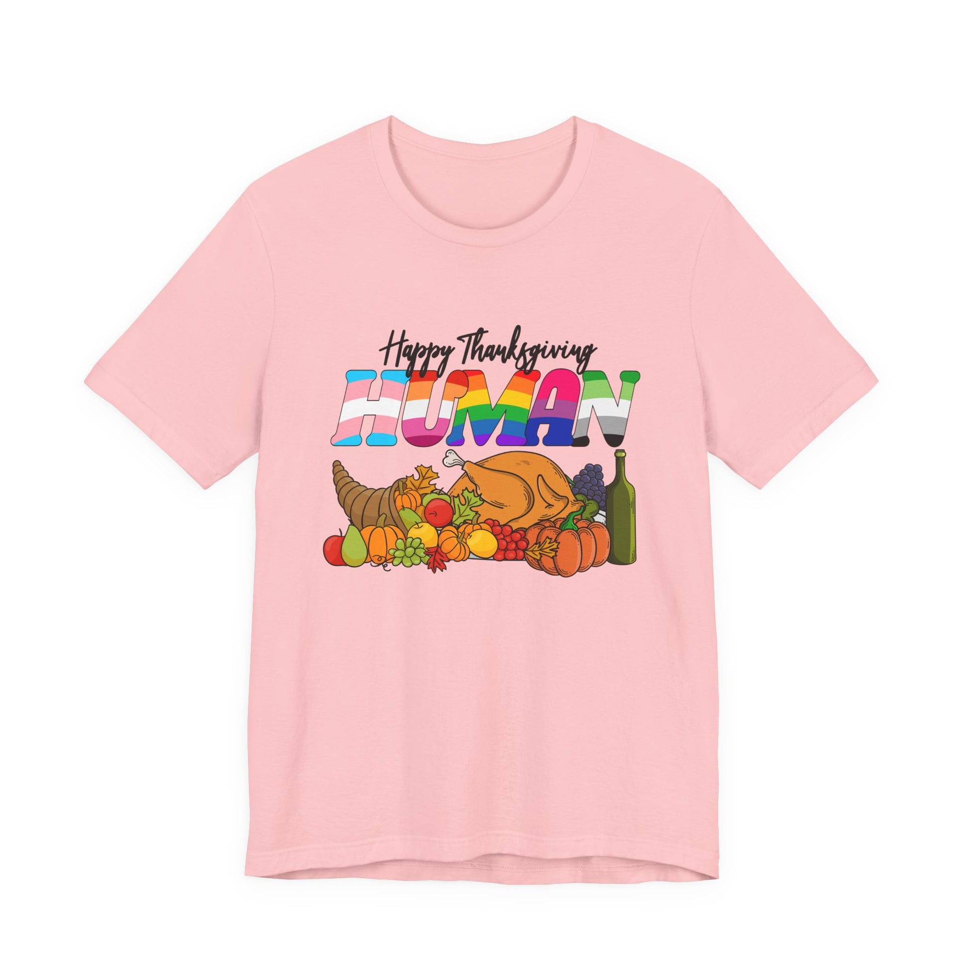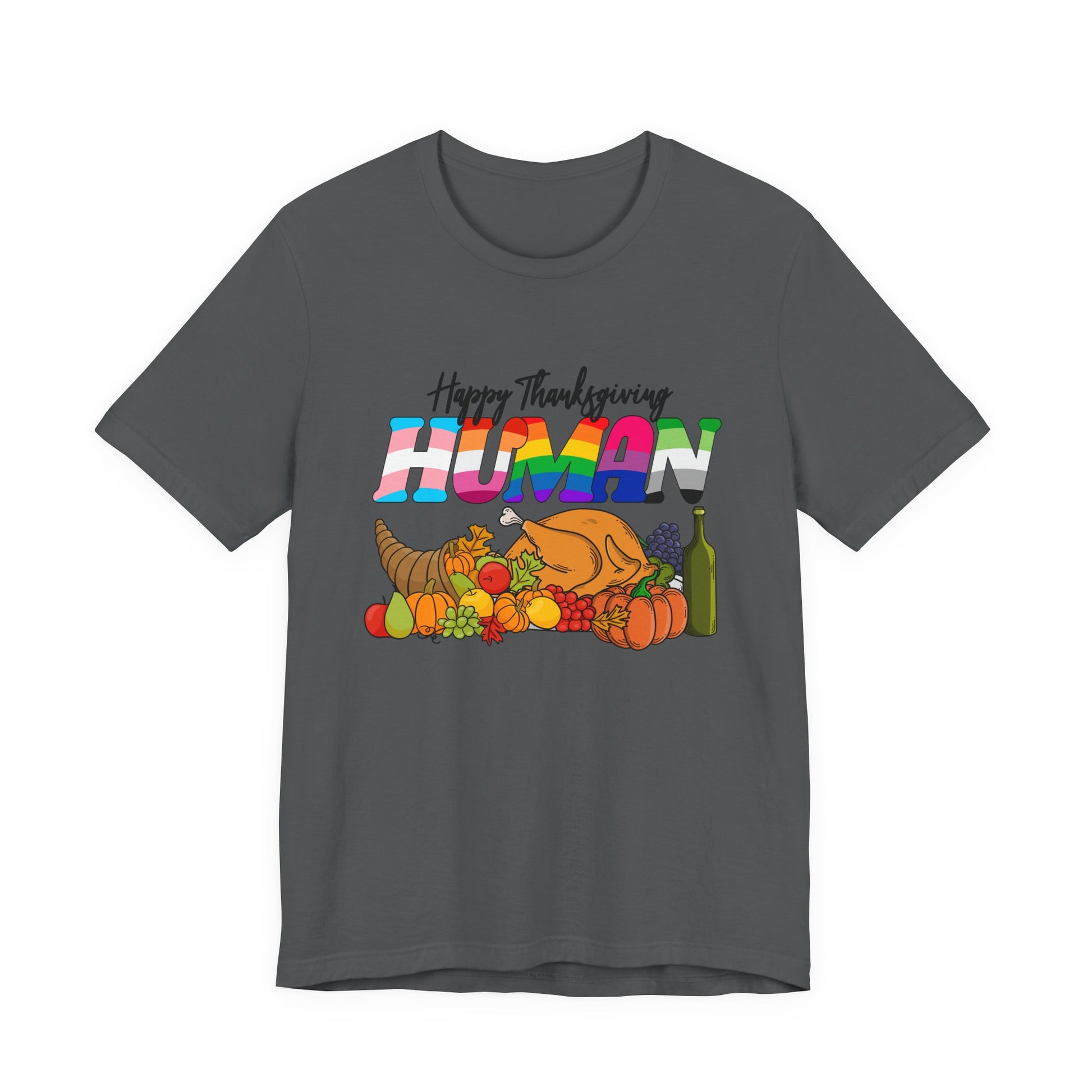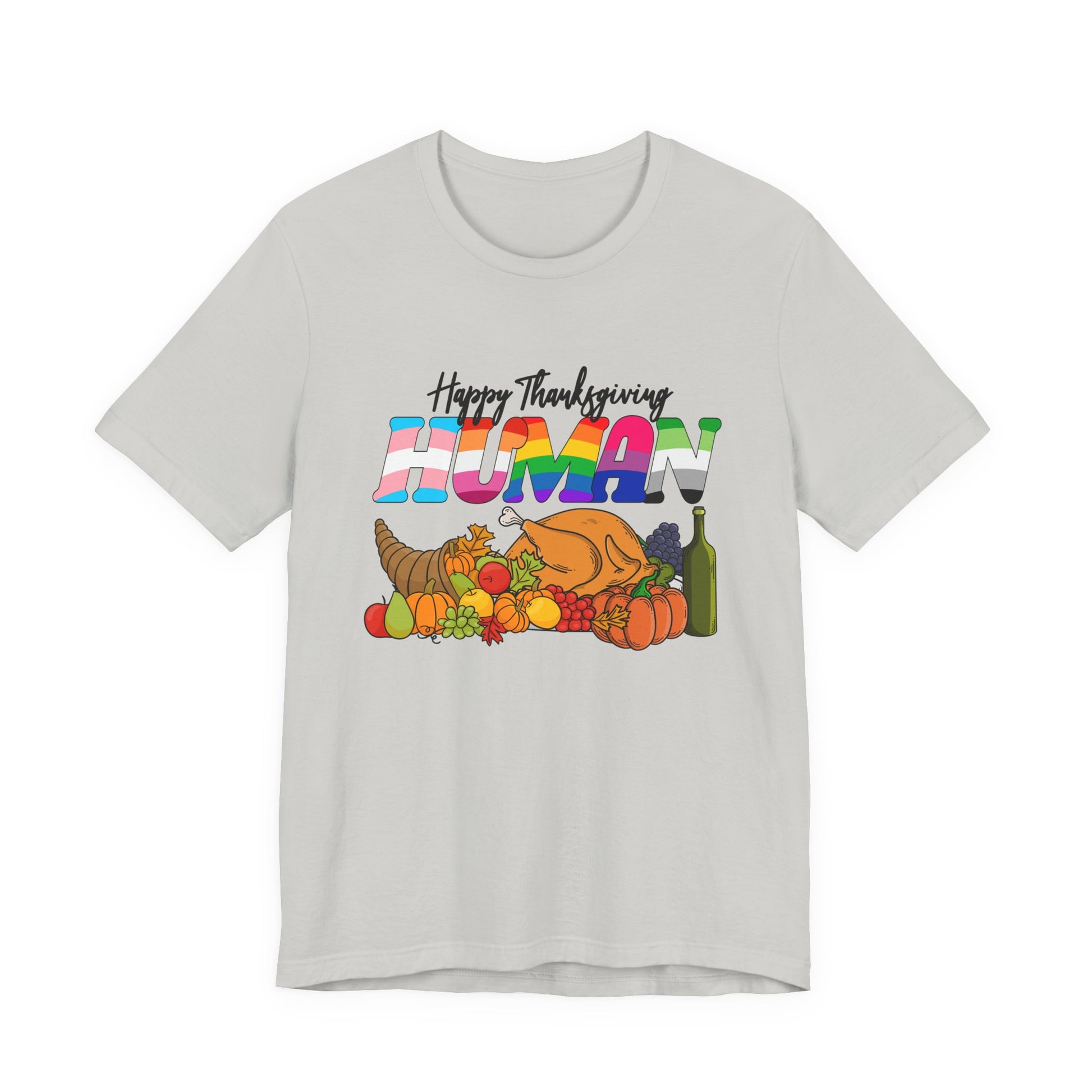 Add vibrant flair to your holiday look with this playful “Happy Thanksgiving Human” t-shirt featuring a festive table scene filled with food, fruits, drinks, and a turkey. The standout word “HUMAN” is printed in eye-catching gradient colors, giving the design a fun and modern twist. Perfect for family gatherings, Friendsgiving parties, or as a humorous gift, this soft and breathable tee mixes seasonal cheer with bold style for an unforgettable Thanksgiving outfit.