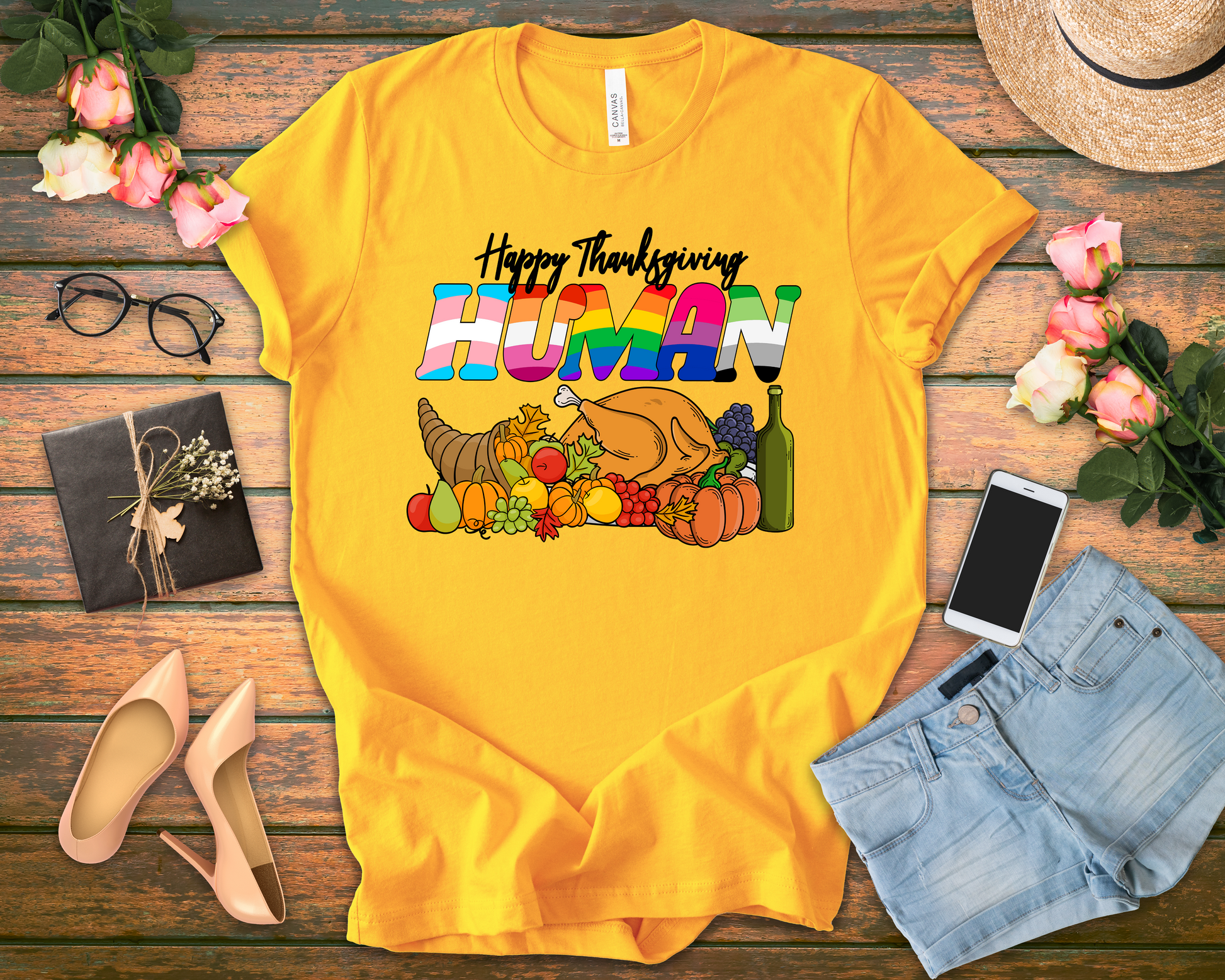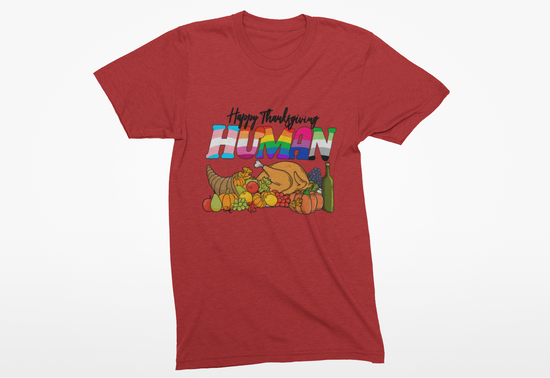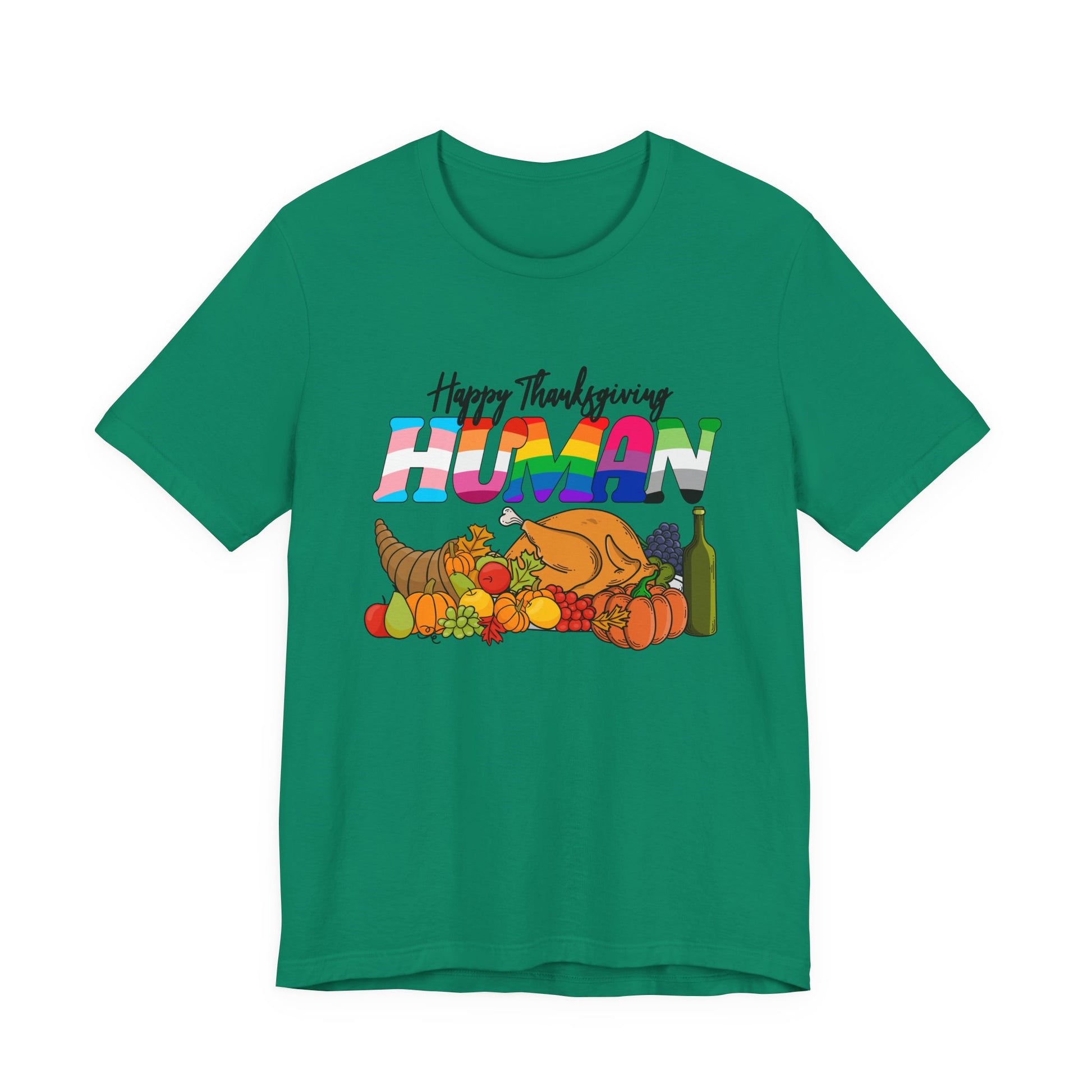 Add vibrant flair to your holiday look with this playful “Happy Thanksgiving Human” t-shirt featuring a festive table scene filled with food, fruits, drinks, and a turkey. The standout word “HUMAN” is printed in eye-catching gradient colors, giving the design a fun and modern twist. Perfect for family gatherings, Friendsgiving parties, or as a humorous gift, this soft and breathable tee mixes seasonal cheer with bold style for an unforgettable Thanksgiving outfit.