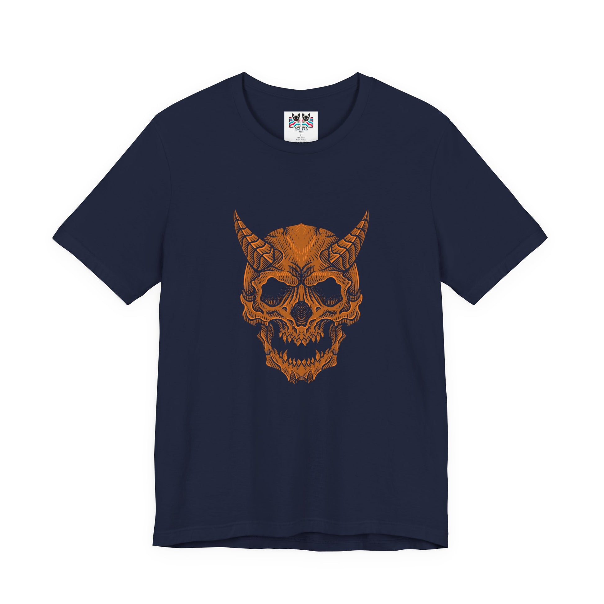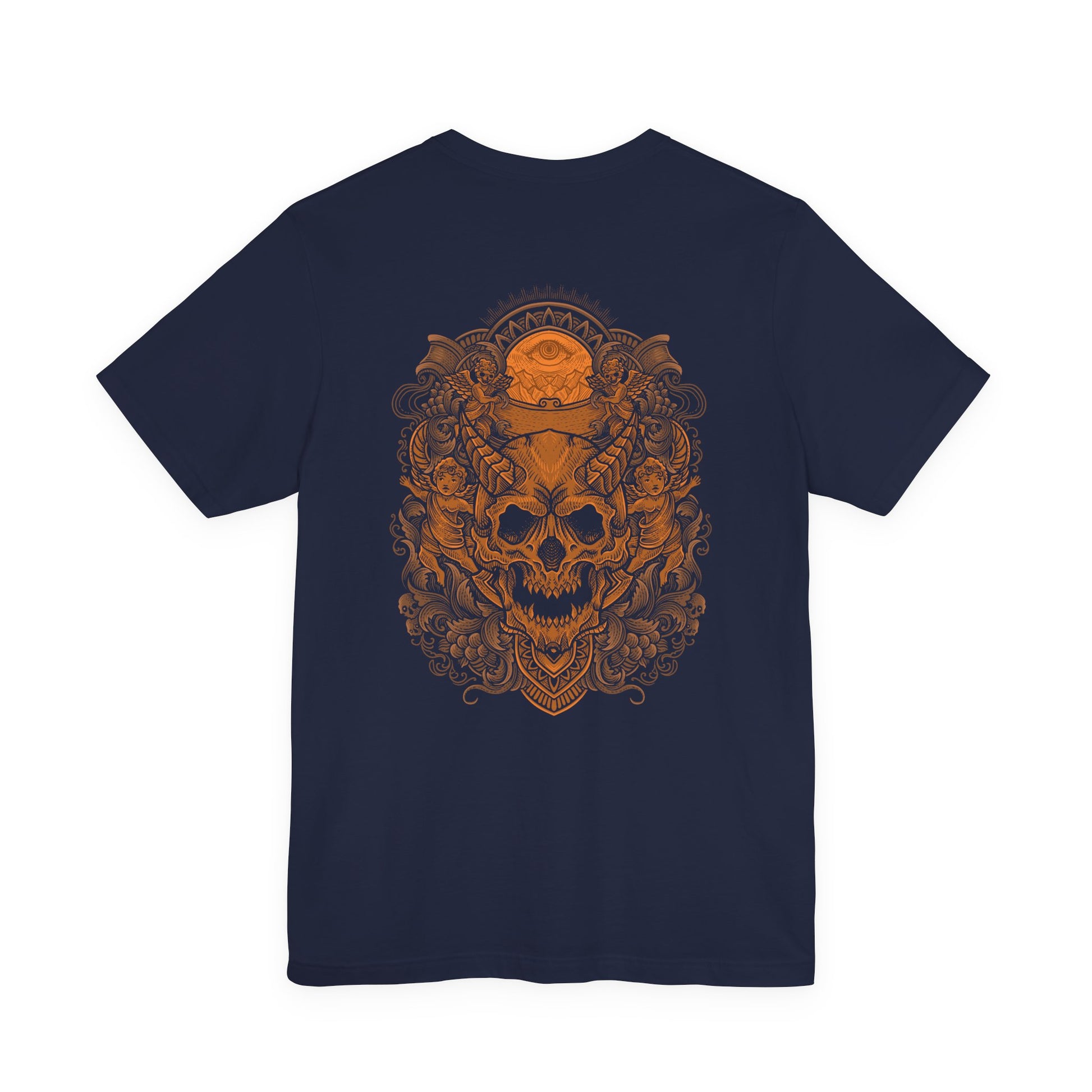 Bring infernal style to your wardrobe with this horned demon skull t-shirt featuring a bold orange skull with curved horns on the front for a clean yet menacing look. The back explodes into a highly detailed ornamental design with the same horned skull surrounded by swirling filigree, cherub-like figures, and an all-seeing eye for powerful occult vibes. Perfect for metalheads, goth fashion fans, bikers, and anyone who loves dark baroque artwork, this tee is ideal for concerts, festivals, or everyday alternative outfits.