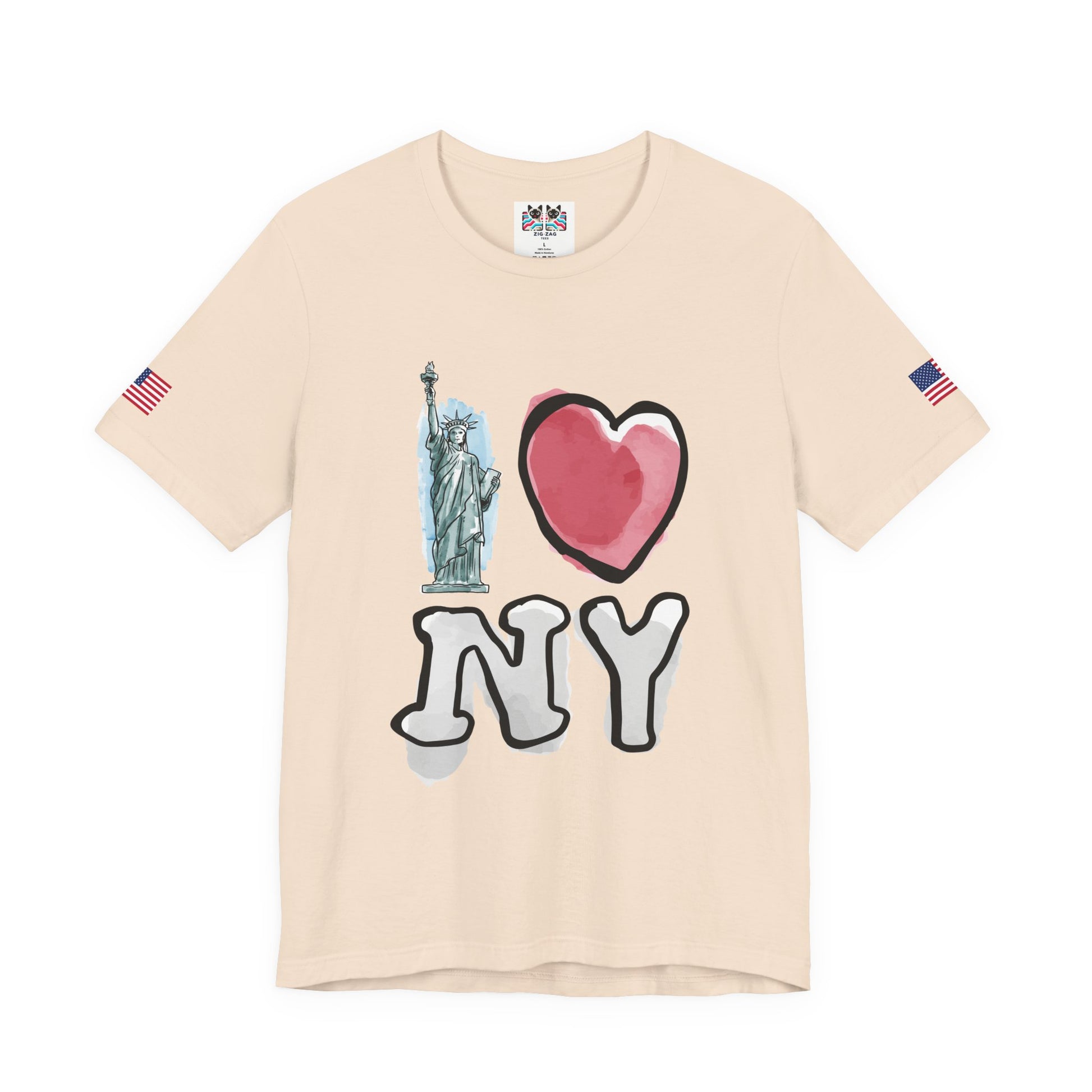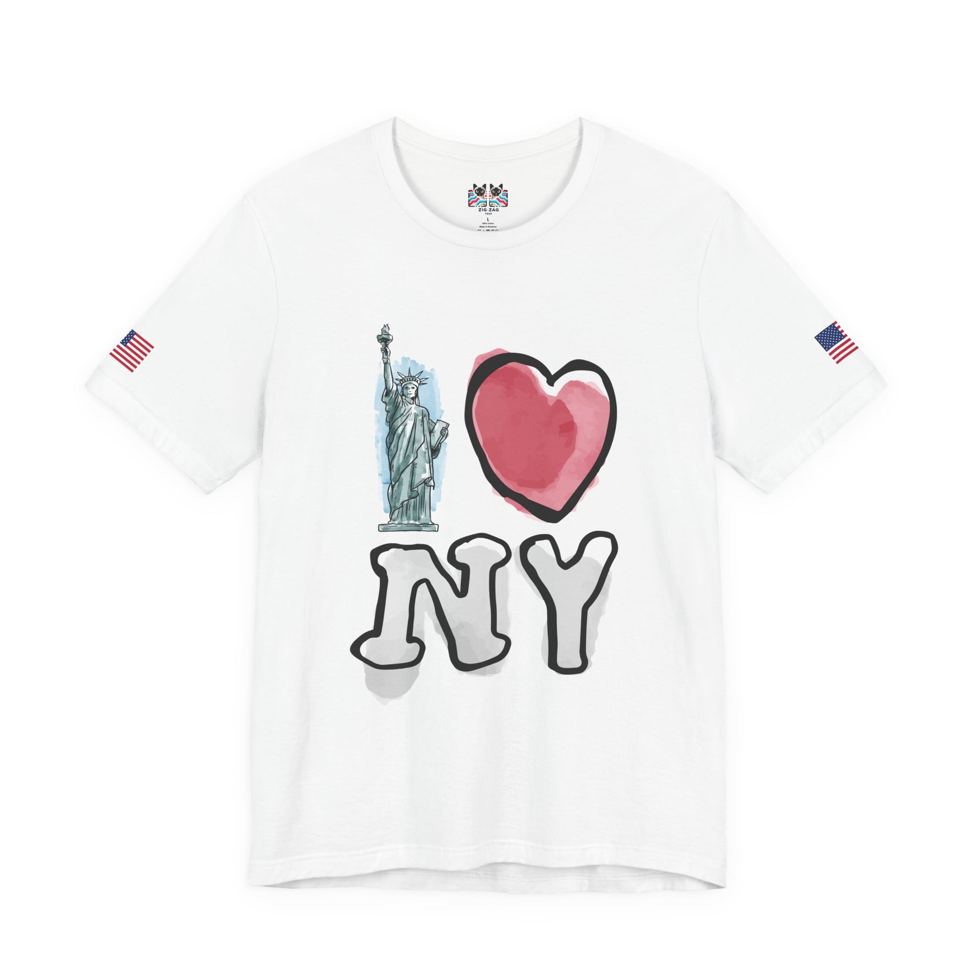 Express your love for New York with this artistic twist on the classic "I ❤ NY" design! This version features a beautifully illustrated Statue of Liberty in light blue/teal on the left, a large pink/coral watercolor heart in the middle, and "NY" in bold white letters outlined in black. The hand-drawn artistic style gives this iconic design a fresh, contemporary feel with softer colors and creative flair. Perfect for NYC romantics, art lovers, women who love New York, Valentine's Day in NYC, marriage proposals at the Statue of Liberty, or anyone who wants to show their NYC love in a more artistic, feminine way. This black t-shirt with American flag sleeve patches offers a modern take on the world's most famous city love symbol. Ideal for date nights in NYC, anniversary trips, or expressing heartfelt connection to the city. The artistic rendering makes it feel personal and special rather than just another tourist shirt.