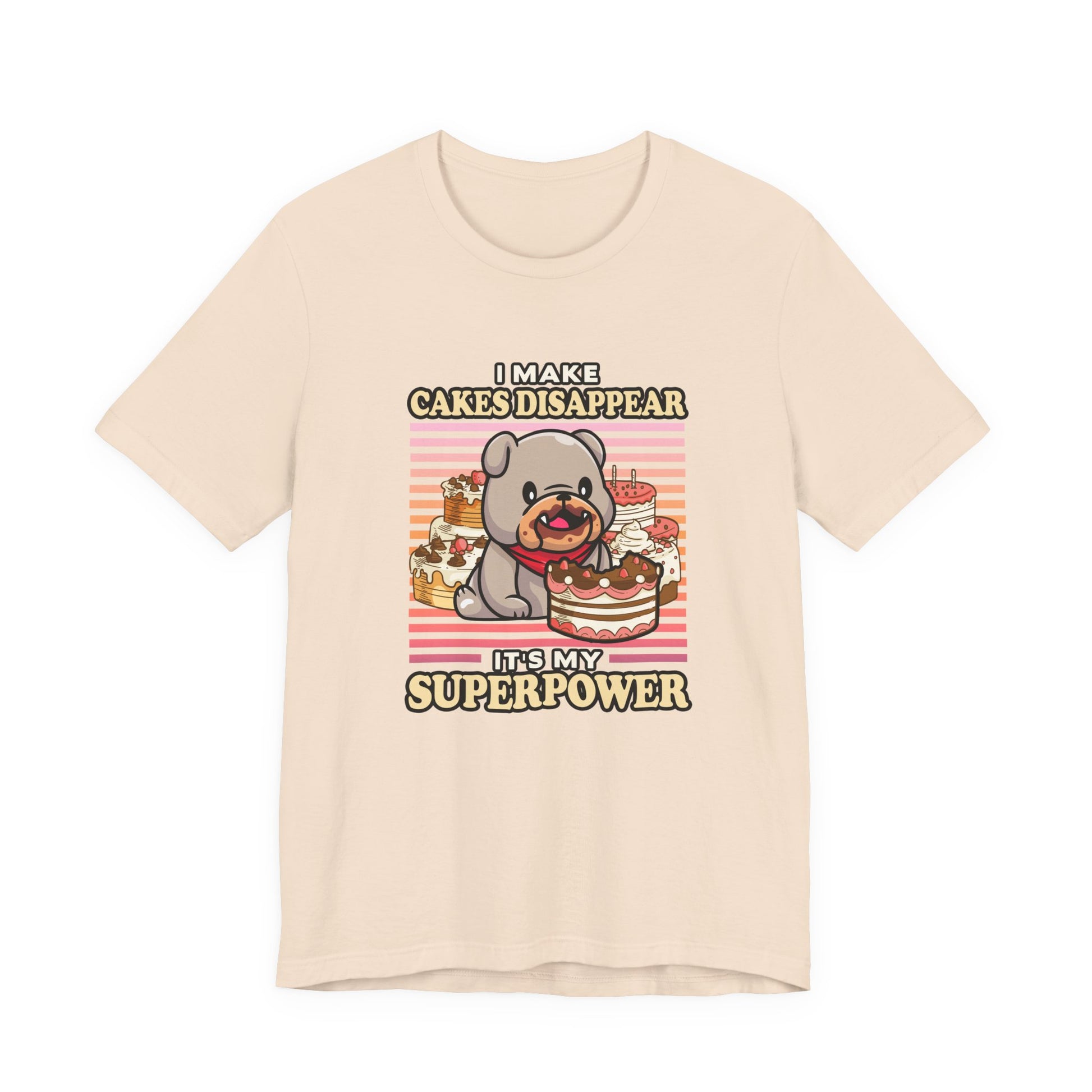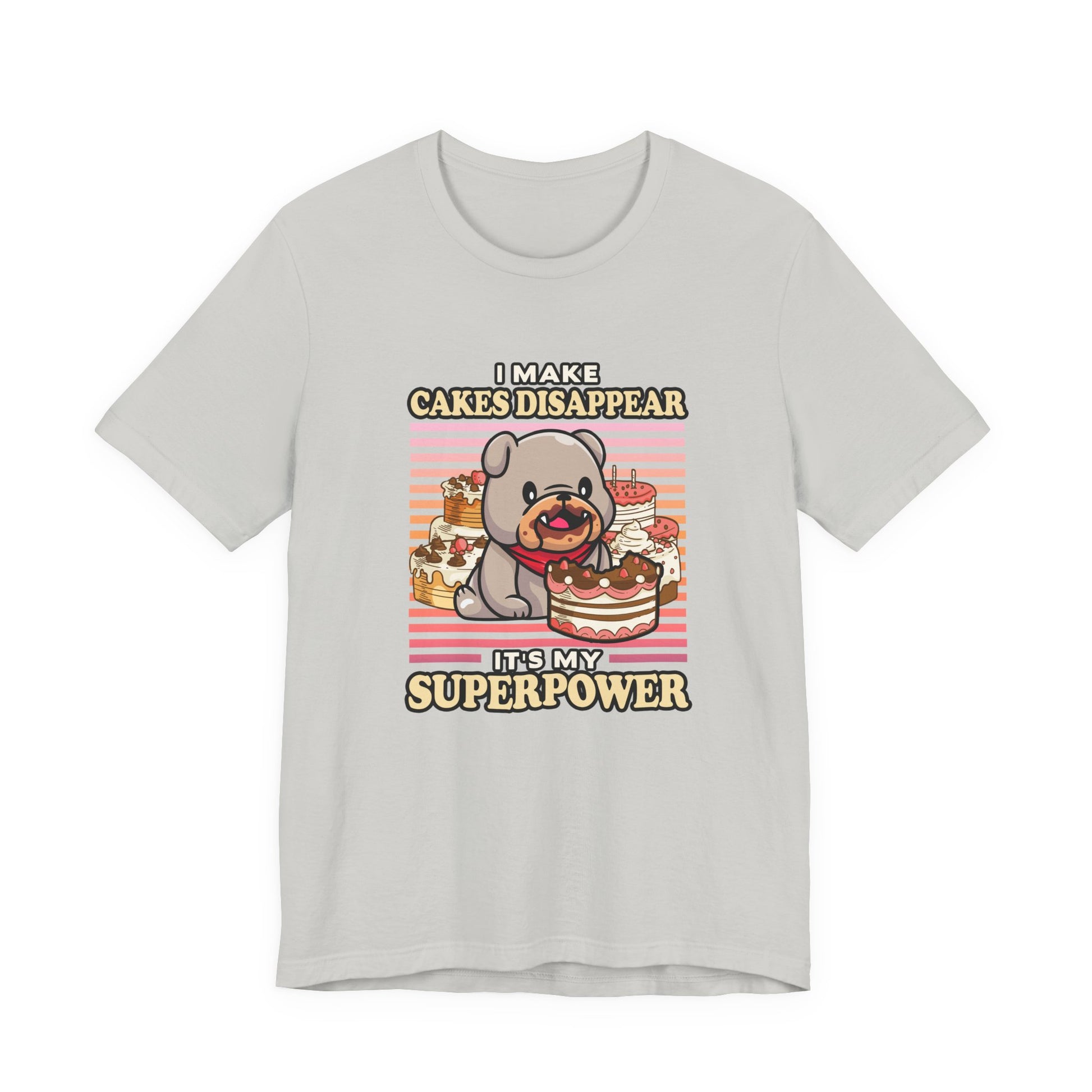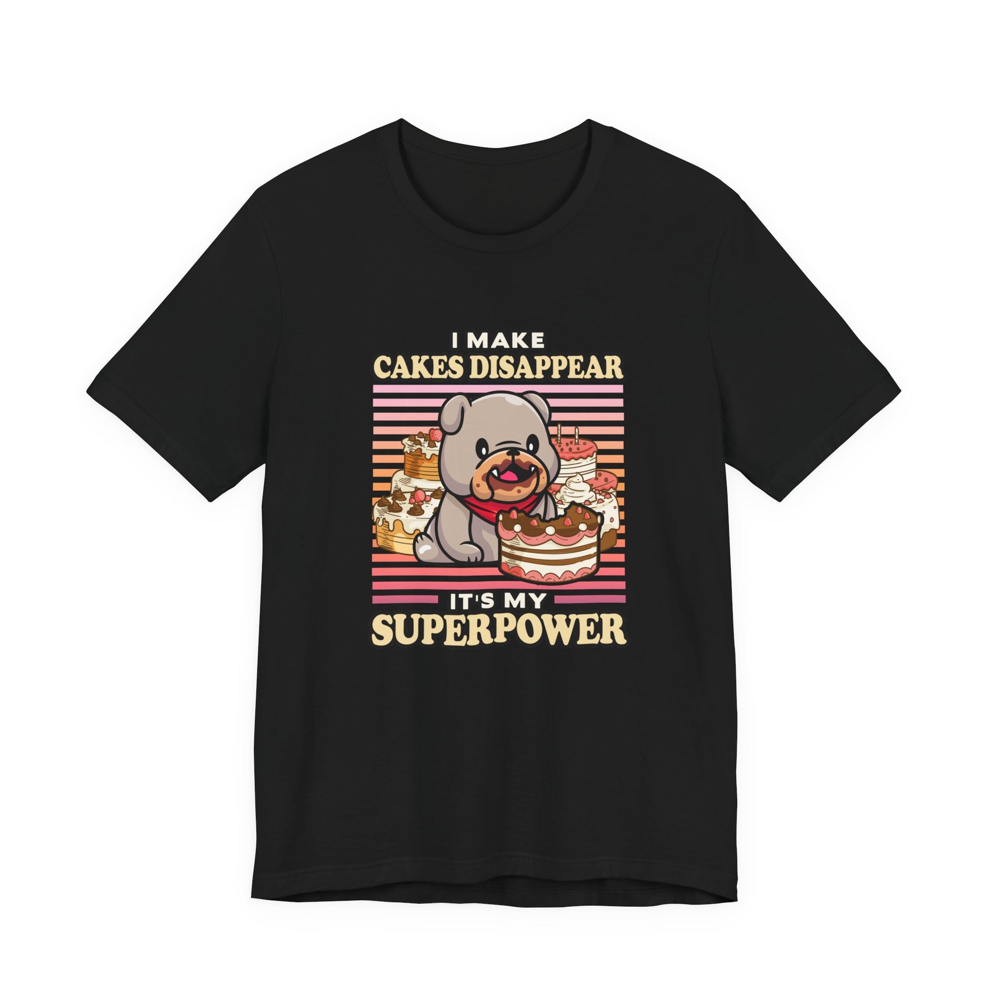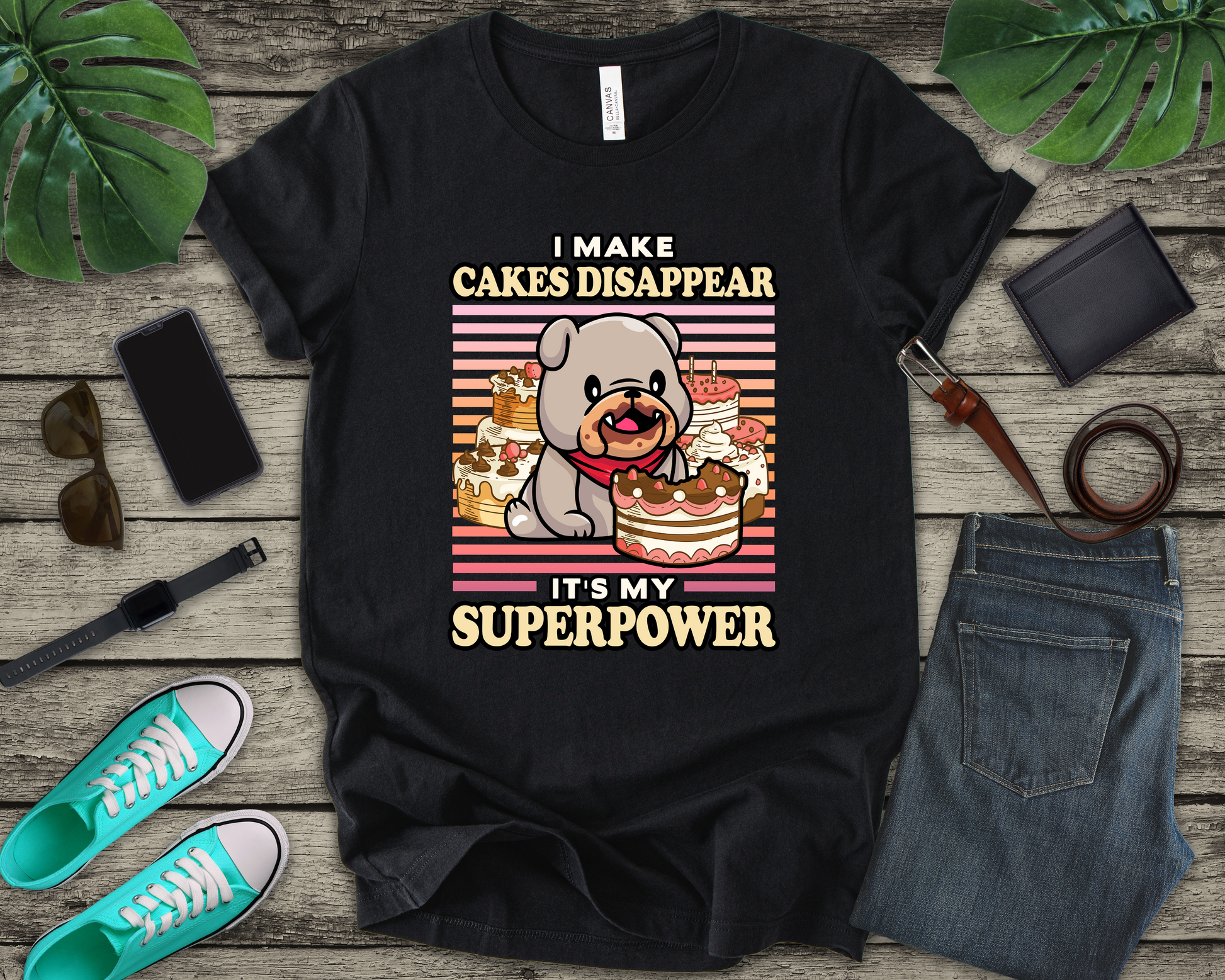 I Make Cakes Disappear T-Shirt – Cute Dog With Cakes Funny Super Power Graphic Tee