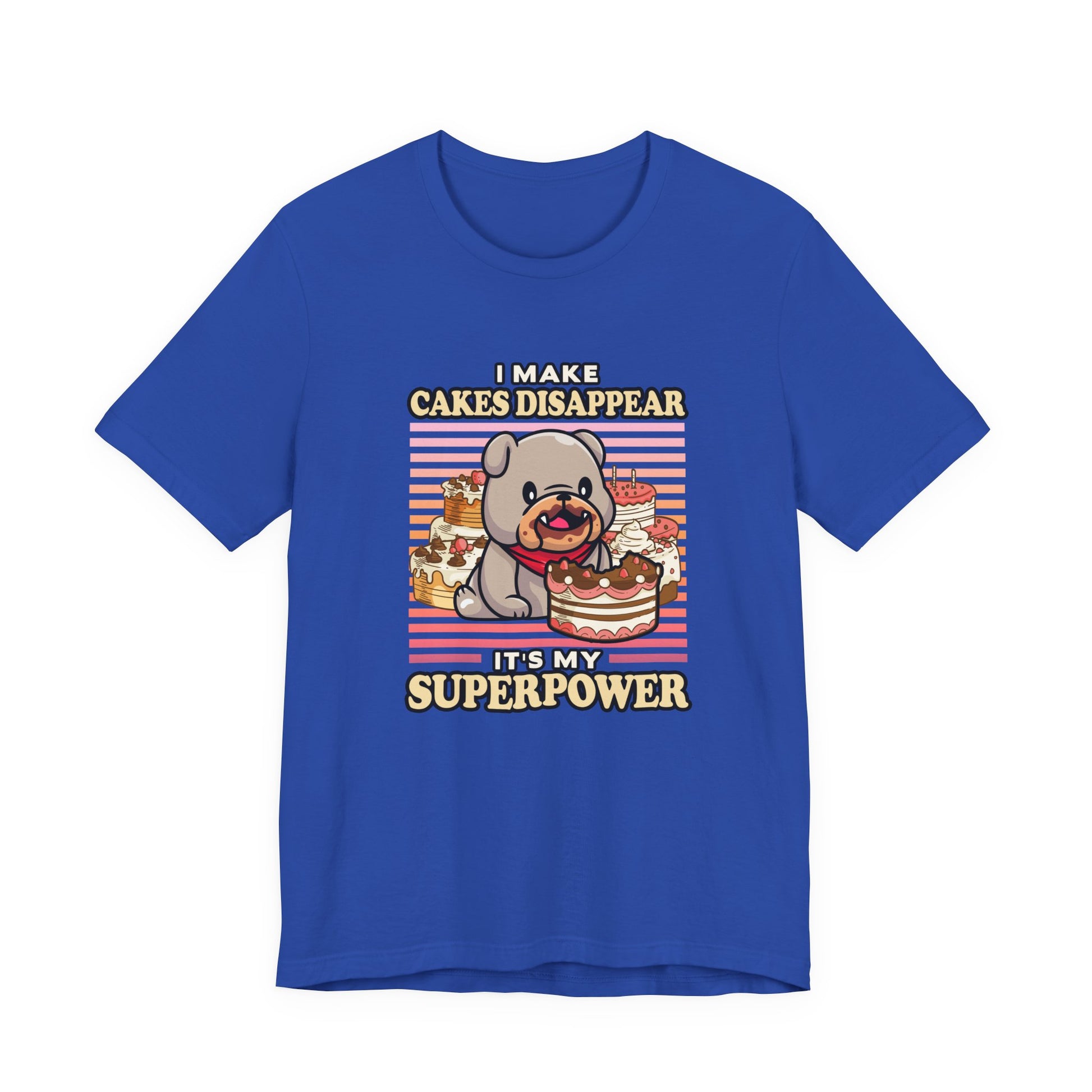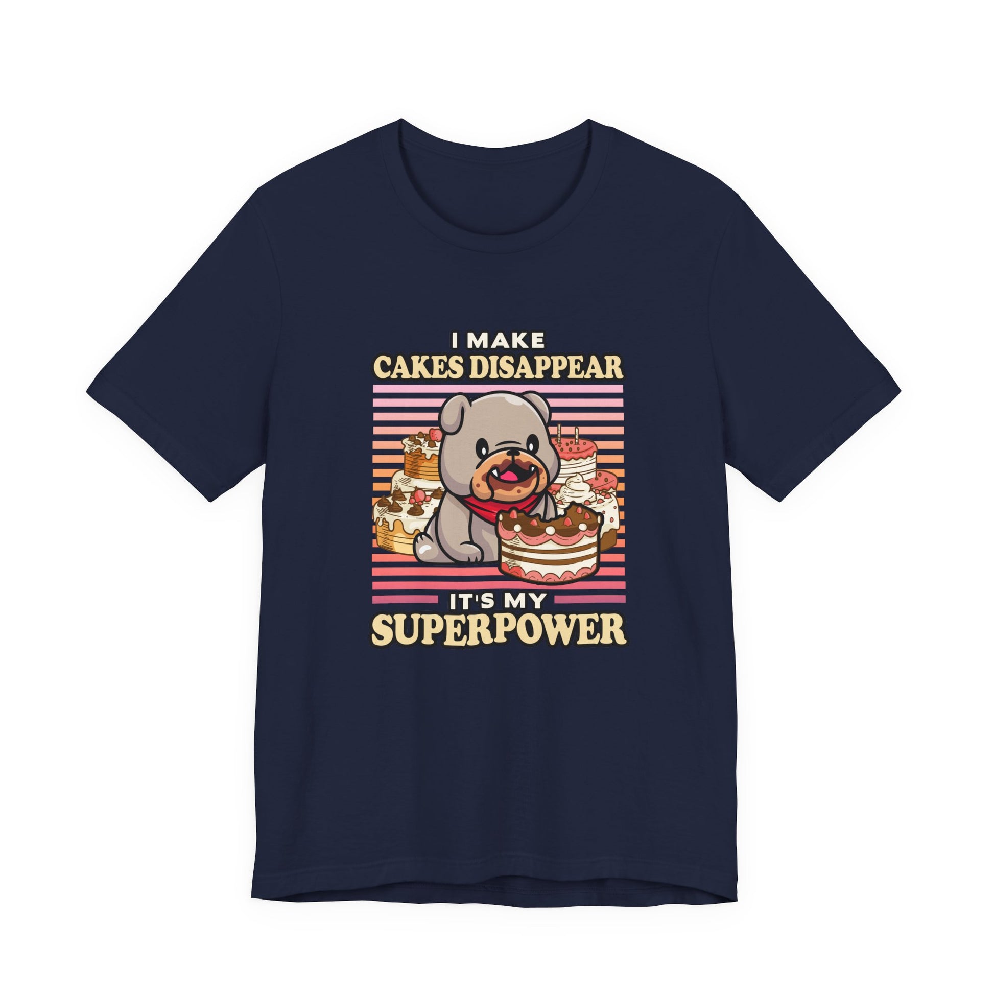 Celebrate your love for cake and playful humor with this adorable T-shirt! Featuring a happy dog surrounded by cakes with some on his face, paired with the cheeky phrase, “I make Cakes Disappear, It's my Super Power.” Perfect for dog lovers, dessert fans, and anyone who loves to enjoy life with a sense of fun. A great casual wear option or a quirky gift for friends who appreciate sweet treats and good vibes.