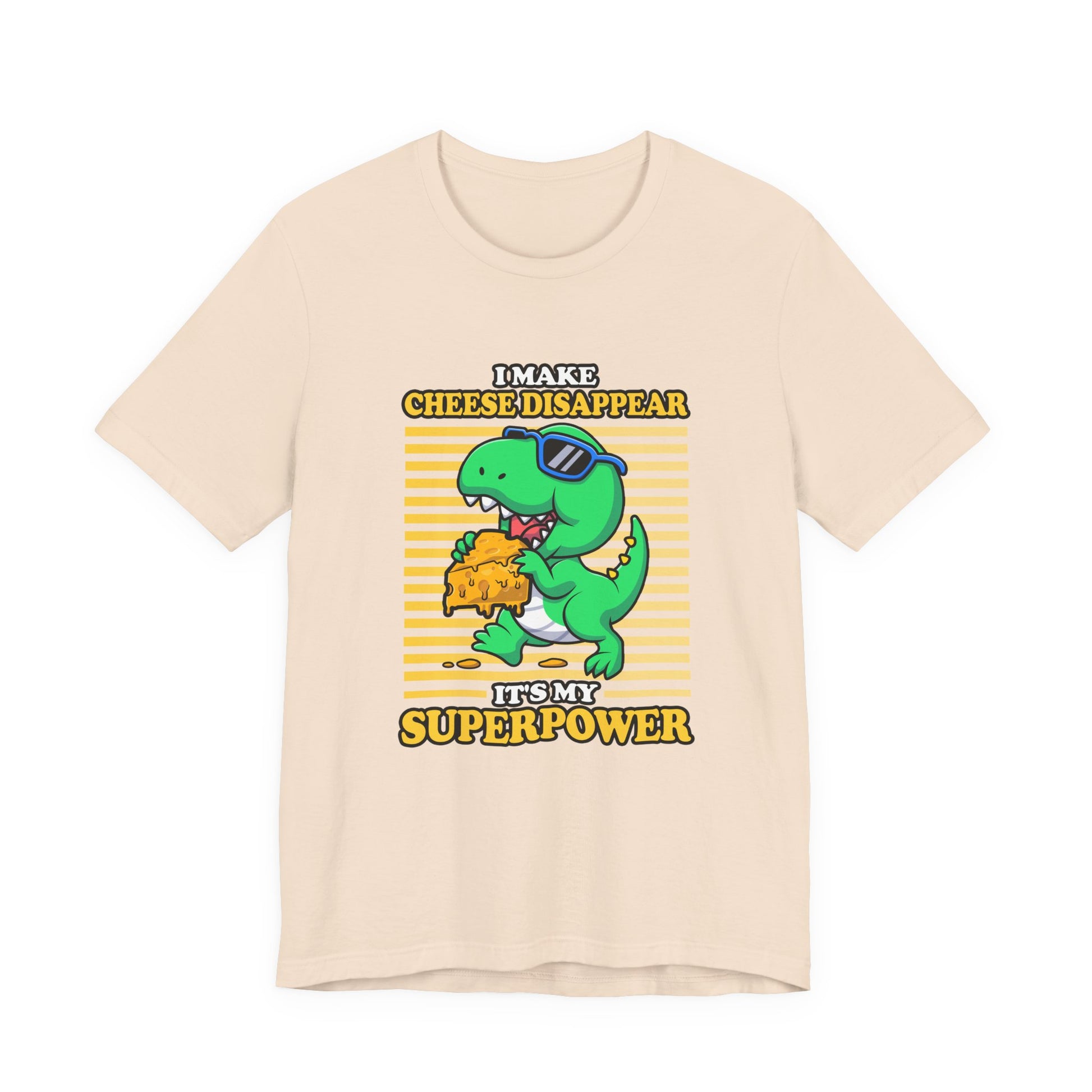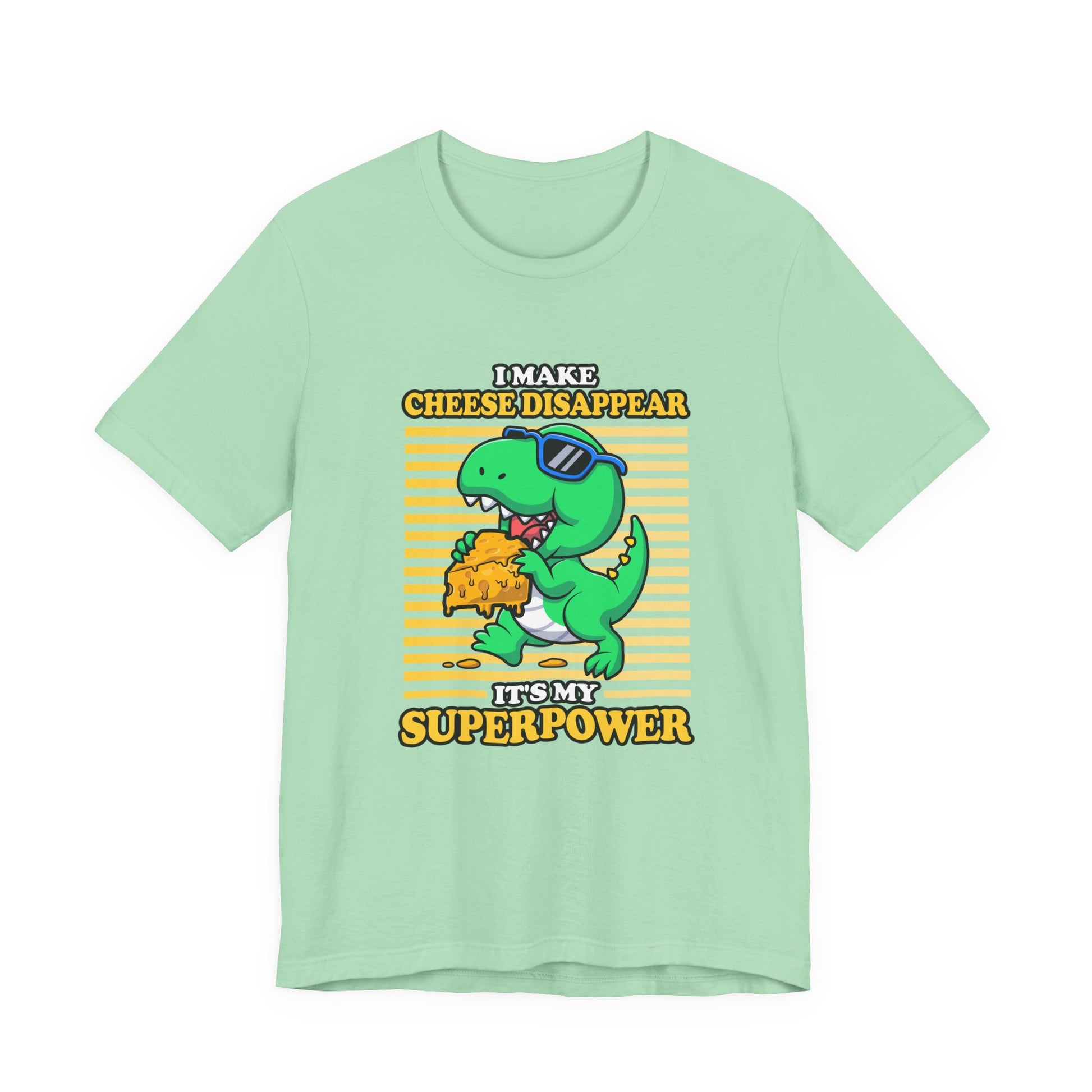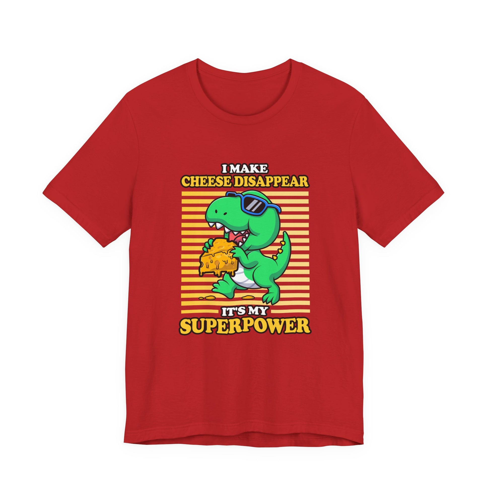 Show off your playful side with this dynamic T-shirt featuring a cool dinosaur wearing sunglasses running away with a big piece of cheese. Paired with the cheeky phrase, “I make Cheese Disappear, It's my Super Power,” this design blends humor and prehistoric fun. Perfect for cheese lovers, dino fans, and anyone who enjoys bold, quirky statements. A great choice for casual wear or a unique gift for friends and family.