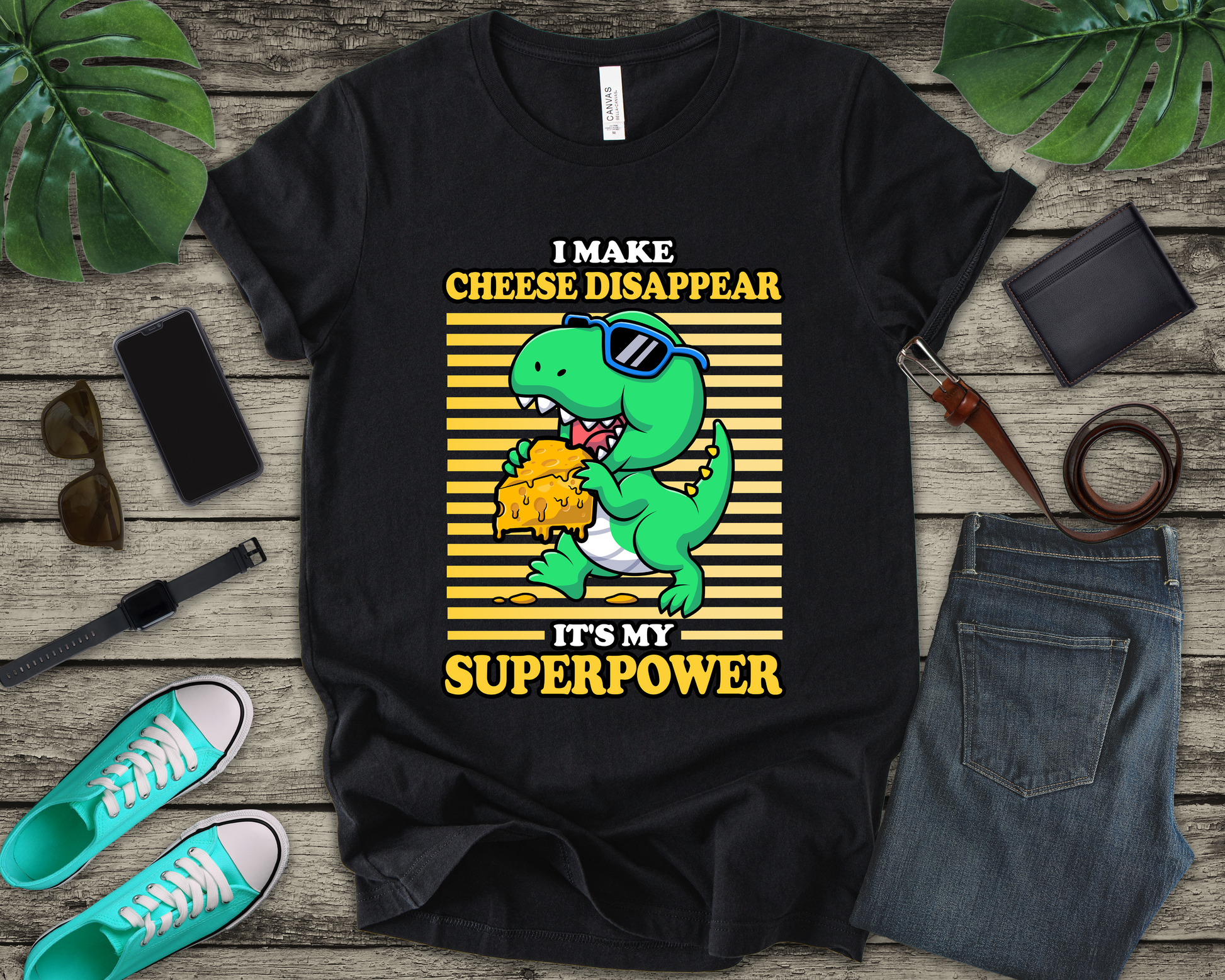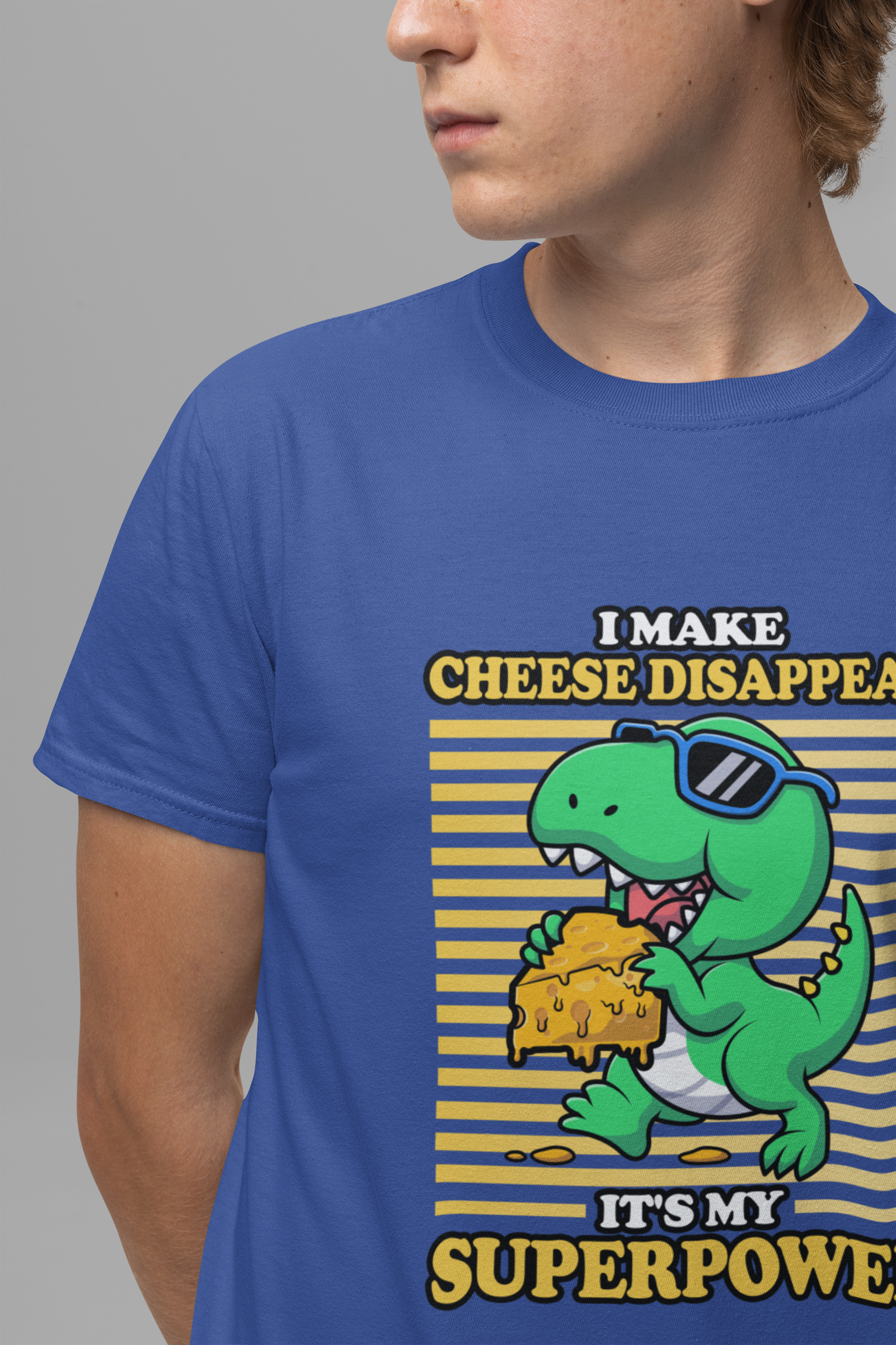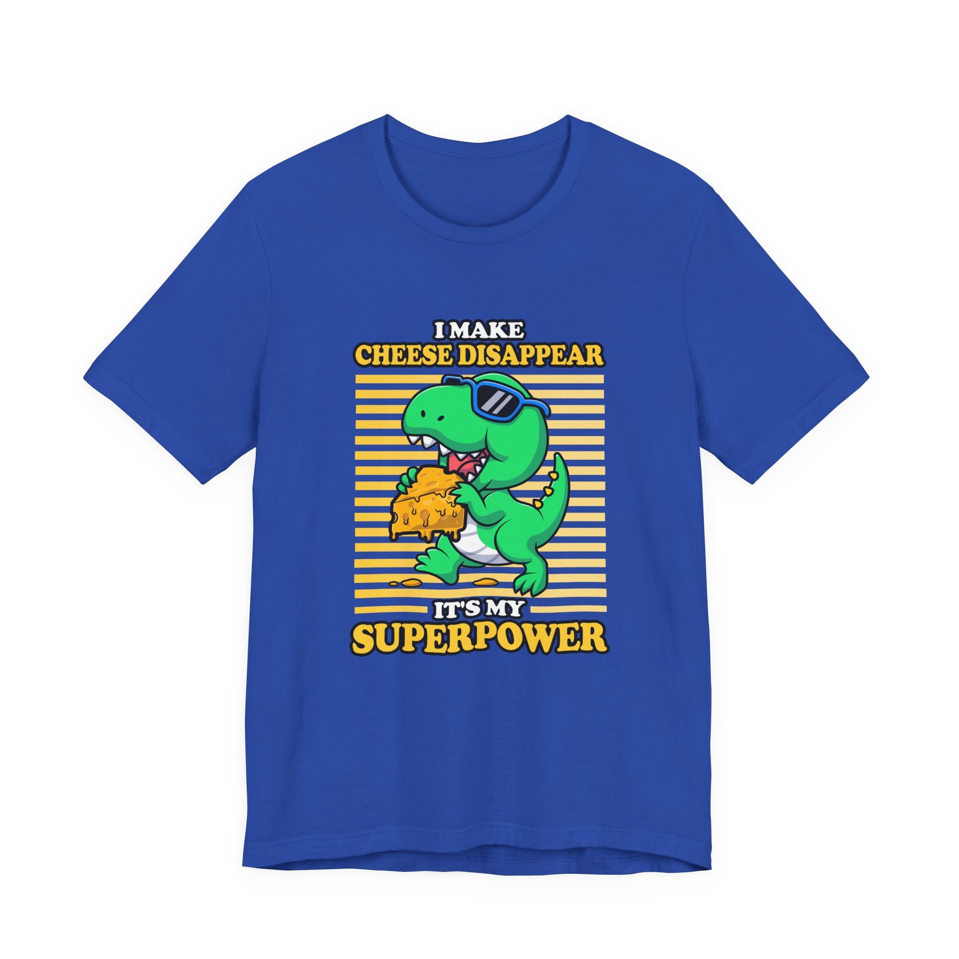 Show off your playful side with this dynamic T-shirt featuring a cool dinosaur wearing sunglasses running away with a big piece of cheese. Paired with the cheeky phrase, “I make Cheese Disappear, It's my Super Power,” this design blends humor and prehistoric fun. Perfect for cheese lovers, dino fans, and anyone who enjoys bold, quirky statements. A great choice for casual wear or a unique gift for friends and family.