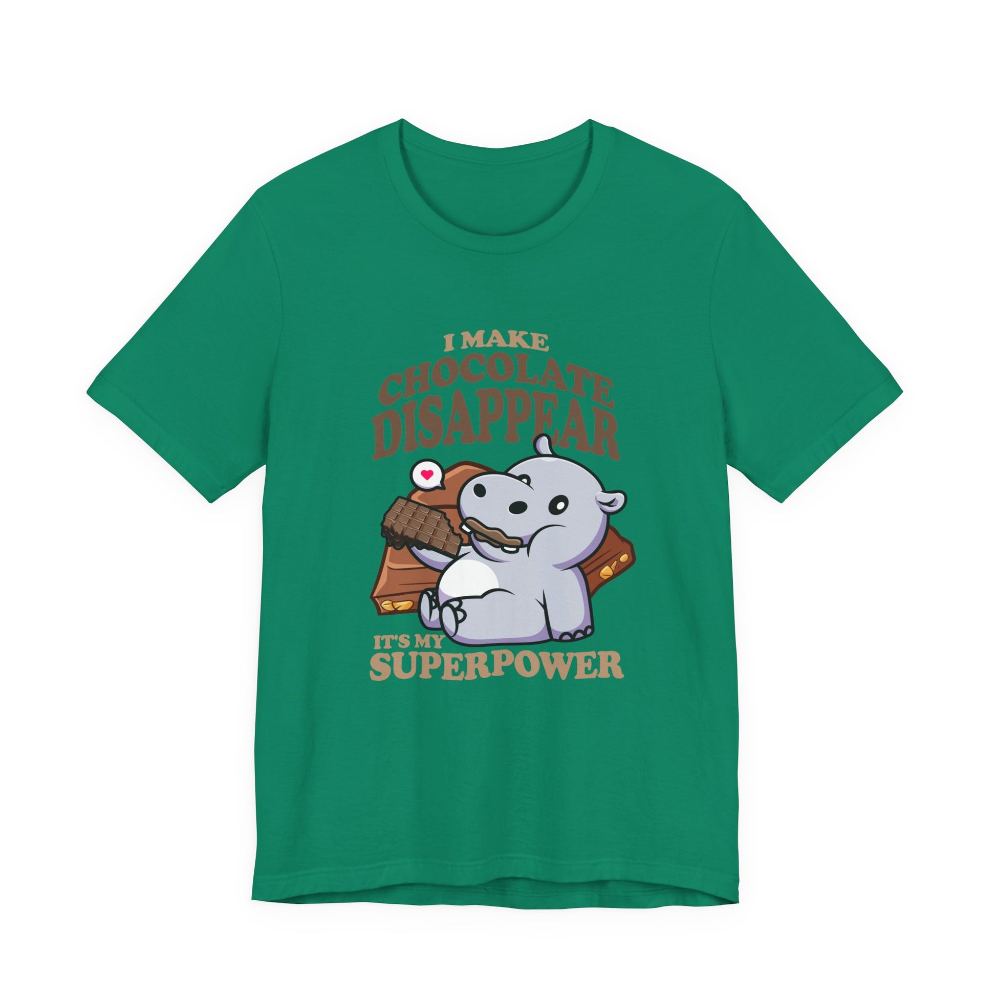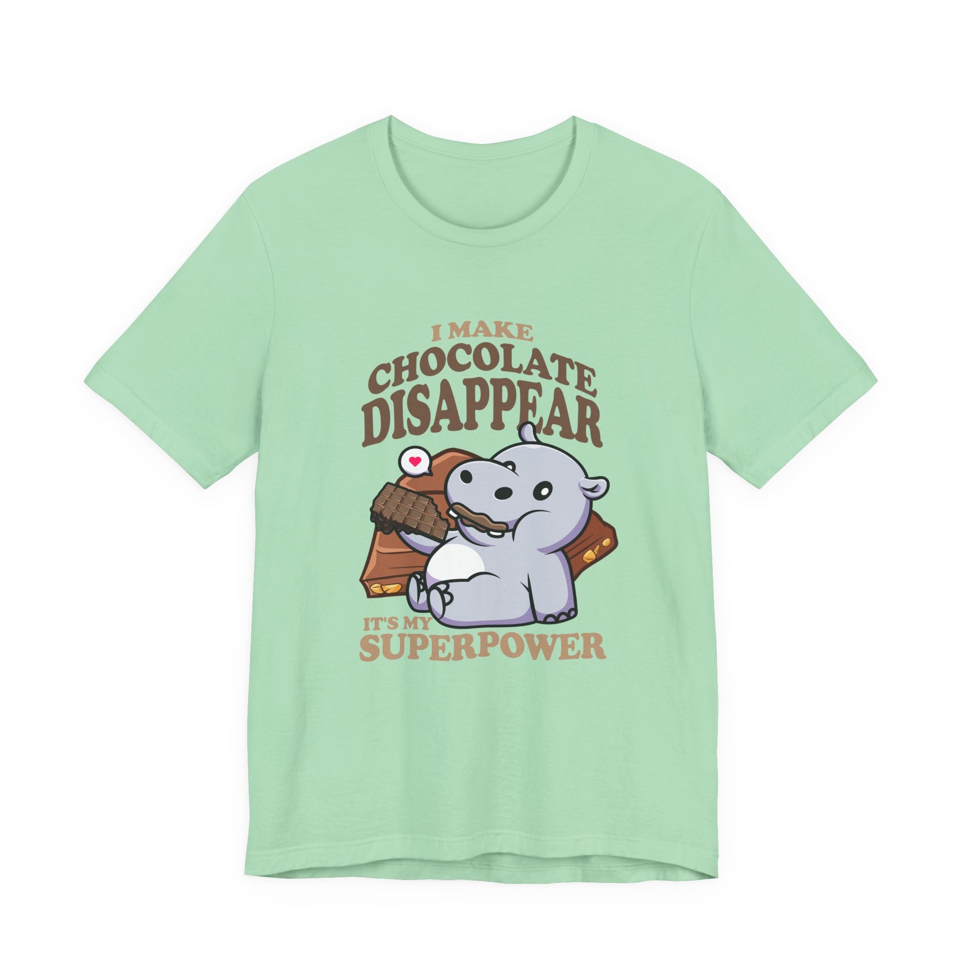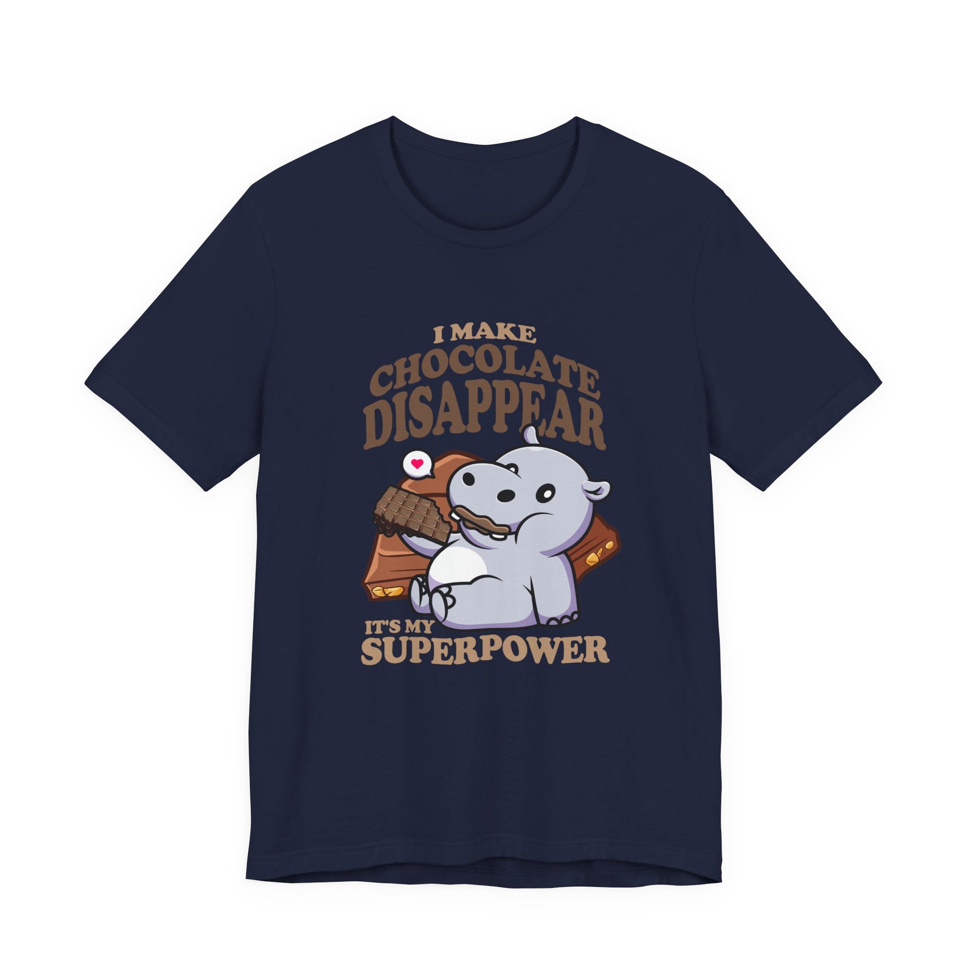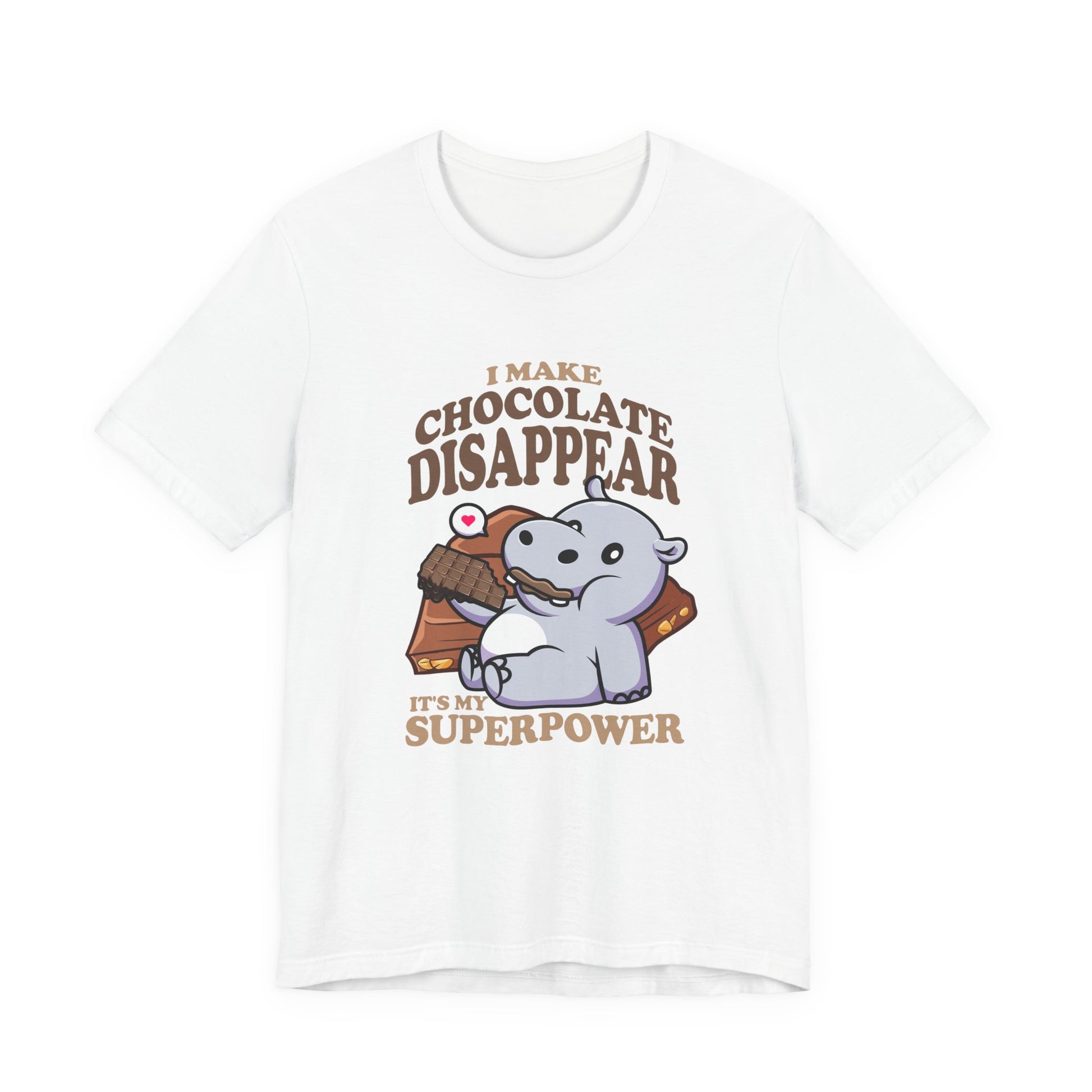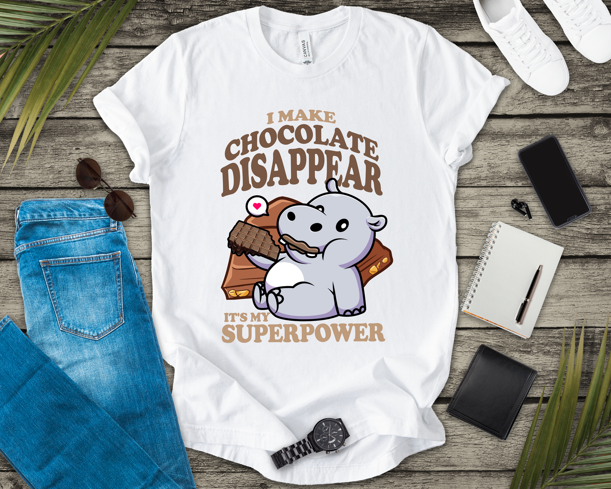 Celebrate your love for chocolate and playful animals with this adorable T-shirt! Featuring a lovable baby rhino surrounded by chocolate with some on his face, this design pairs cute animal charm with the cheeky phrase, “I make Chocolate Disappear, It's my Super Power.” Perfect for chocolate fans, rhino lovers, and anyone who enjoys a fun, sweet statement. A great casual shirt or quirky gift to brighten any wardrobe.