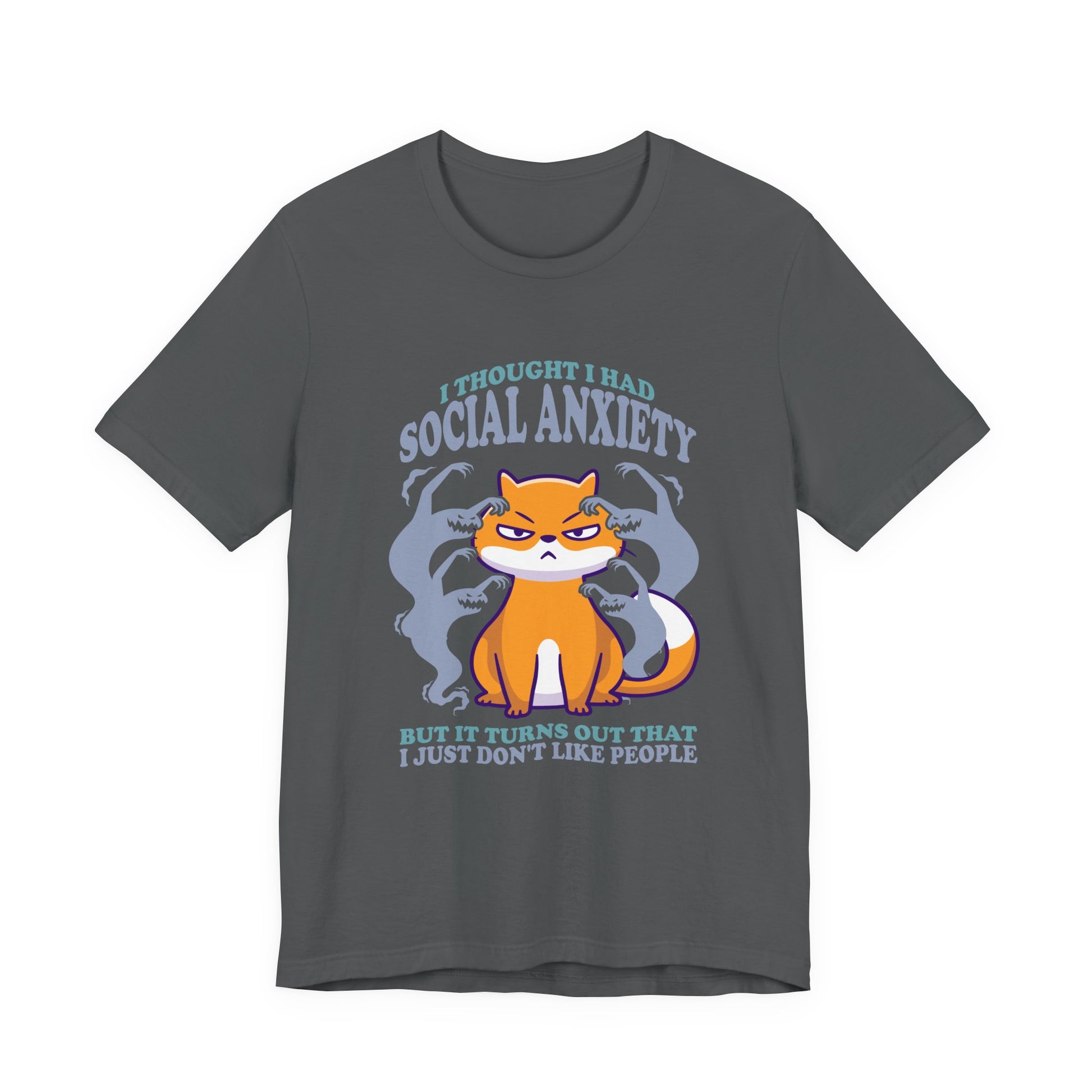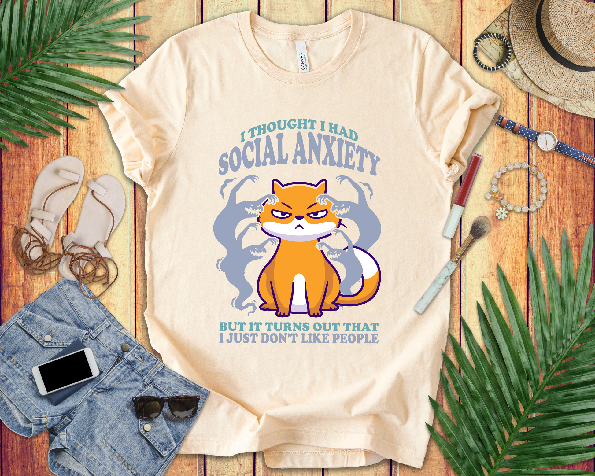 Express your true mood with this eye-catching T-shirt! The design shows a frustrated cat sitting with ghost-cats swirling around, as it stares straight ahead—paired with the honest and humorous text: “I Thought I Had Social Anxiety, But It Turns Out That I Just Don't Like People.” Perfect for introverts, cat fans, and anyone who appreciates quirky, real-talk humor. Makes a great gift for those who'd rather be alone with their thoughts and their cats.