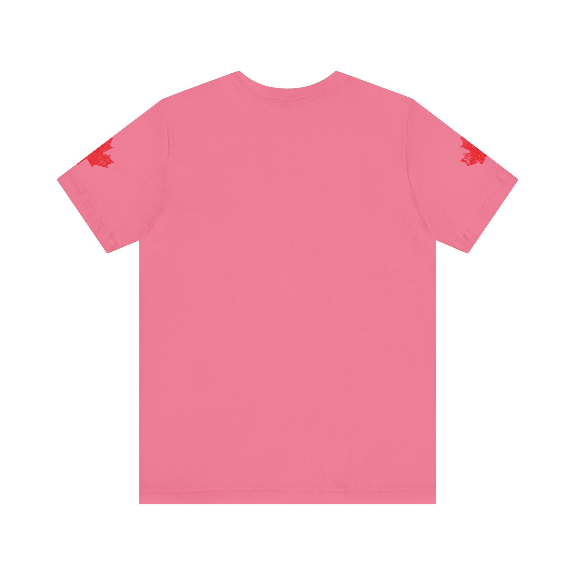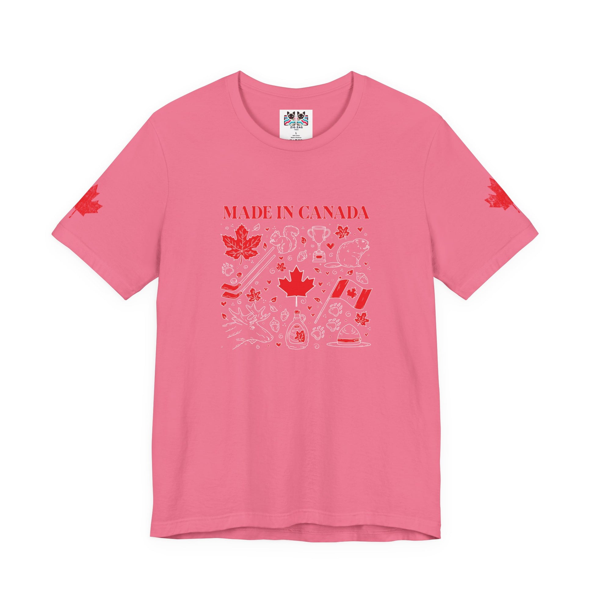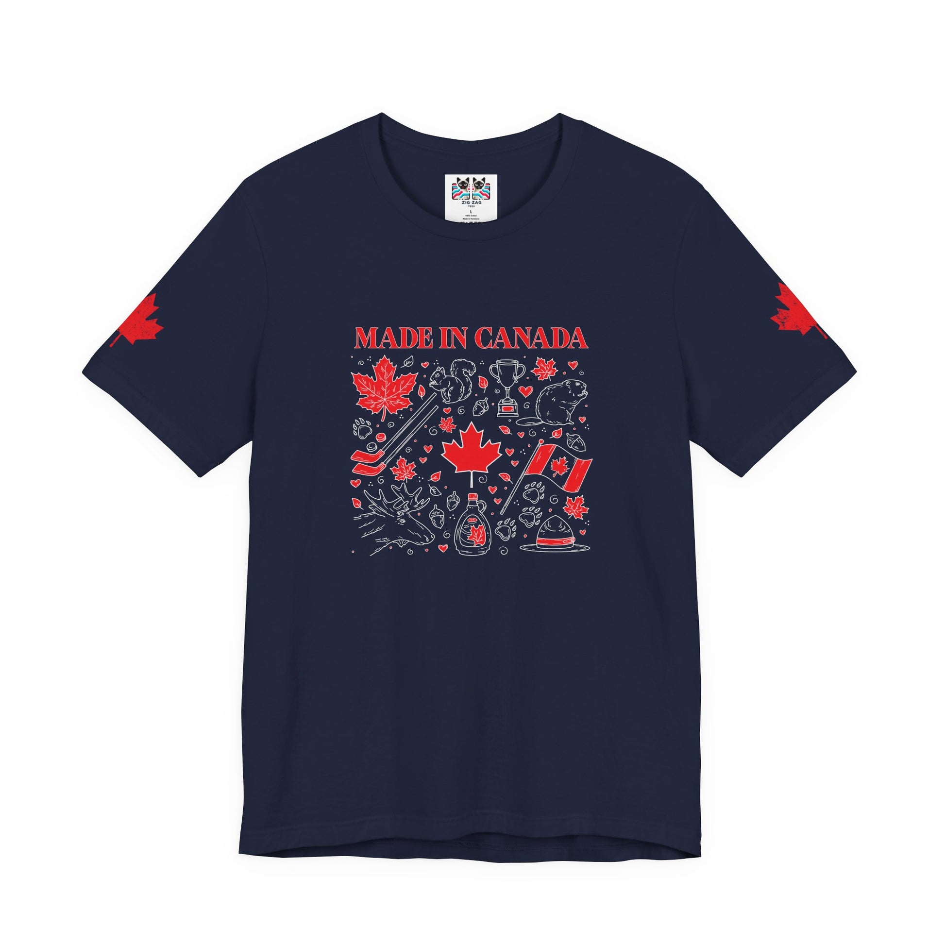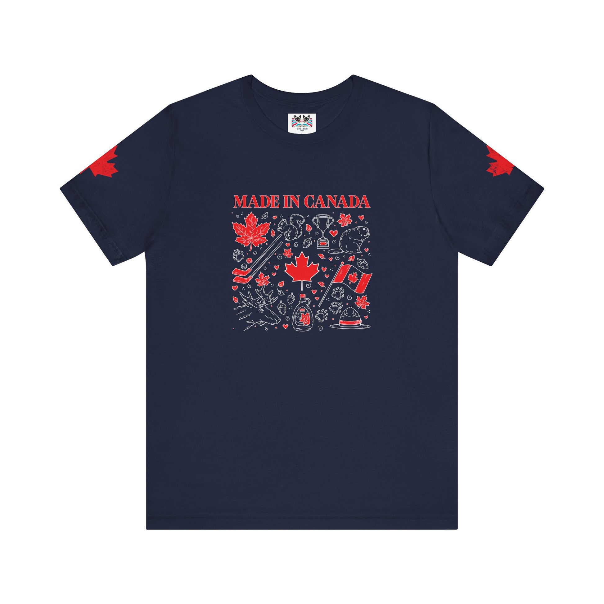 Celebrate your Canadian roots with this lively t-shirt featuring a bright array of national icons! The graphic showcases a maple leaf, maple syrup bottle, heart, moose, squirrel, beaver, bear paws, hat, hockey sticks, tournament cups, and Canadian flag, all scattered playfully in the wind. Maple leaves also decorate both sleeves for an extra patriotic touch. The bold “Made In Canada” text in the center brings it all together, making this tee perfect for Canada Day, gifting, or anyone who loves Canadian heritage and wildlife.