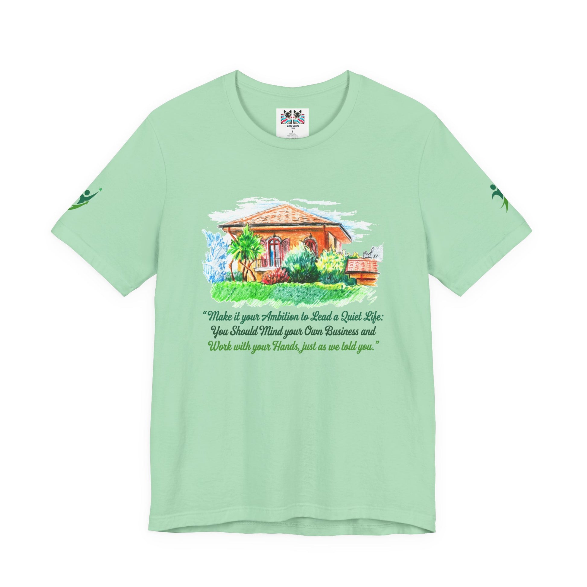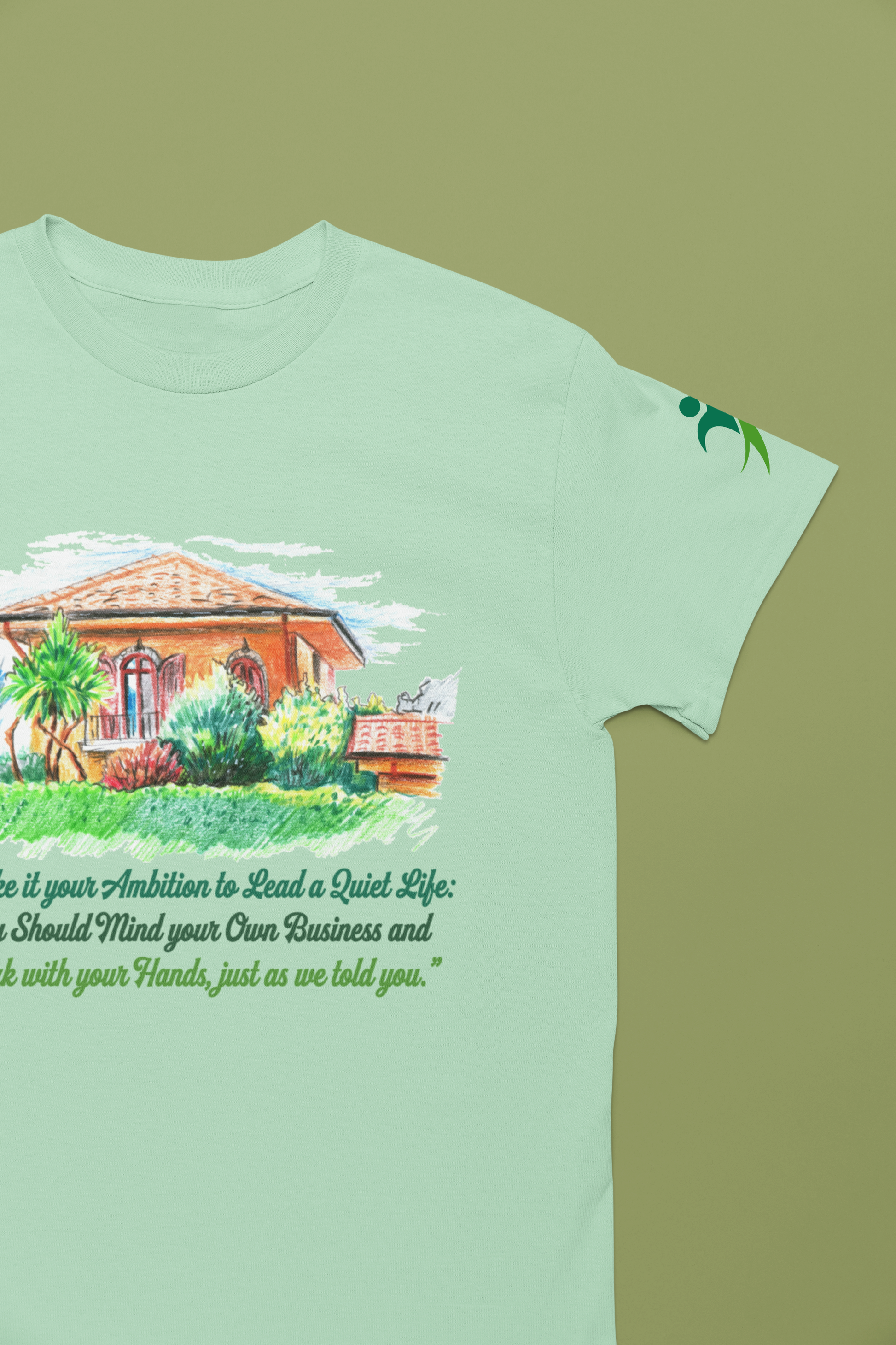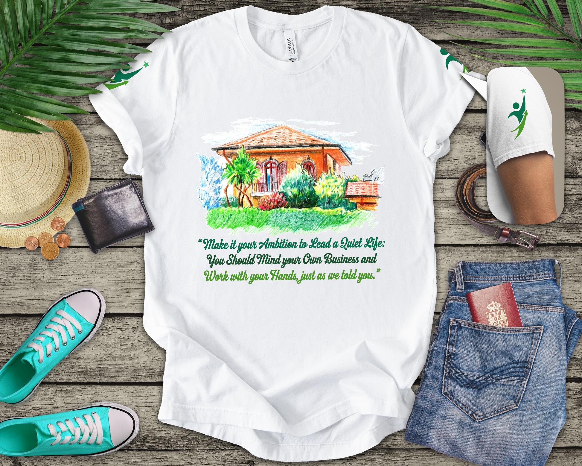 Embrace simple living with this charming "Make it your Ambition to Lead a Quiet Life: You Should Mind your Own Business and Work with your Hands, just as we told you" t-shirt featuring a watercolor illustration of a cozy cottage surrounded by lush gardens. This biblical wisdom (from 1 Thessalonians 4:11) champions a peaceful, humble lifestyle focused on honest work and personal integrity.