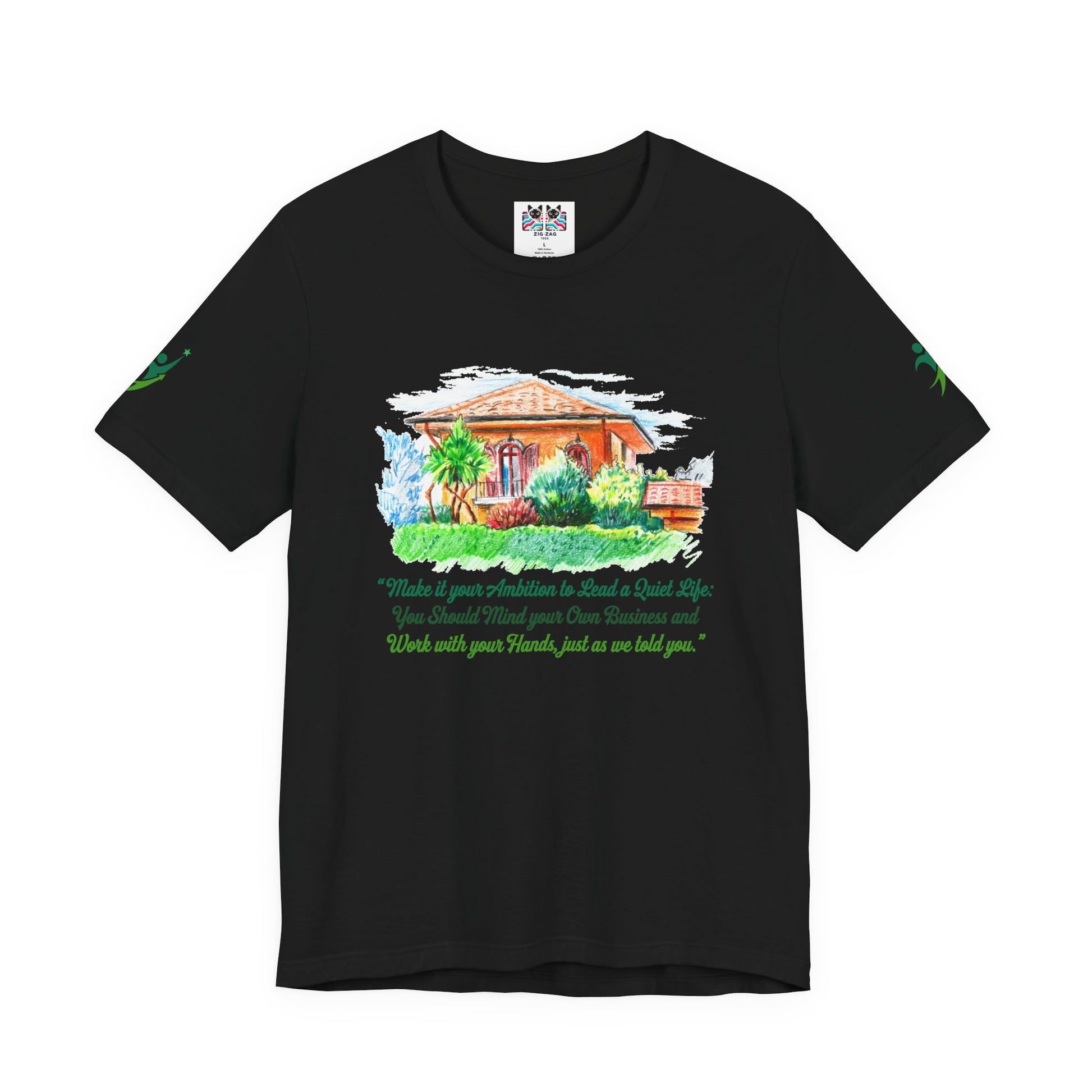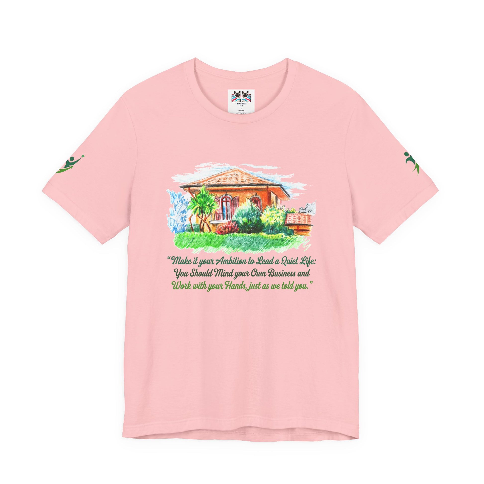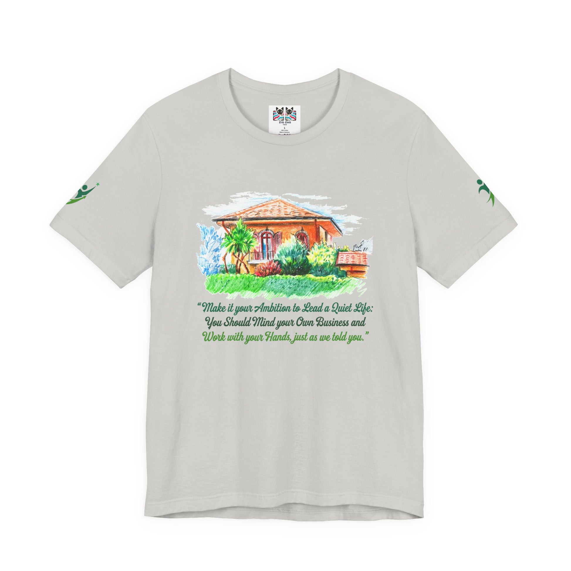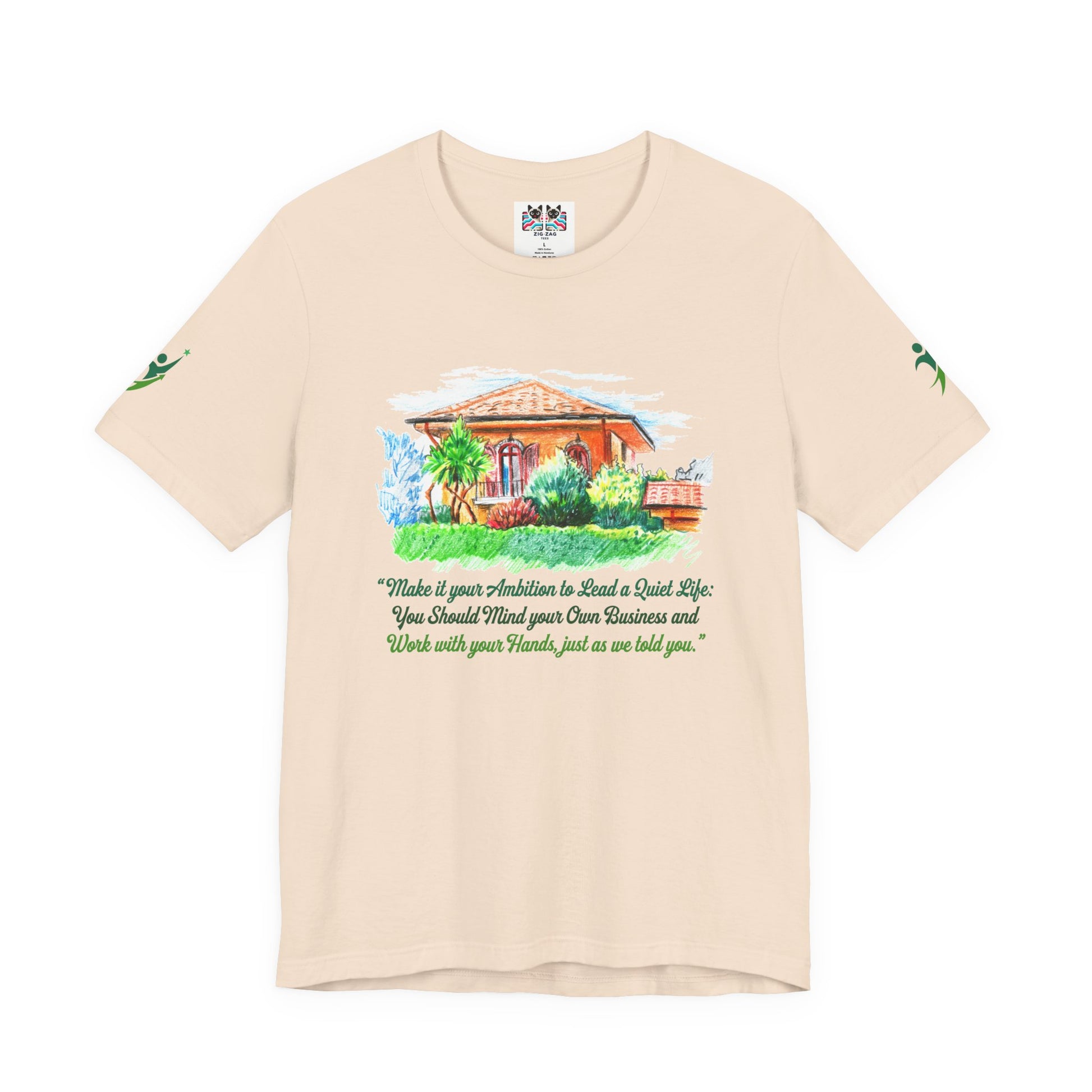 Embrace simple living with this charming "Make it your Ambition to Lead a Quiet Life: You Should Mind your Own Business and Work with your Hands, just as we told you" t-shirt featuring a watercolor illustration of a cozy cottage surrounded by lush gardens. This biblical wisdom (from 1 Thessalonians 4:11) champions a peaceful, humble lifestyle focused on honest work and personal integrity.