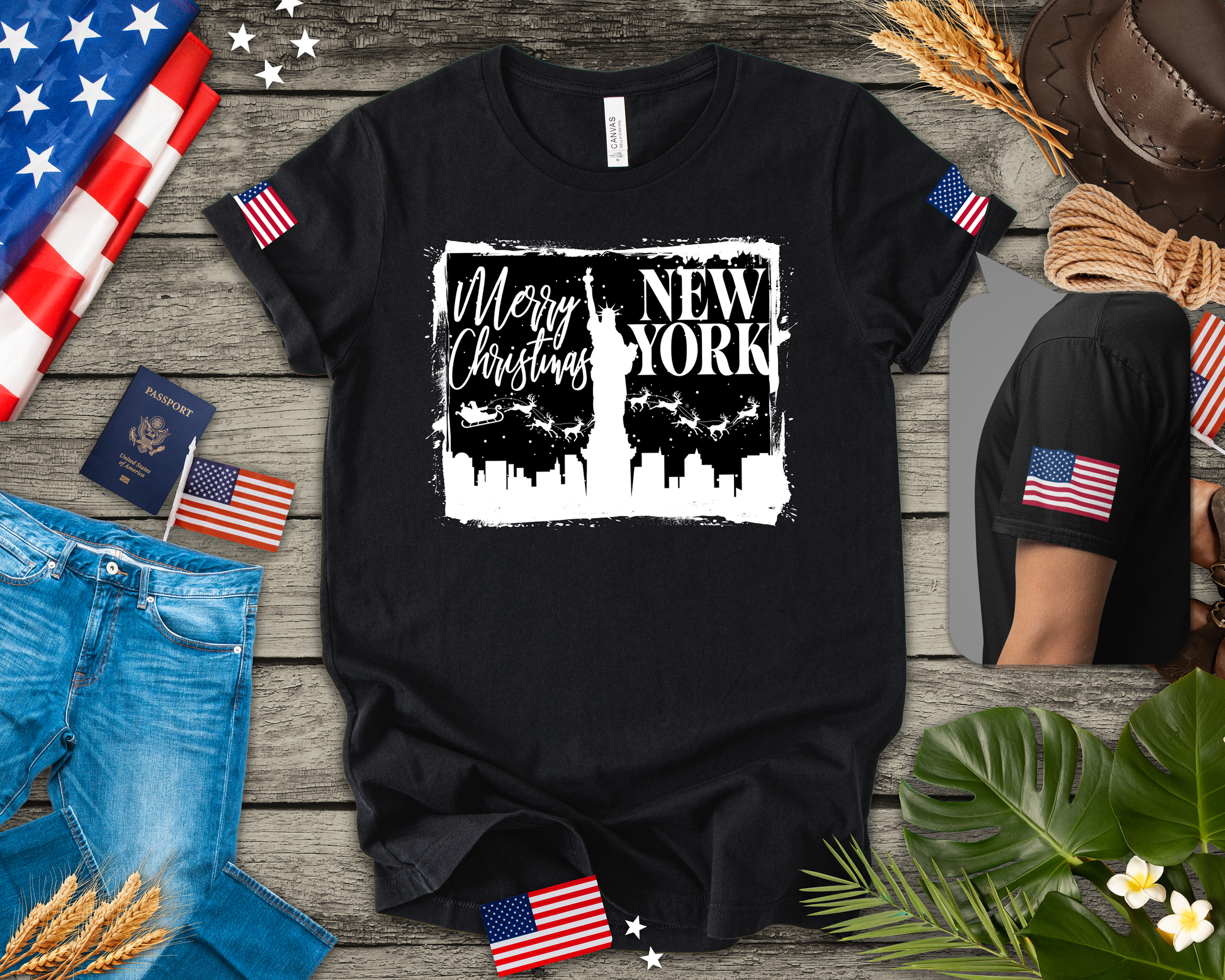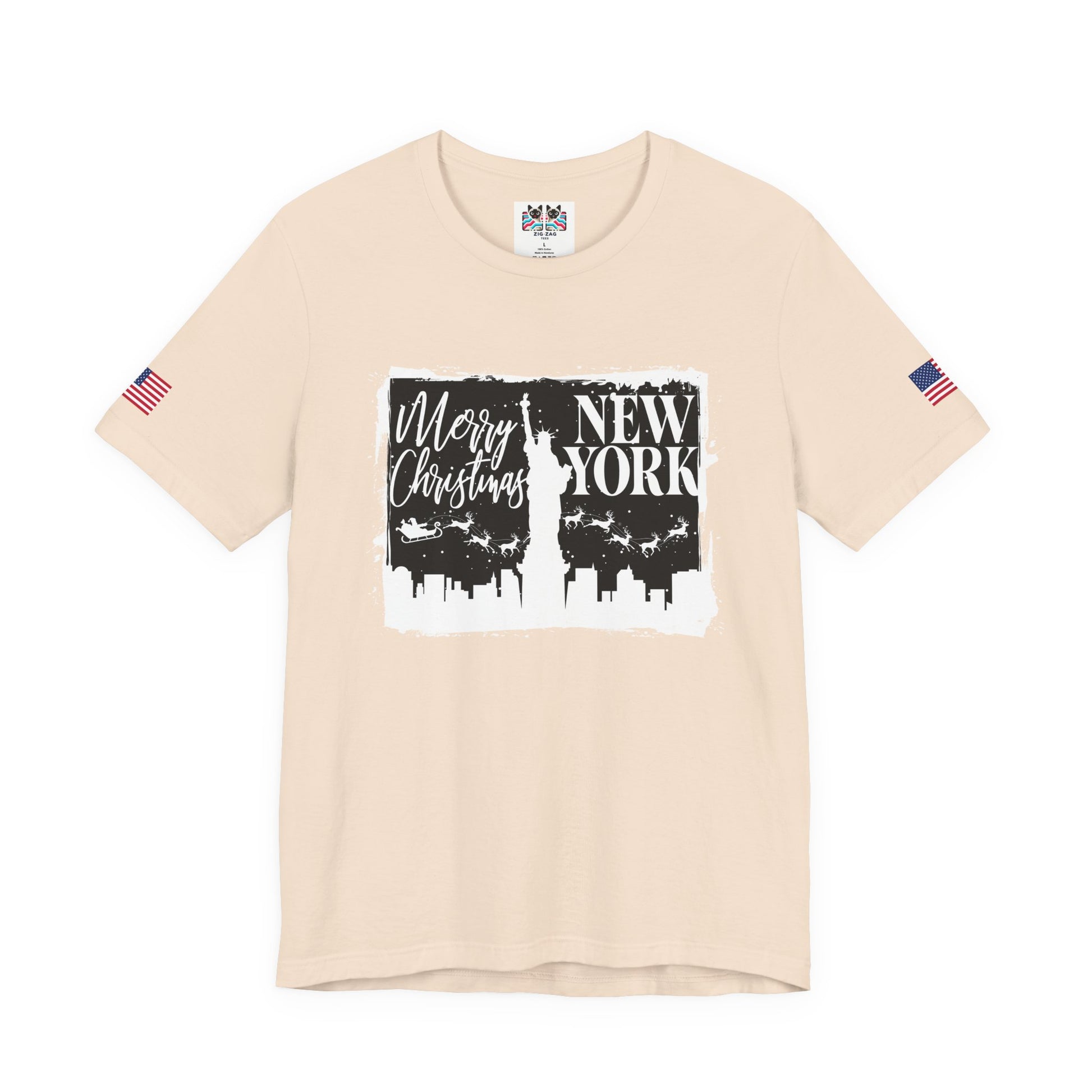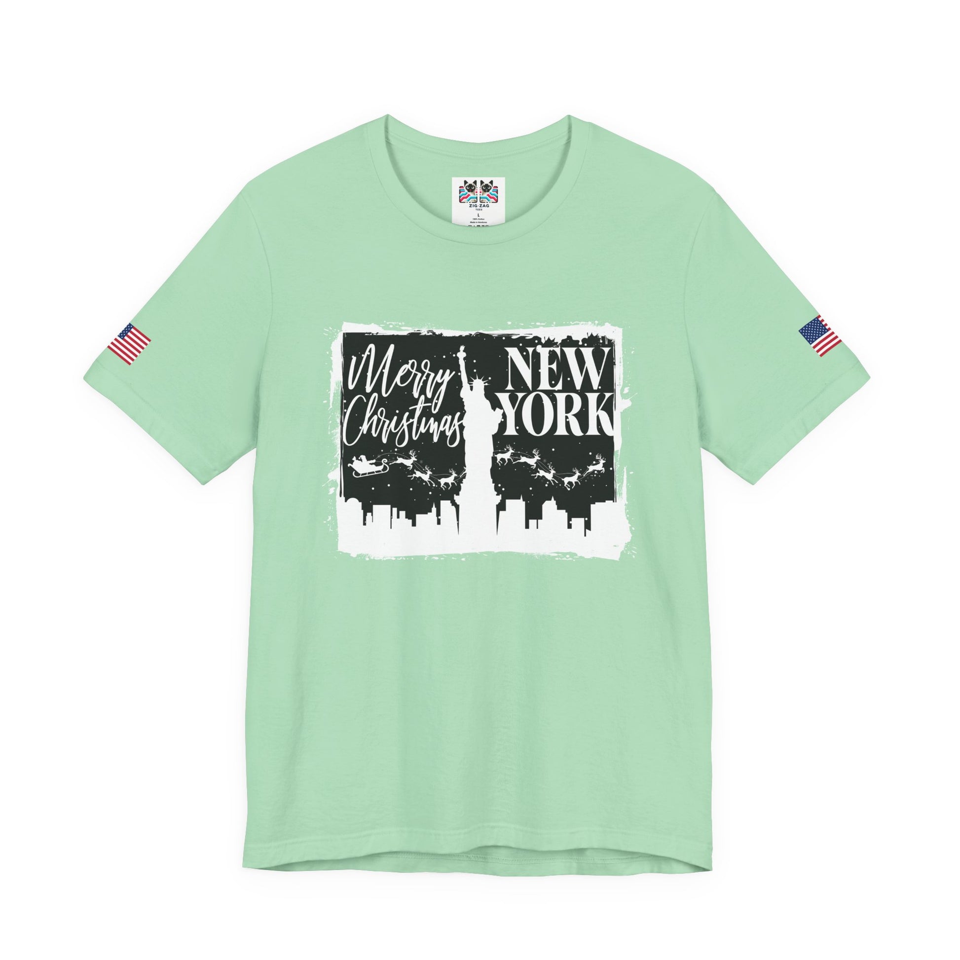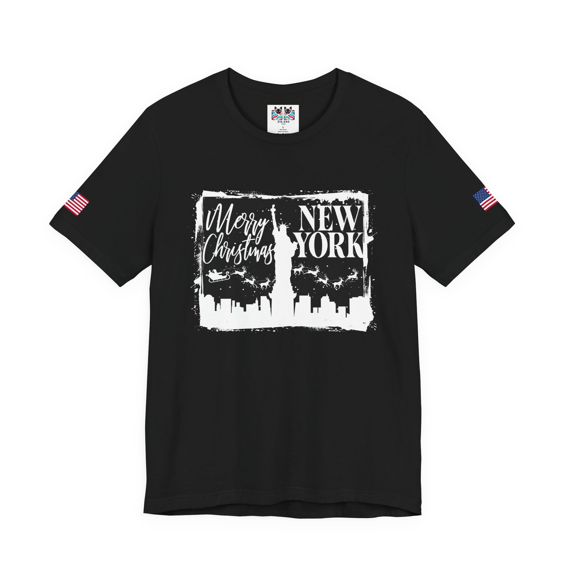 Celebrate the holidays in the city that never sleeps with this festive "Merry Christmas New York" t-shirt! The design features a white distressed rectangular frame containing "Merry Christmas" in script lettering and "NEW YORK" in bold caps, with the NYC skyline silhouette and Statue of Liberty. Santa's sleigh and reindeer fly across the winter sky above the city lights. Perfect for New Yorkers celebrating Christmas, holiday tourists visiting NYC, winter travelers, or anyone who loves the magical atmosphere of New York during the holiday season. This black t-shirt with flag sleeve patches makes a great Christmas gift, ugly sweater party alternative, or festive casual wear for December celebrations, ice skating at Rockefeller Center, or holiday shopping on Fifth Avenue.