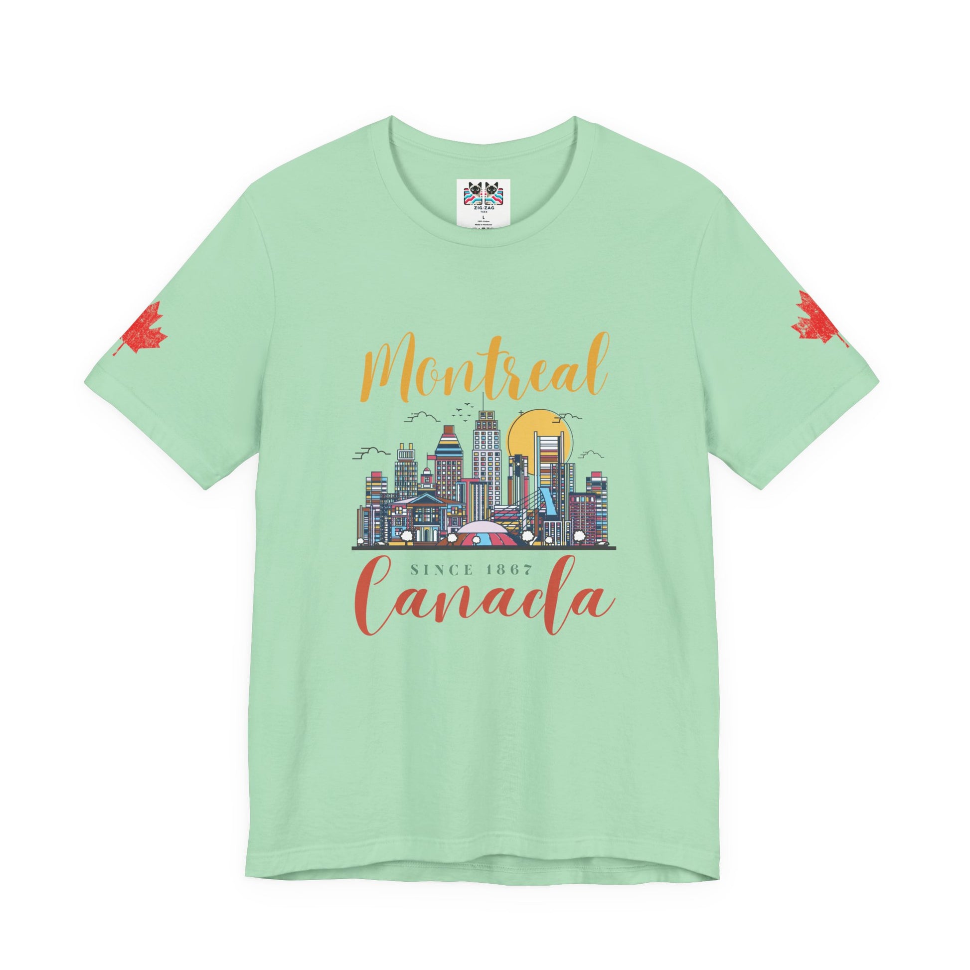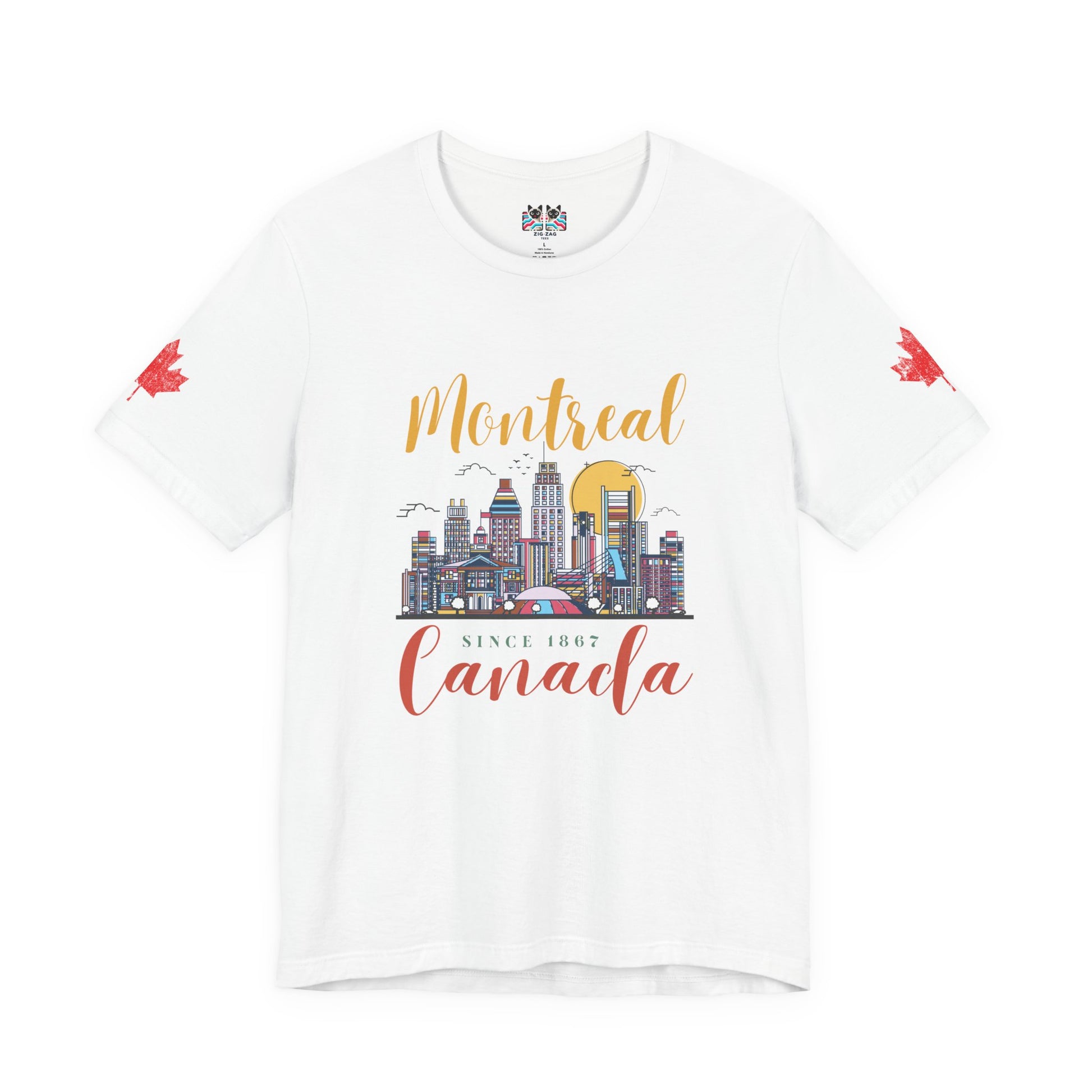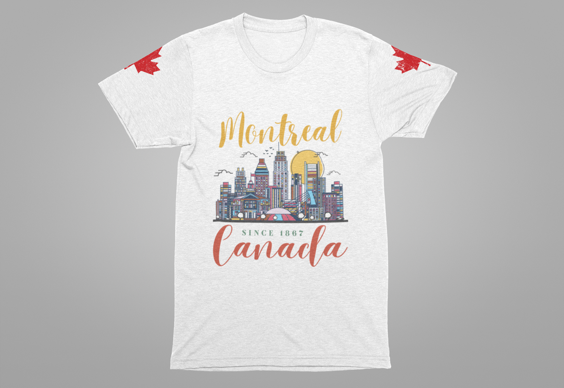 Celebrate the vibrant city of Montreal with this artistic t-shirt featuring a colorful skyline illustration. Iconic buildings, a golden sun, birds, and the city’s unique energy are beautifully rendered on the chest, along with stylish lettering: “Montreal” on top and “Canada Since 1867” below. Maple leaves accent both sleeves for added patriotic flair. Perfect for locals, tourists, and anyone who loves urban Canadian culture and Montreal’s rich heritage.