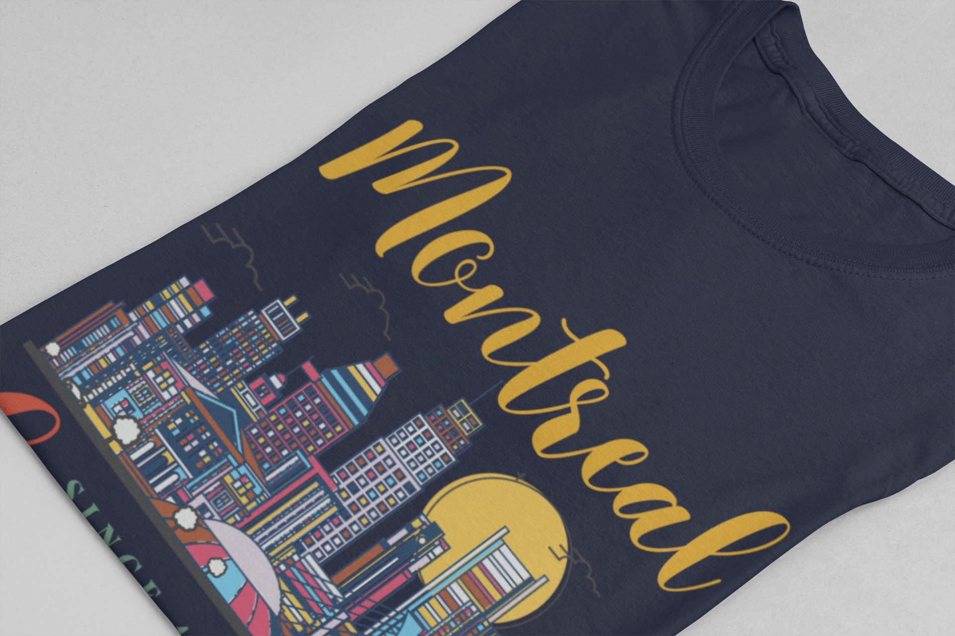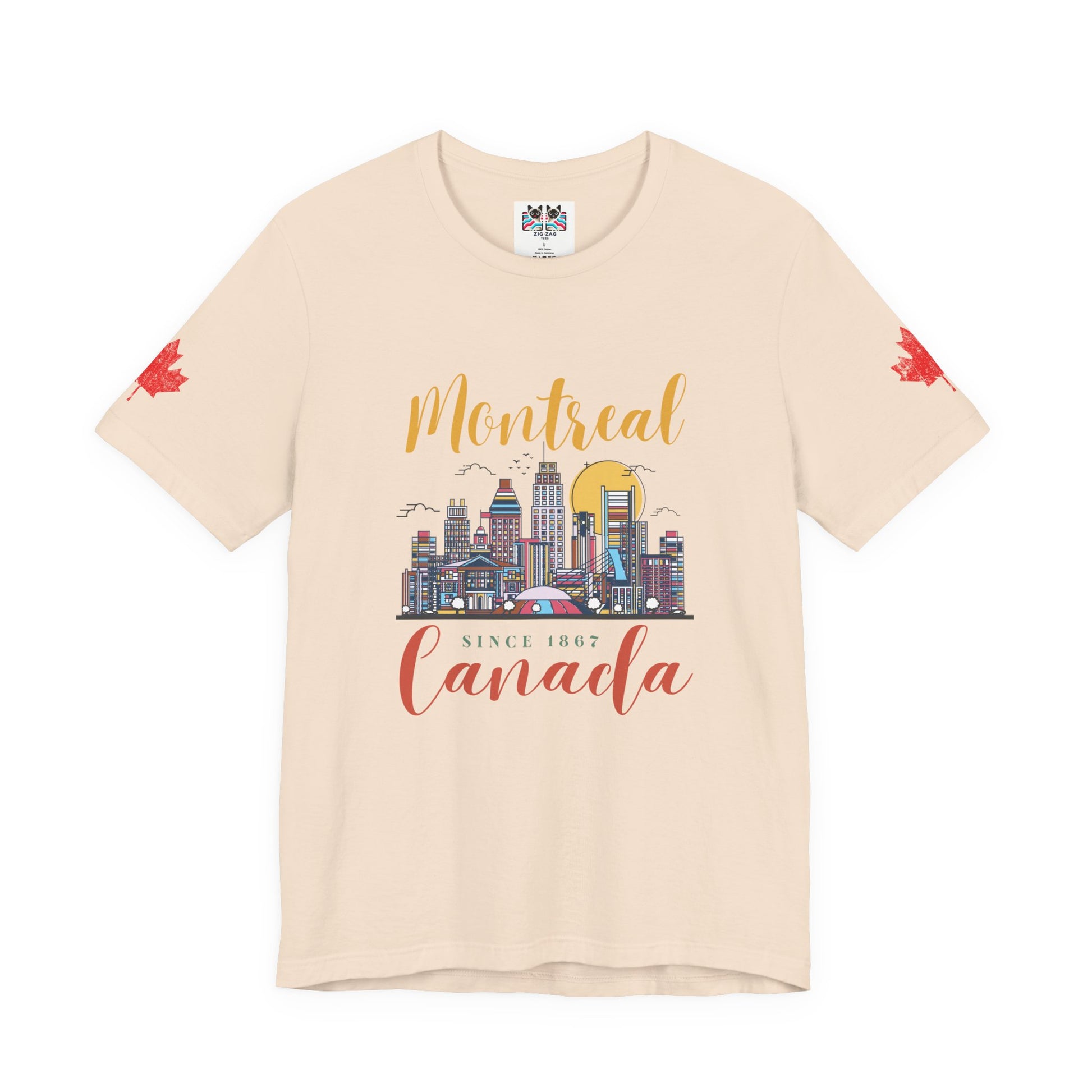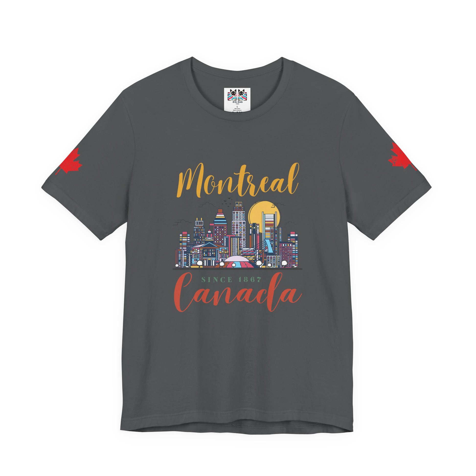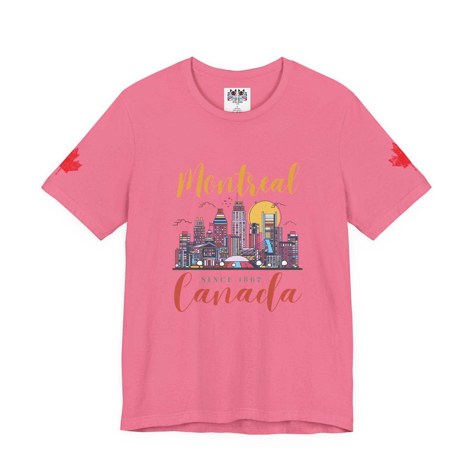 Celebrate the vibrant city of Montreal with this artistic t-shirt featuring a colorful skyline illustration. Iconic buildings, a golden sun, birds, and the city’s unique energy are beautifully rendered on the chest, along with stylish lettering: “Montreal” on top and “Canada Since 1867” below. Maple leaves accent both sleeves for added patriotic flair. Perfect for locals, tourists, and anyone who loves urban Canadian culture and Montreal’s rich heritage.
