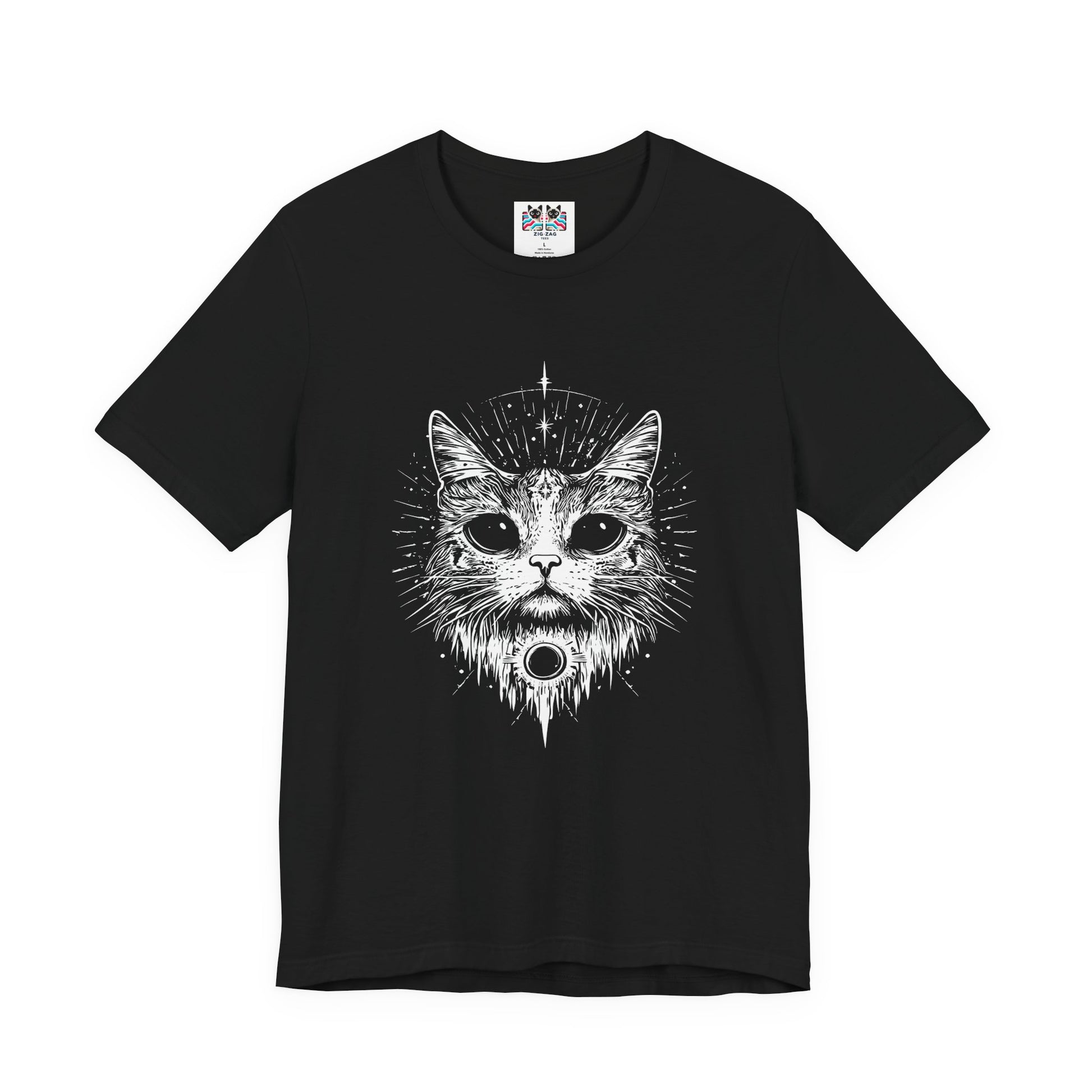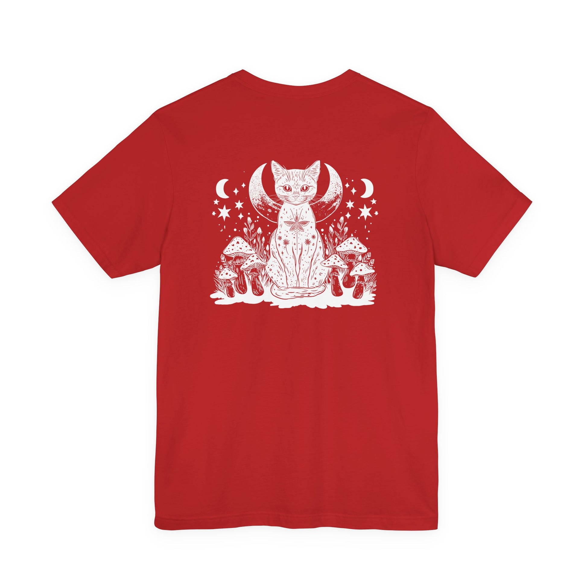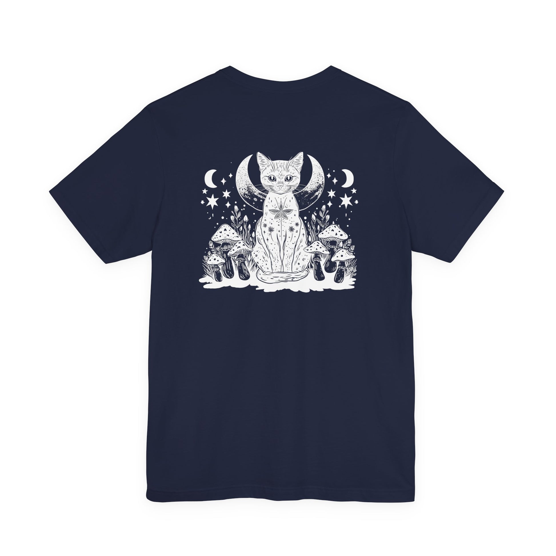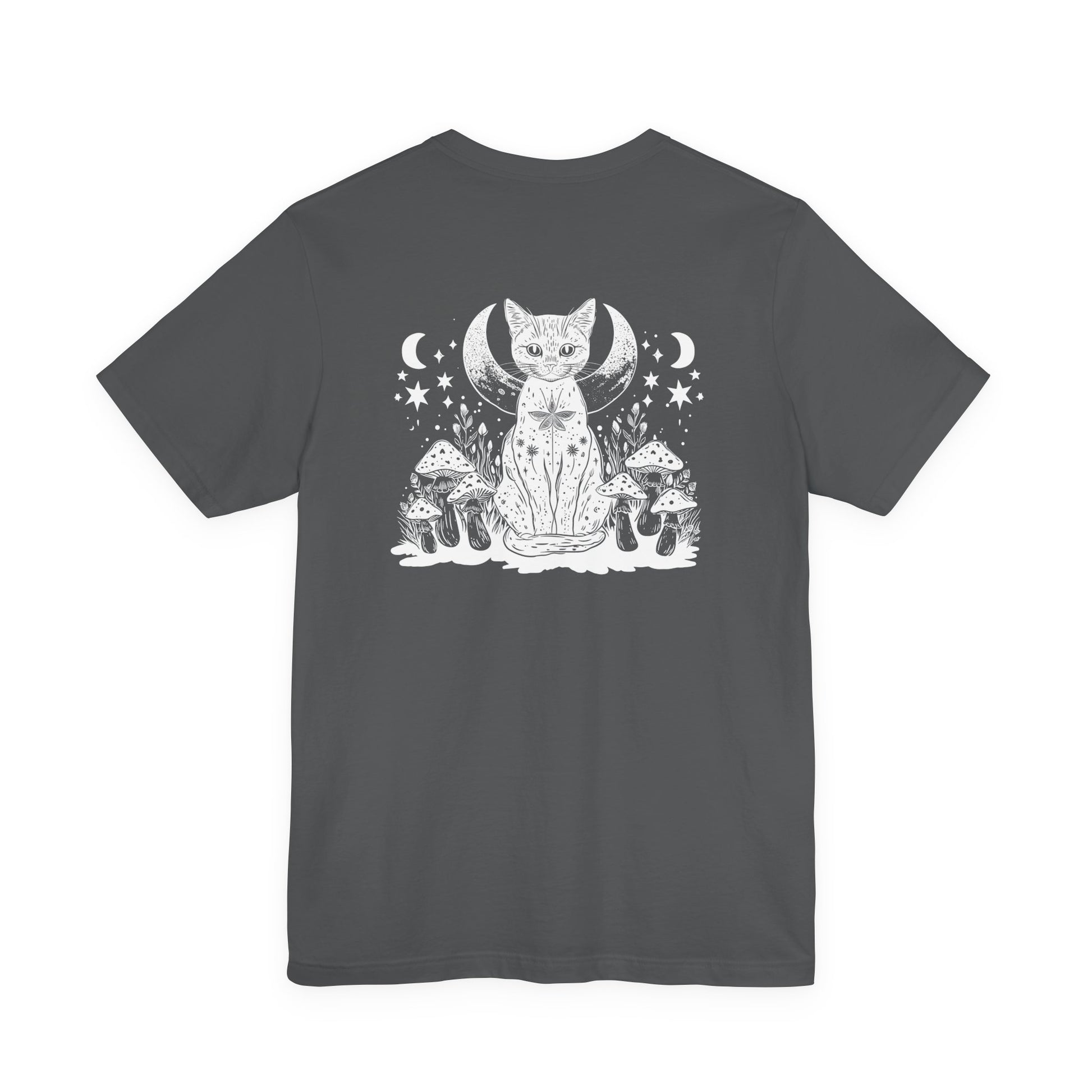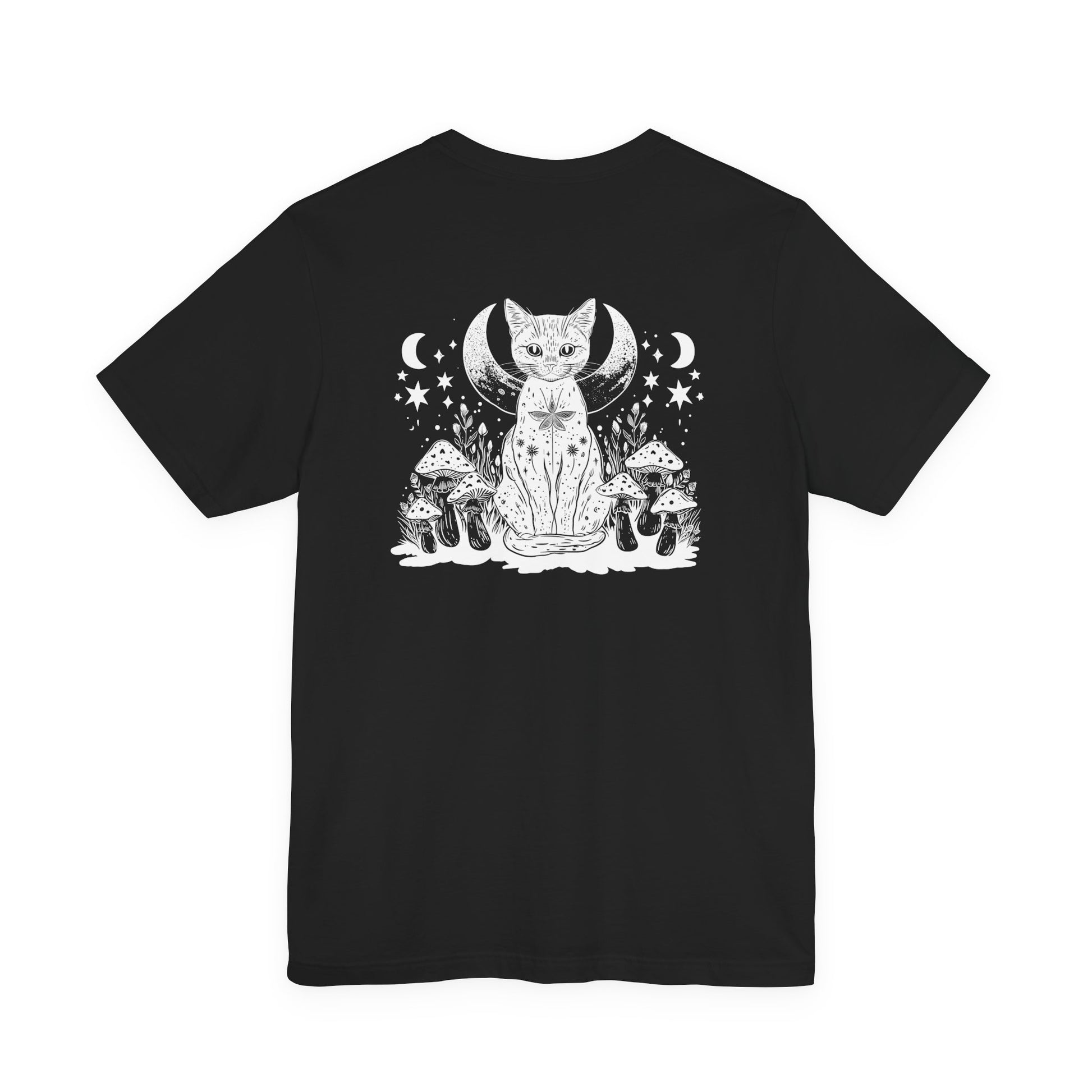 Tap into cosmic kitty energy with this mystical cat t-shirt featuring an illustrated cat face surrounded by radiant lines and a tiny eclipse-style moon on the front. The back shows a seated celestial cat framed by crescent moons, stars, and a ring of spotted mushrooms for full witchy forest vibes. Perfect for cat lovers, cottagecore and witchy aesthetic fans, and anyone who loves magic and mushrooms, this enchanting tee is great for festivals, moon rituals, or everyday mystical style.