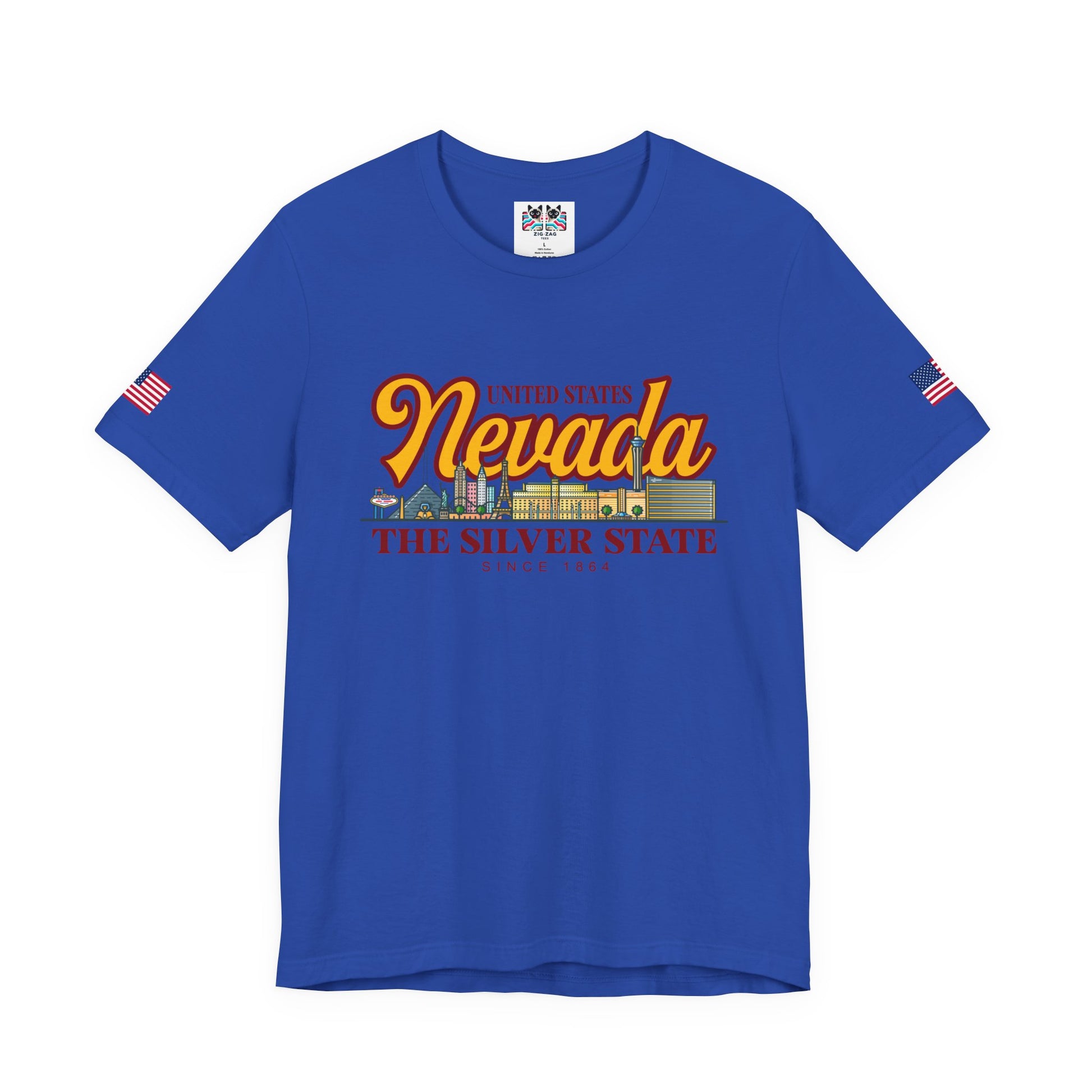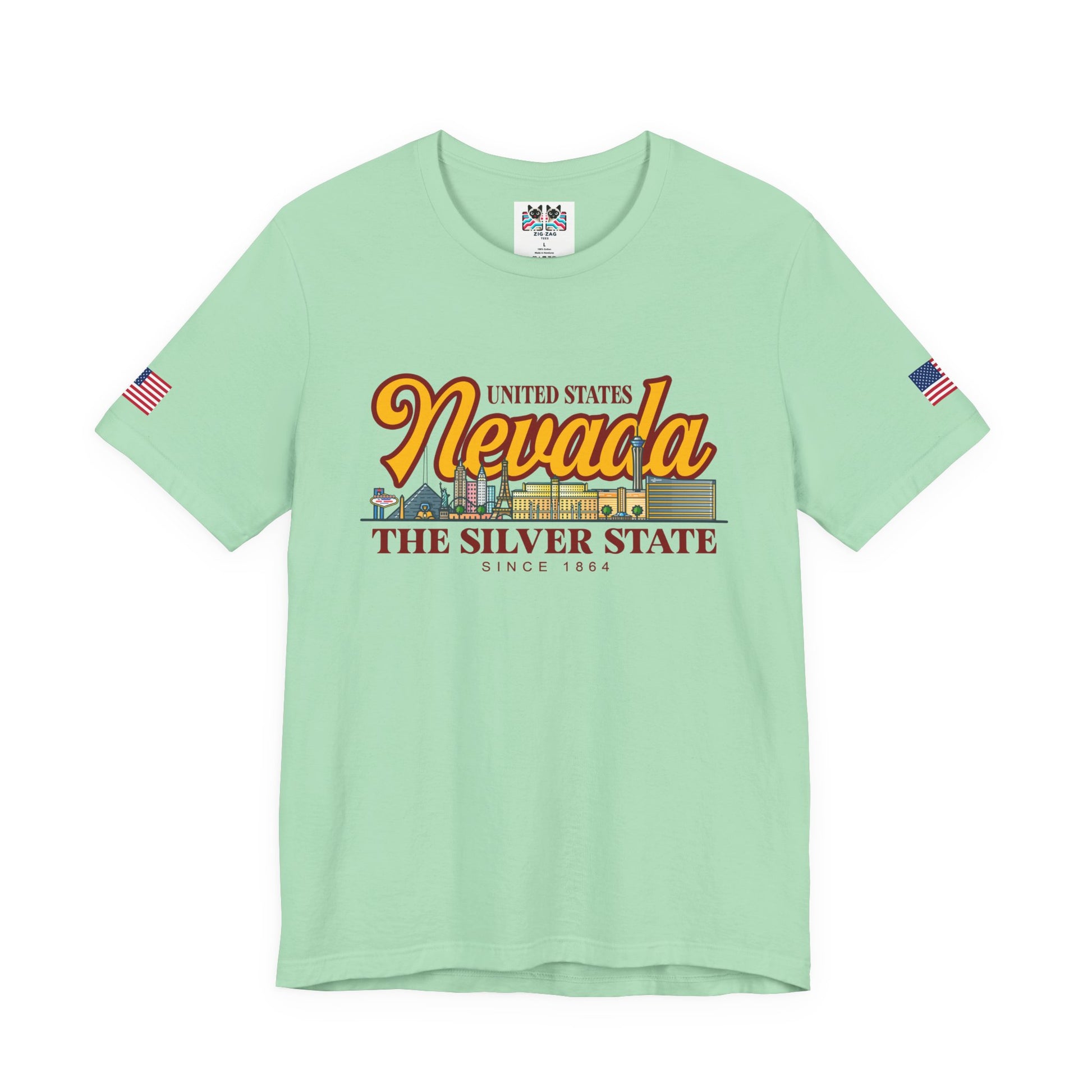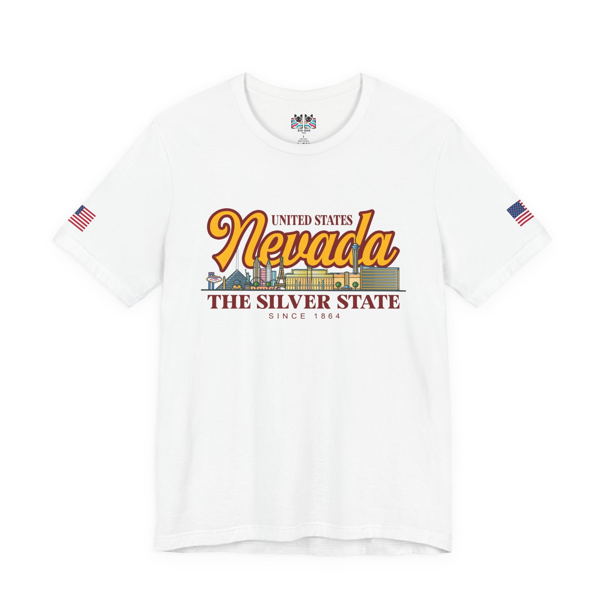 Celebrate the Silver State with this elegant "United States NEVADA - THE SILVER STATE - SINCE 1864" t-shirt featuring a colorful Las Vegas skyline! The design shows Nevada's nickname "The Silver State" (referring to the 1859 silver rush) with casino resorts, the famous welcome sign, and desert landmarks. Nevada became a state on October 31, 1864, during the Civil War. The burgundy script "Nevada" with gold/yellow outline creates a classic, vintage look against the pastel skyline. Las Vegas transformed from a desert railroad town into the entertainment capital of the world. This t-shirt with American flag sleeve patches is perfect for Nevada residents, Las Vegas lovers, Silver State pride, tourists, bachelorette parties, women who love Vegas, or anyone celebrating Nevada's unique history and culture. The feminine pink color makes this ideal for ladies' Vegas trips, girls' weekends, or women who want stylish Nevada pride.