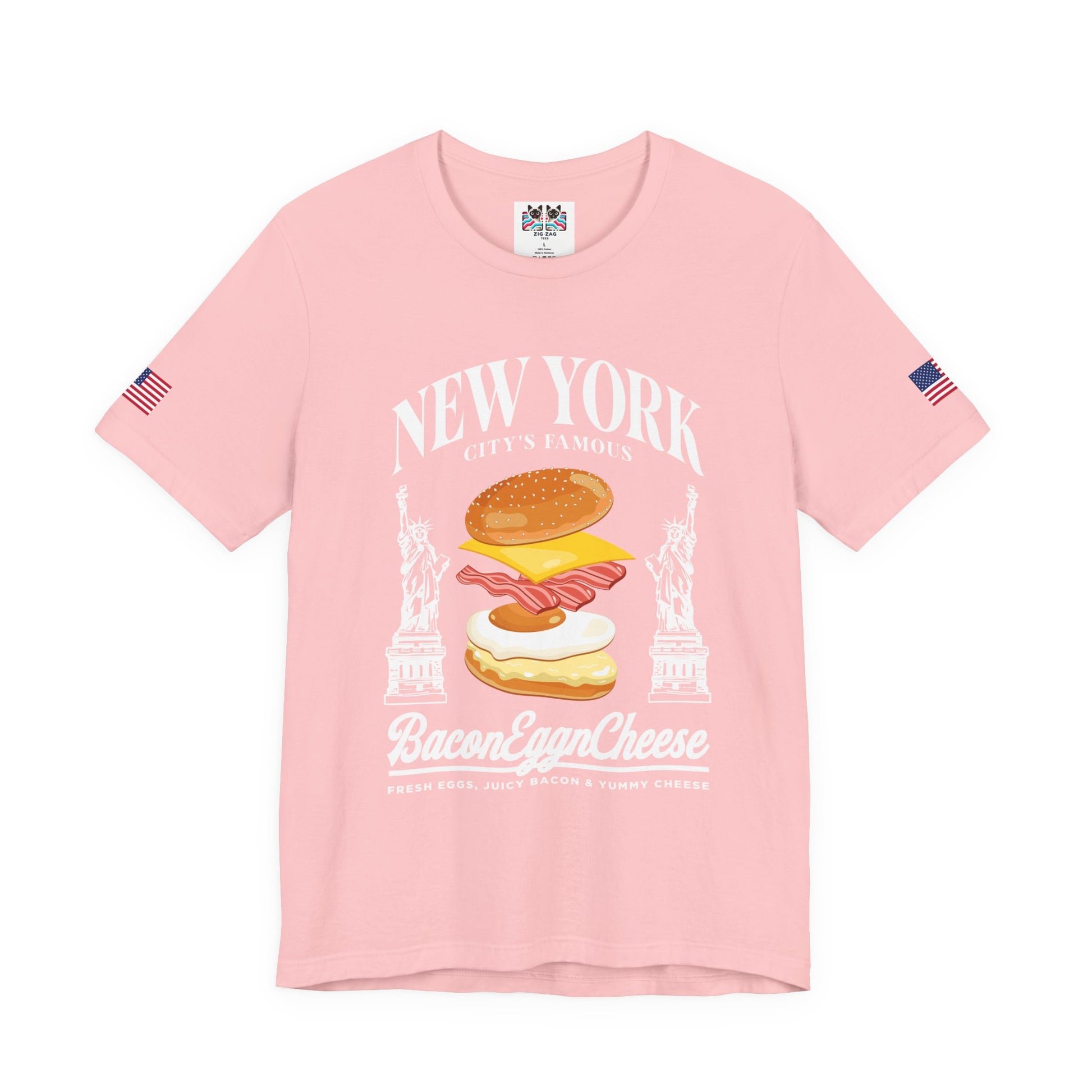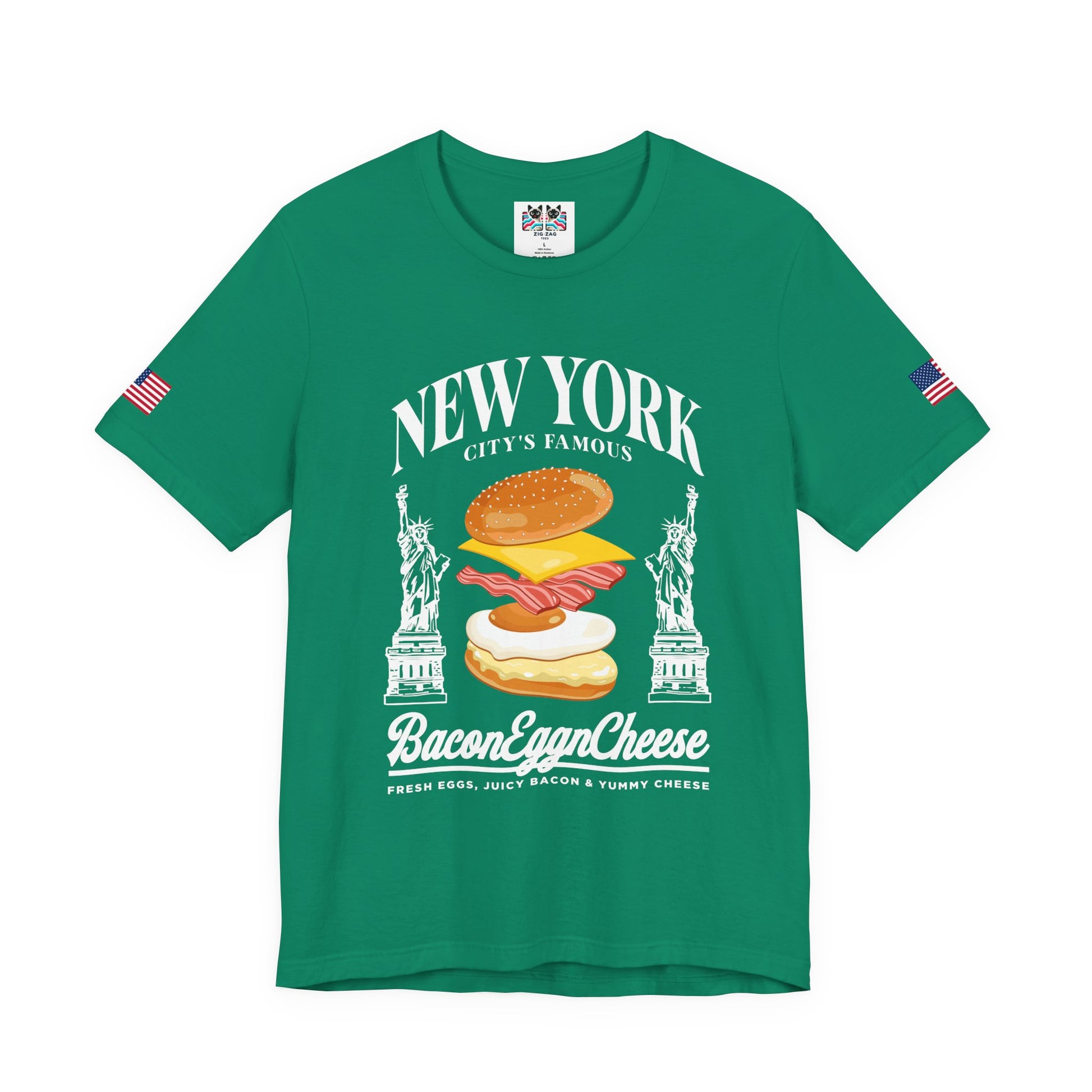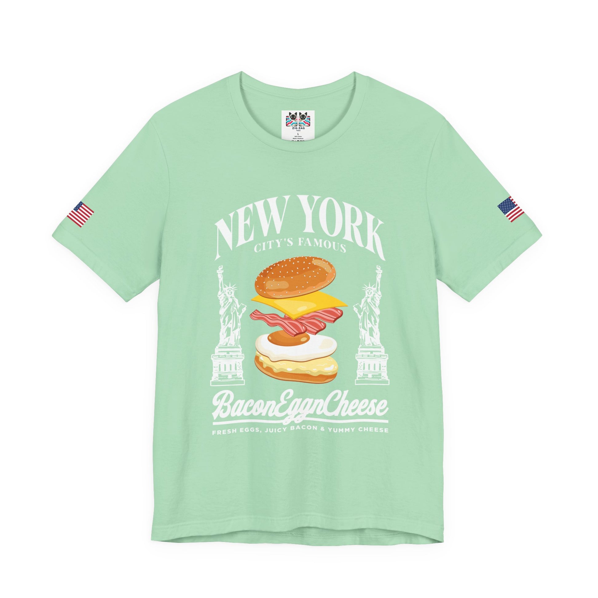 Celebrate New York's most iconic breakfast with this hilarious "NEW YORK CITY'S FAMOUS Bacon Egg n Cheese" t-shirt! The design features a mouth-watering illustrated BEC sandwich with perfectly layered bacon strips, a fried egg, and melted cheese on a toasted roll, flanked by two Statue of Liberty illustrations. The text "FRESH EGGS, JUICY BACON & YUMMY CHEESE" completes this tribute to NYC bodega culture. Every New Yorker knows the BEC from the corner deli is a quintessential part of city life - whether you're grabbing breakfast before work, after a night out, or any time hunger strikes. This navy blue t-shirt with American flag sleeve patches is perfect for NYC food lovers, bodega culture enthusiasts, breakfast lovers, deli workers, or anyone who understands that the best BEC comes from a New York bodega. Great for foodies, chefs, restaurant workers, or as a funny gift for NYC transplants and natives alike.