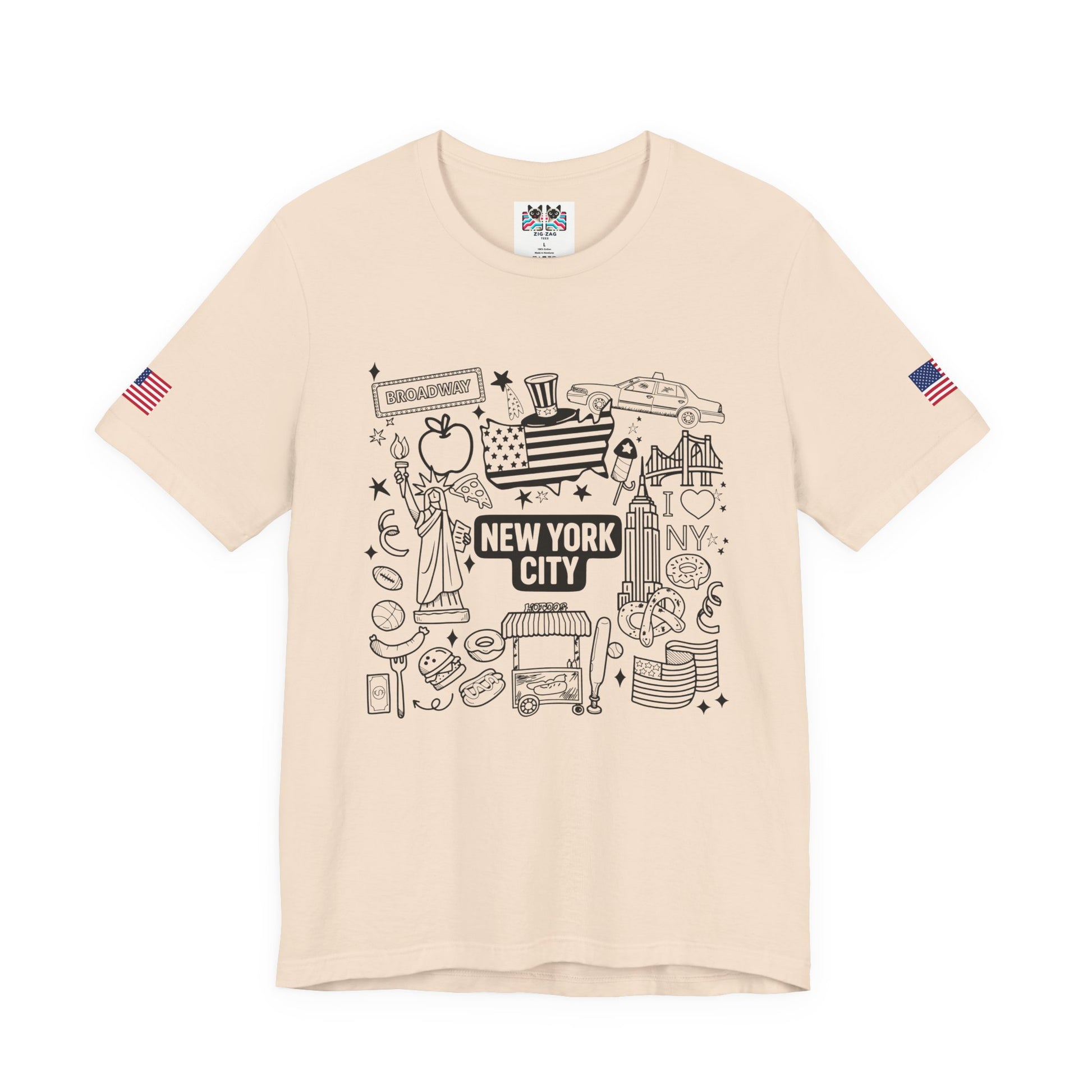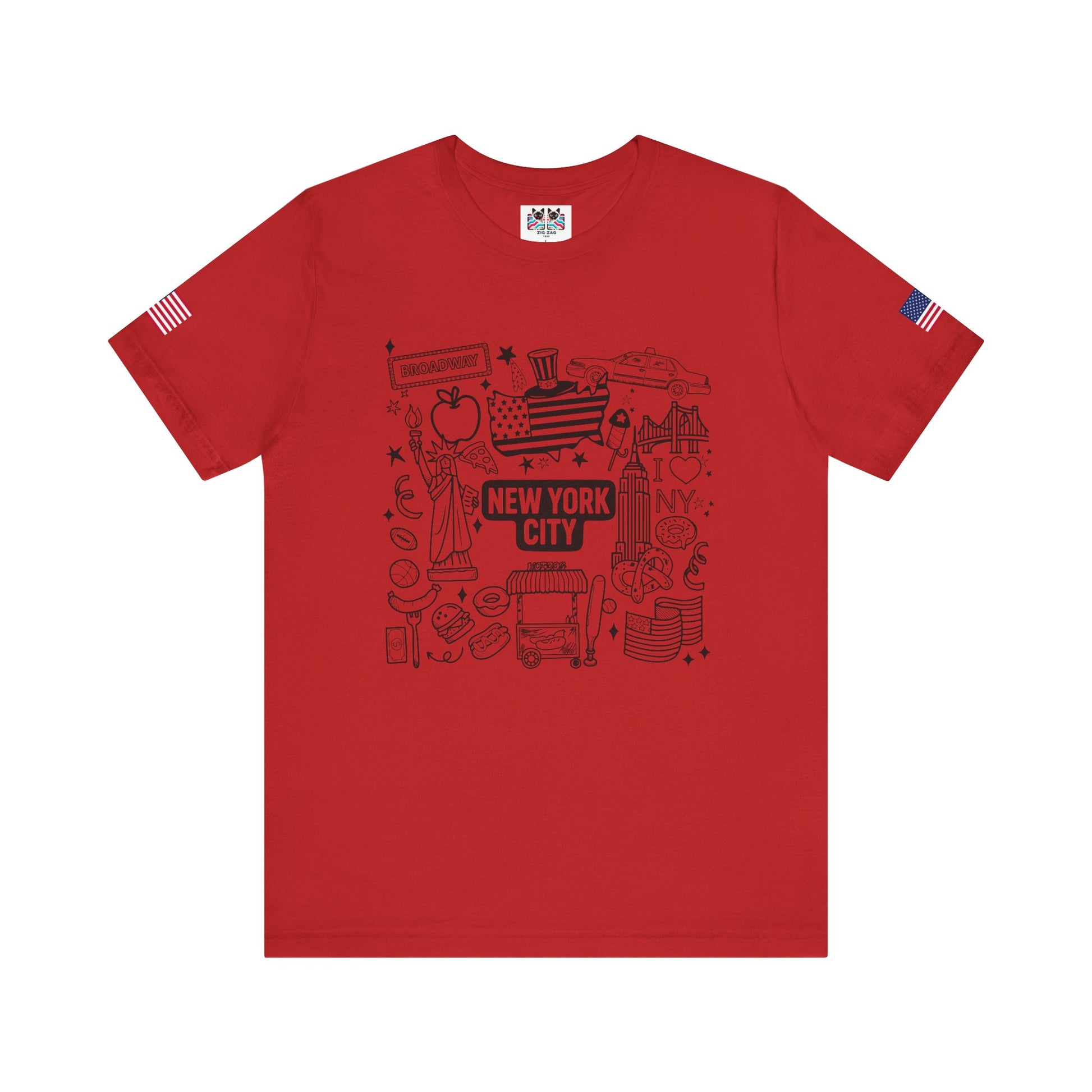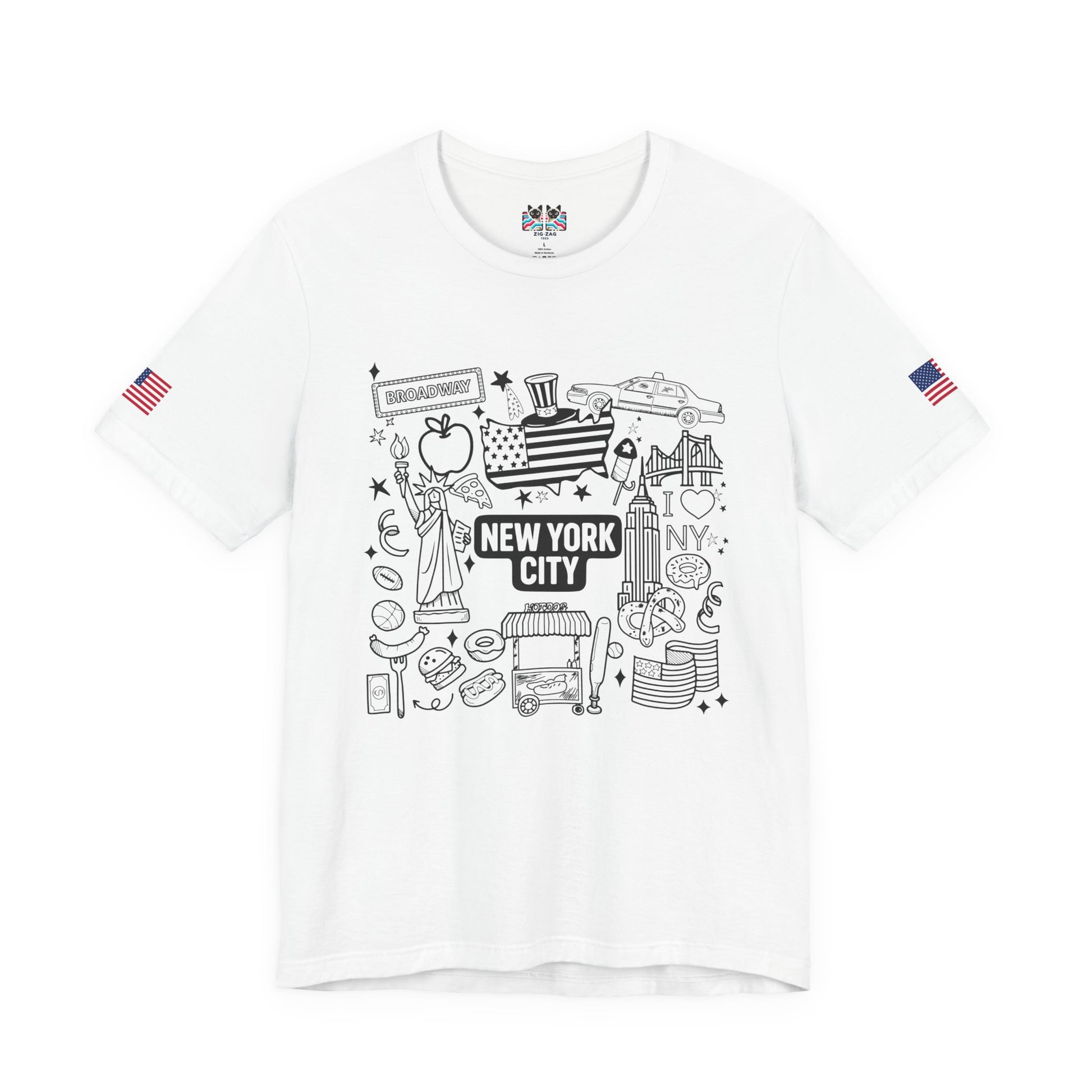 Perfect for all ages! This fun hand-drawn doodle-style New York City t-shirt features charming illustrated icons including the Statue of Liberty, Broadway sign, Uncle Sam top hat with flag pattern, yellow taxi cab, "I ❤ NY" text, Empire State Building, Chrysler Building, hot dogs, hamburgers, basketball, football, donuts, coffee, pretzels, and more NYC favorites. The black outline coloring book aesthetic gives this a playful, approachable feel perfect for families, kids, tourists, or anyone who loves NYC's fun side. The "NEW YORK CITY ESTD" text adds historical context. This white t-shirt with American flag sleeve patches is ideal for vacation souvenirs, family trips, coloring enthusiasts, or casual everyday wear celebrating New York culture and iconic symbols.
