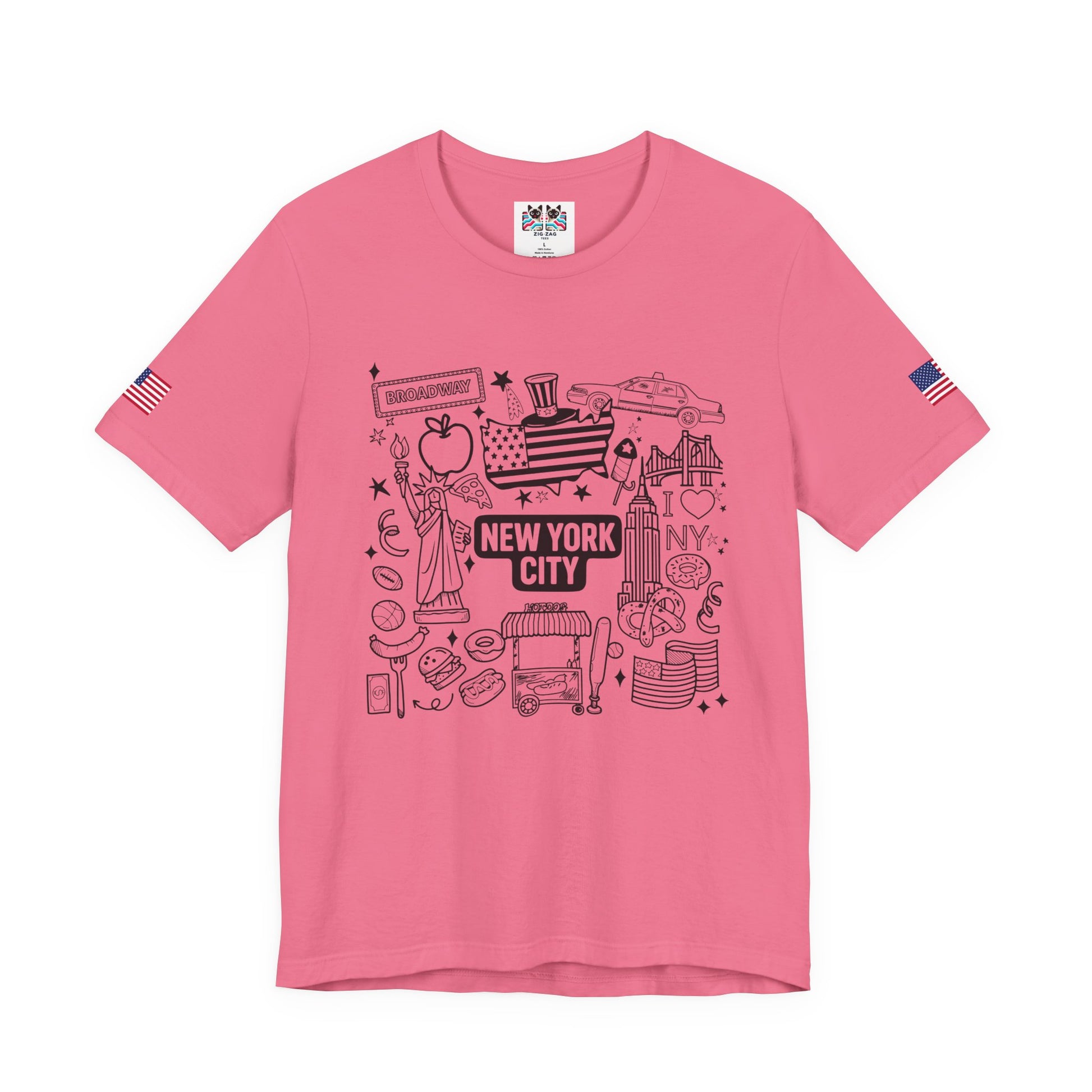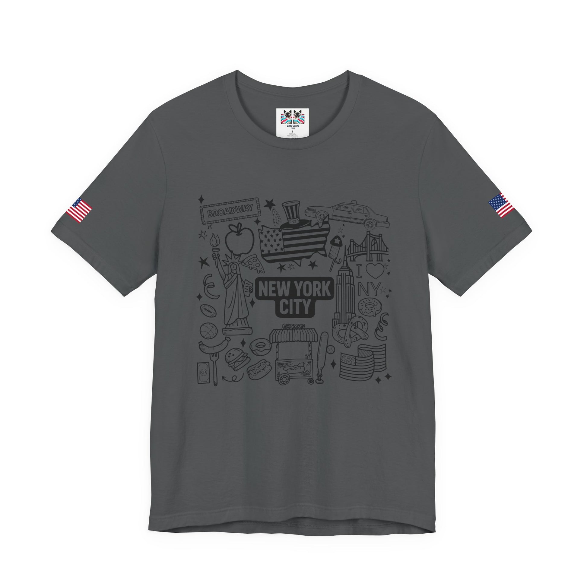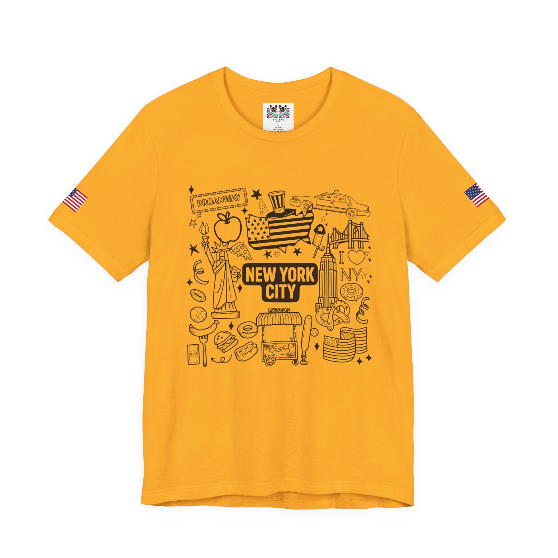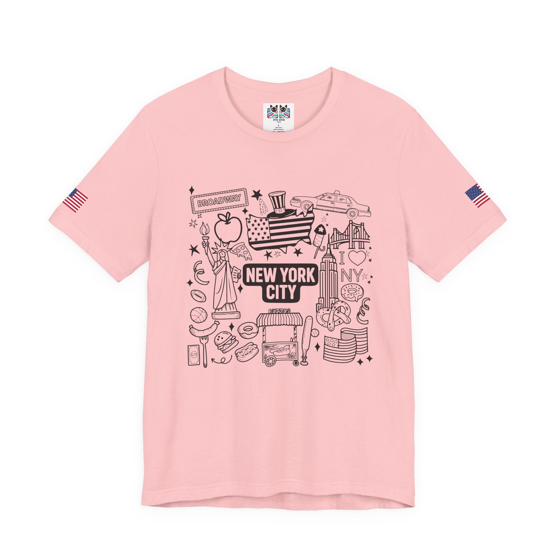 Perfect for all ages! This fun hand-drawn doodle-style New York City t-shirt features charming illustrated icons including the Statue of Liberty, Broadway sign, Uncle Sam top hat with flag pattern, yellow taxi cab, "I ❤ NY" text, Empire State Building, Chrysler Building, hot dogs, hamburgers, basketball, football, donuts, coffee, pretzels, and more NYC favorites. The black outline coloring book aesthetic gives this a playful, approachable feel perfect for families, kids, tourists, or anyone who loves NYC's fun side. The "NEW YORK CITY ESTD" text adds historical context. This white t-shirt with American flag sleeve patches is ideal for vacation souvenirs, family trips, coloring enthusiasts, or casual everyday wear celebrating New York culture and iconic symbols.