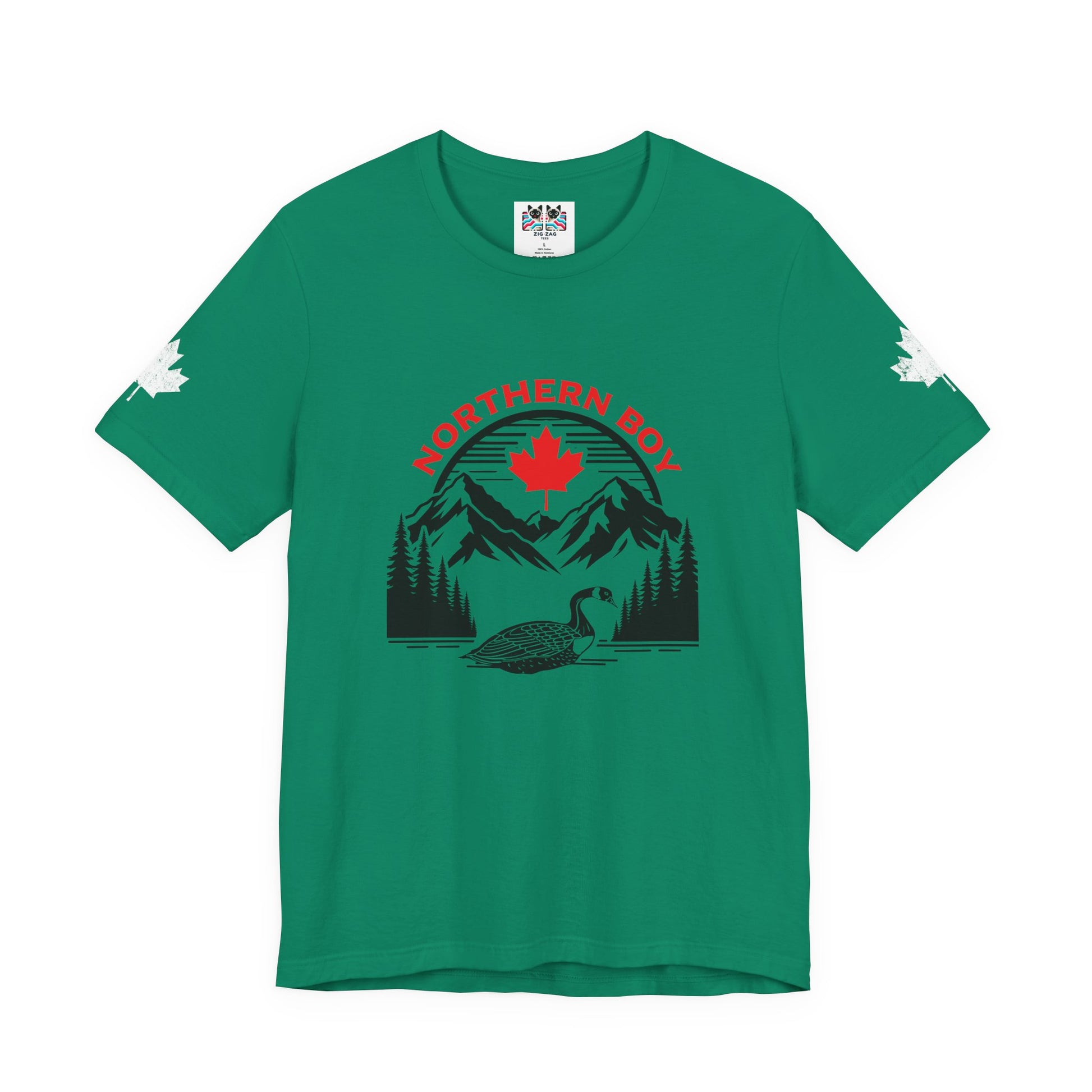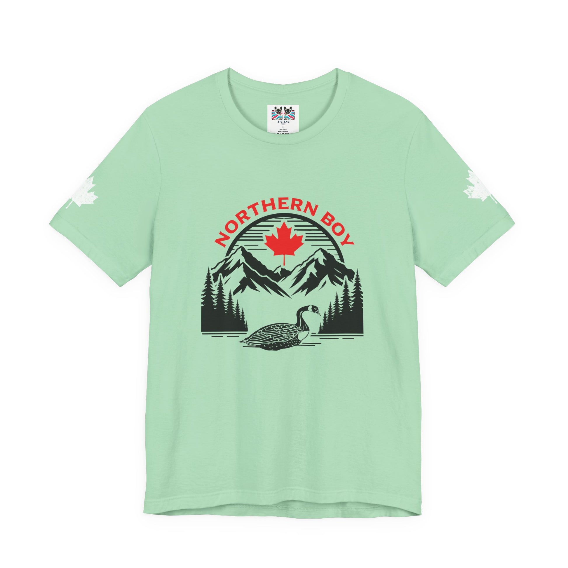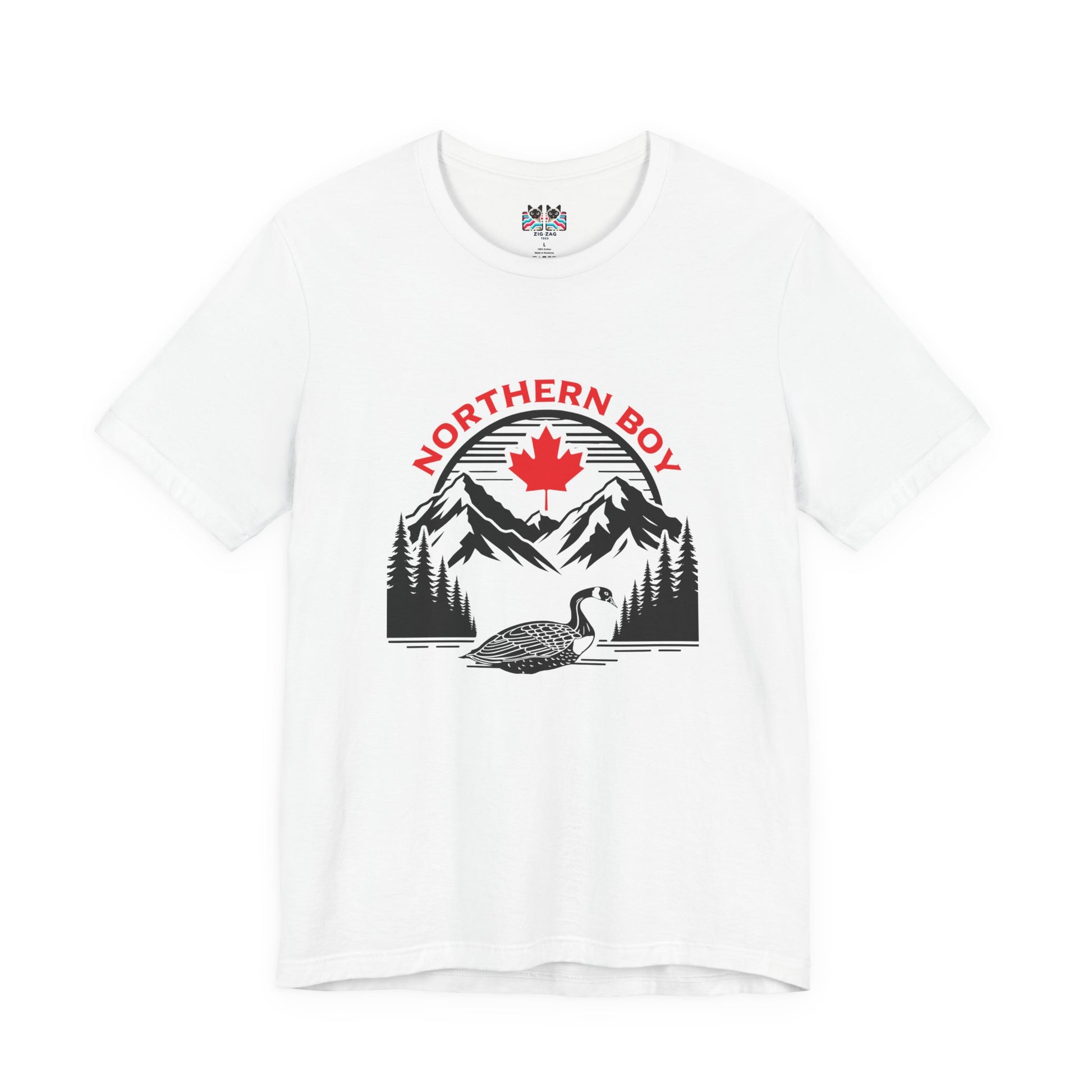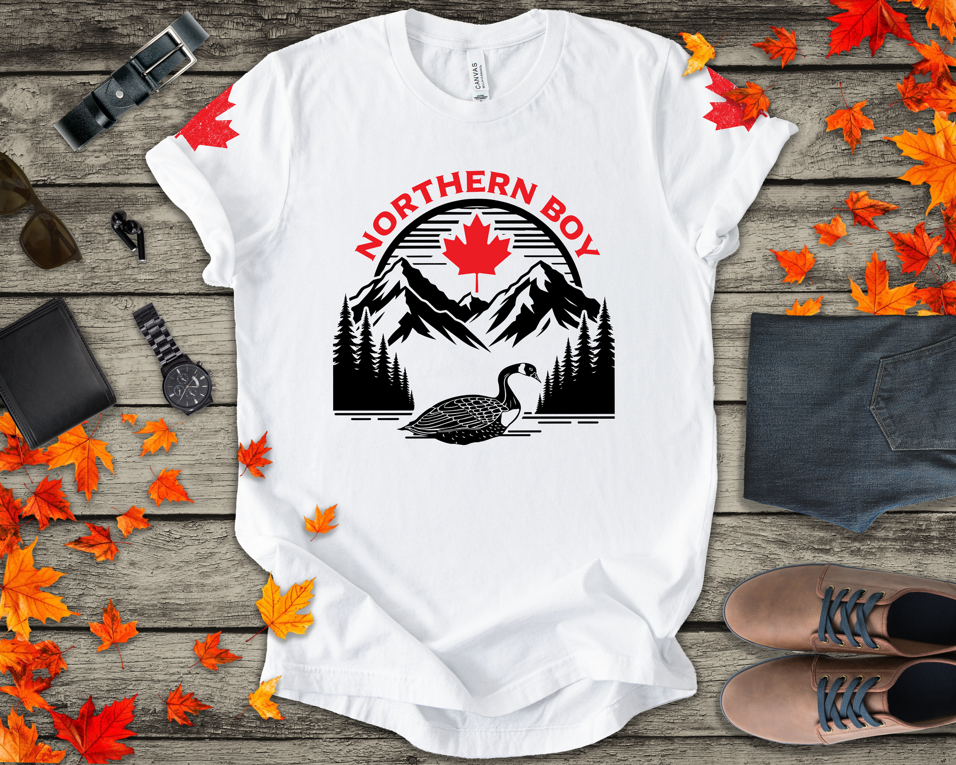 Celebrate the spirit of the north with this striking t-shirt featuring a Canadian Goose peacefully floating on a lake surrounded by mountains and forest. A large red maple leaf tops the mountain peak, with an iconic arch connecting the two mountain tips, emphasizing the majesty of Canada’s wilderness. The prominent "Northern Boy" text adds a masculine touch, making this tee a great choice for outdoor enthusiasts, nature lovers, and proud Canadians. Soft and comfortable, it’s perfect for casual wear or adventures in the true north.