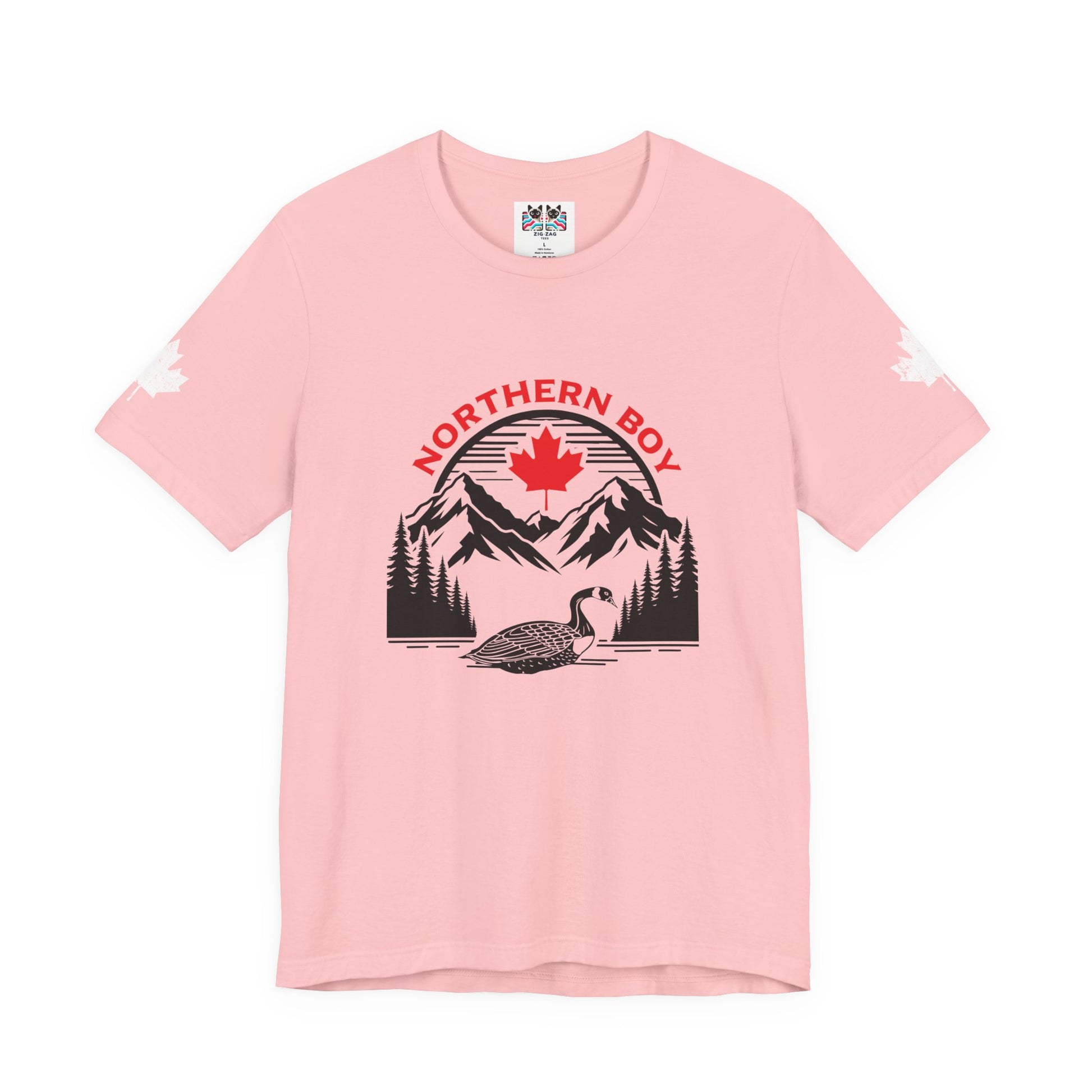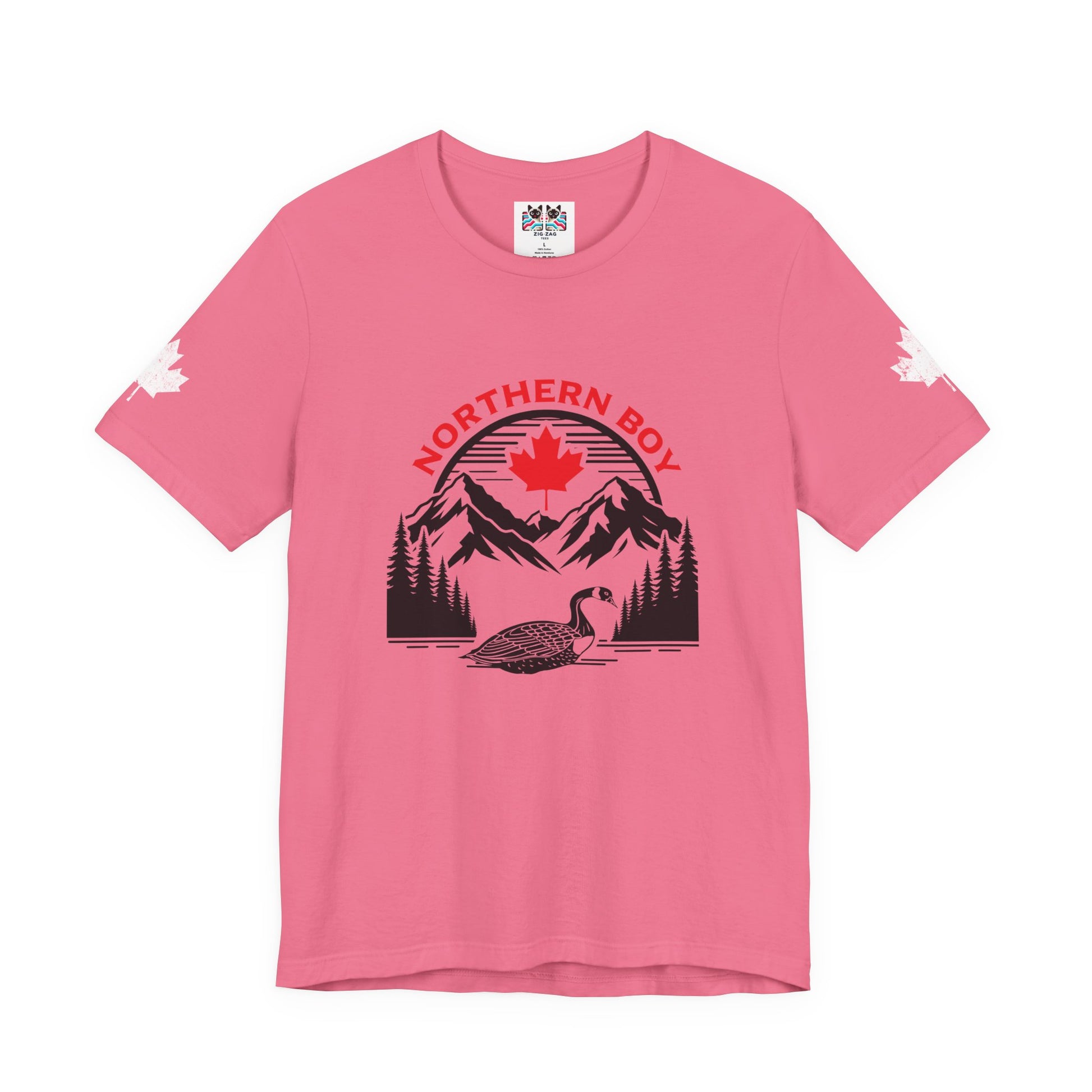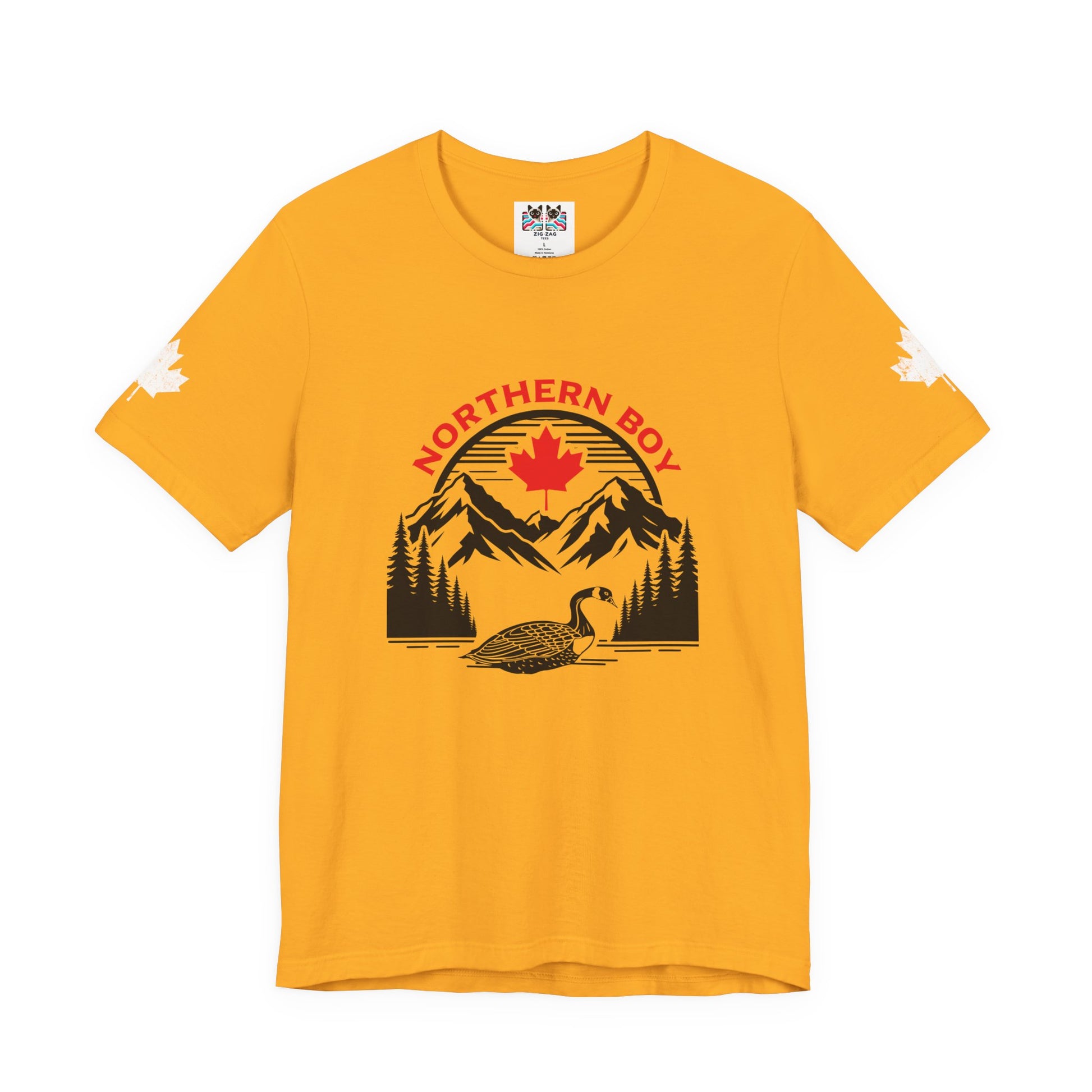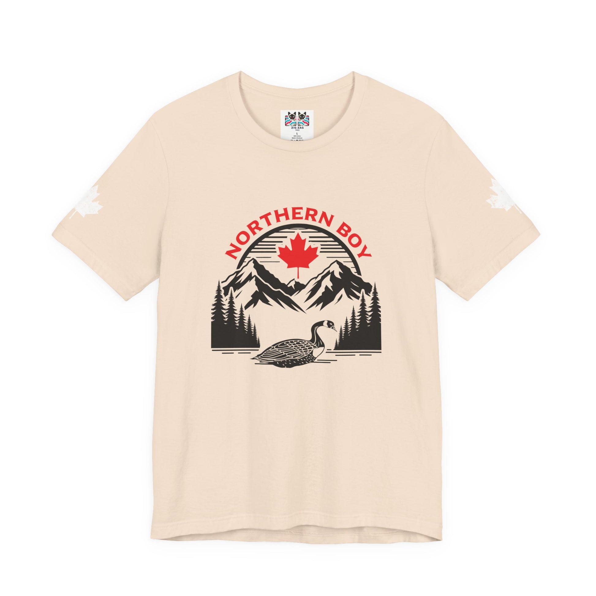 Celebrate the spirit of the north with this striking t-shirt featuring a Canadian Goose peacefully floating on a lake surrounded by mountains and forest. A large red maple leaf tops the mountain peak, with an iconic arch connecting the two mountain tips, emphasizing the majesty of Canada’s wilderness. The prominent "Northern Boy" text adds a masculine touch, making this tee a great choice for outdoor enthusiasts, nature lovers, and proud Canadians. Soft and comfortable, it’s perfect for casual wear or adventures in the true north.