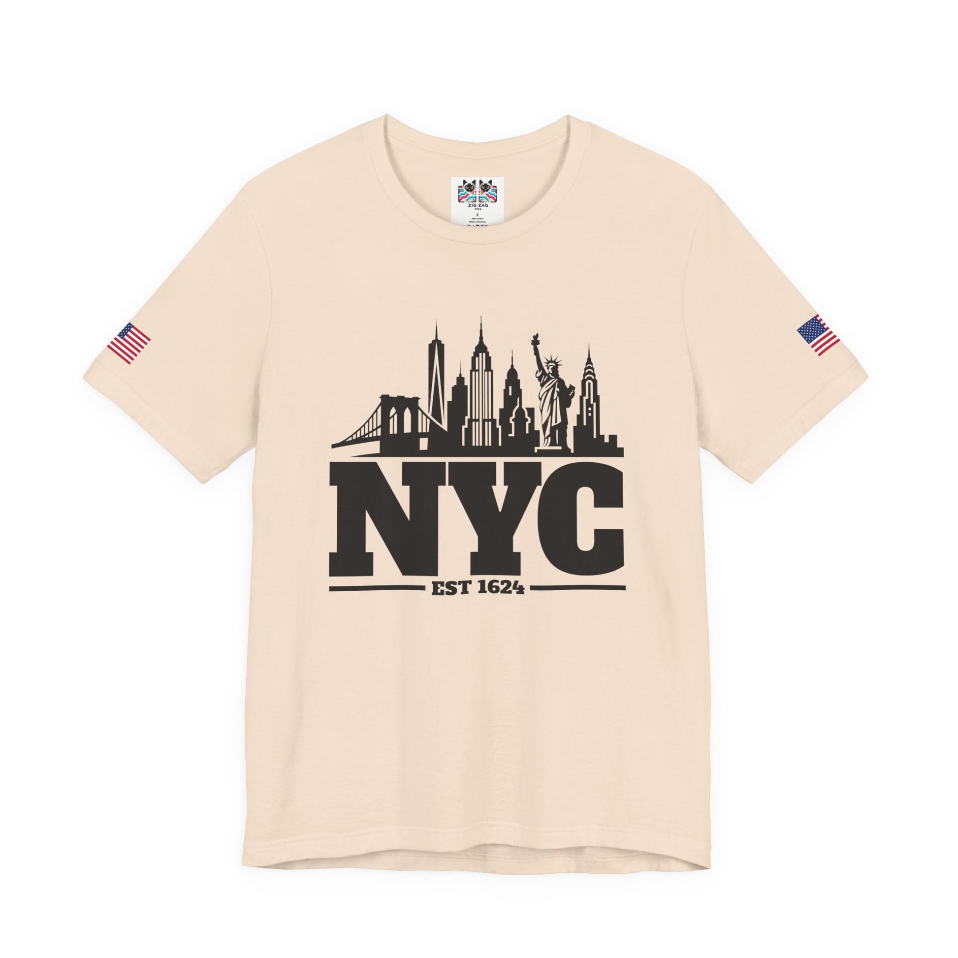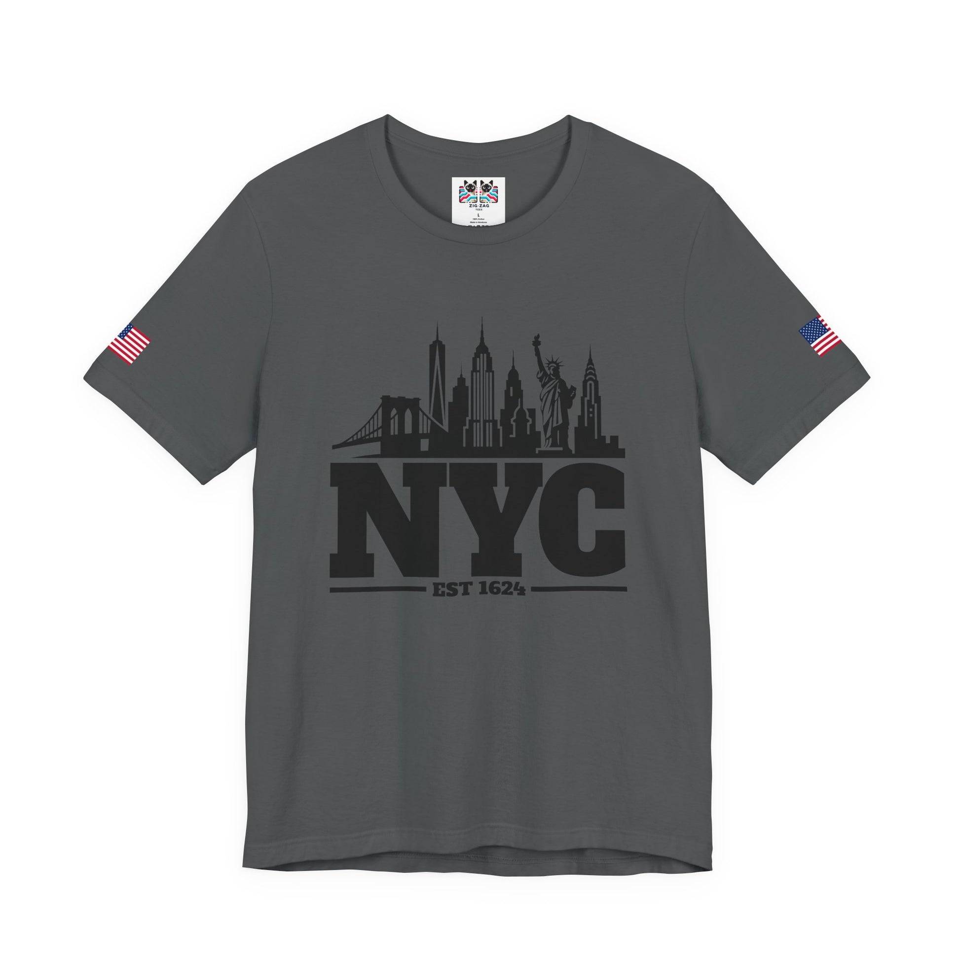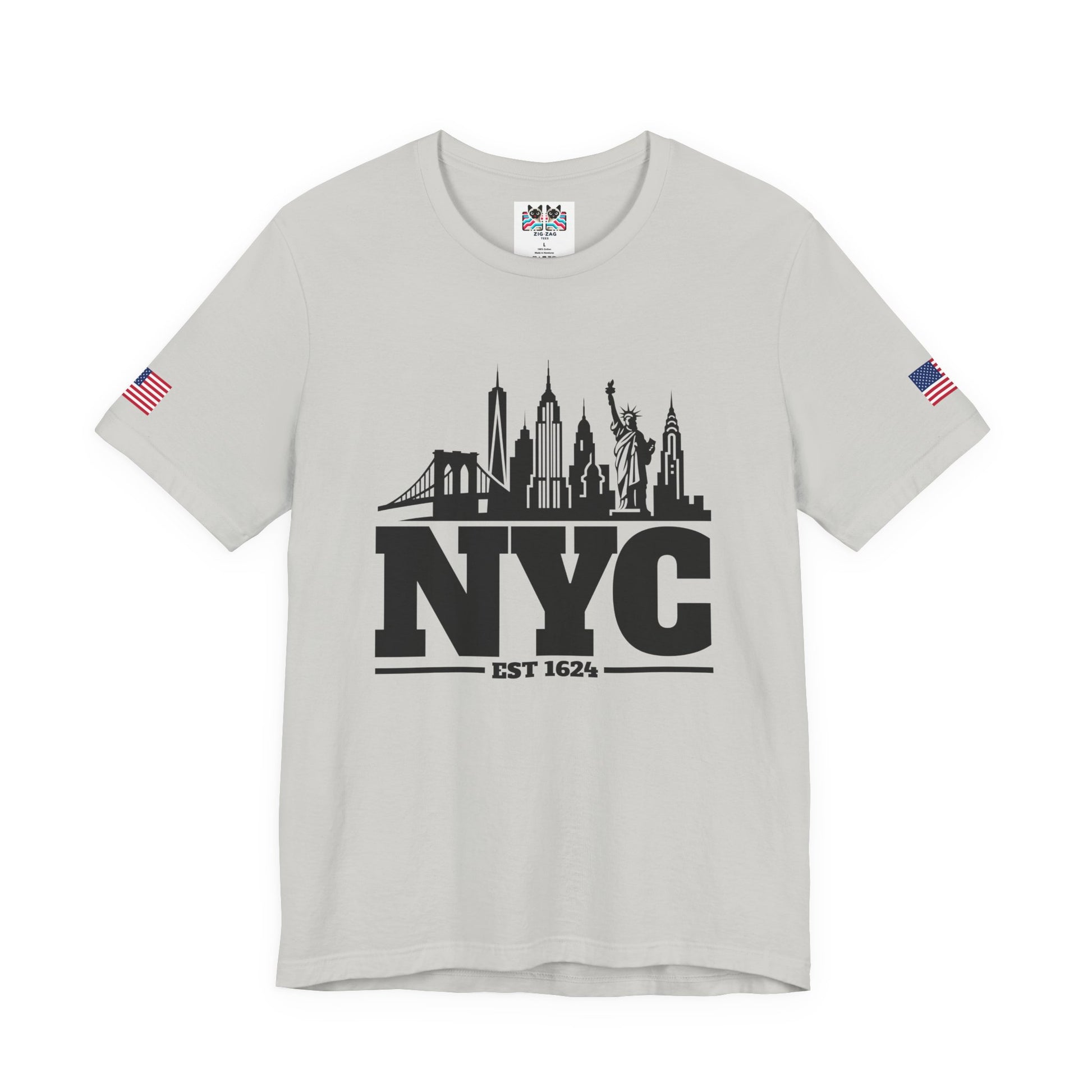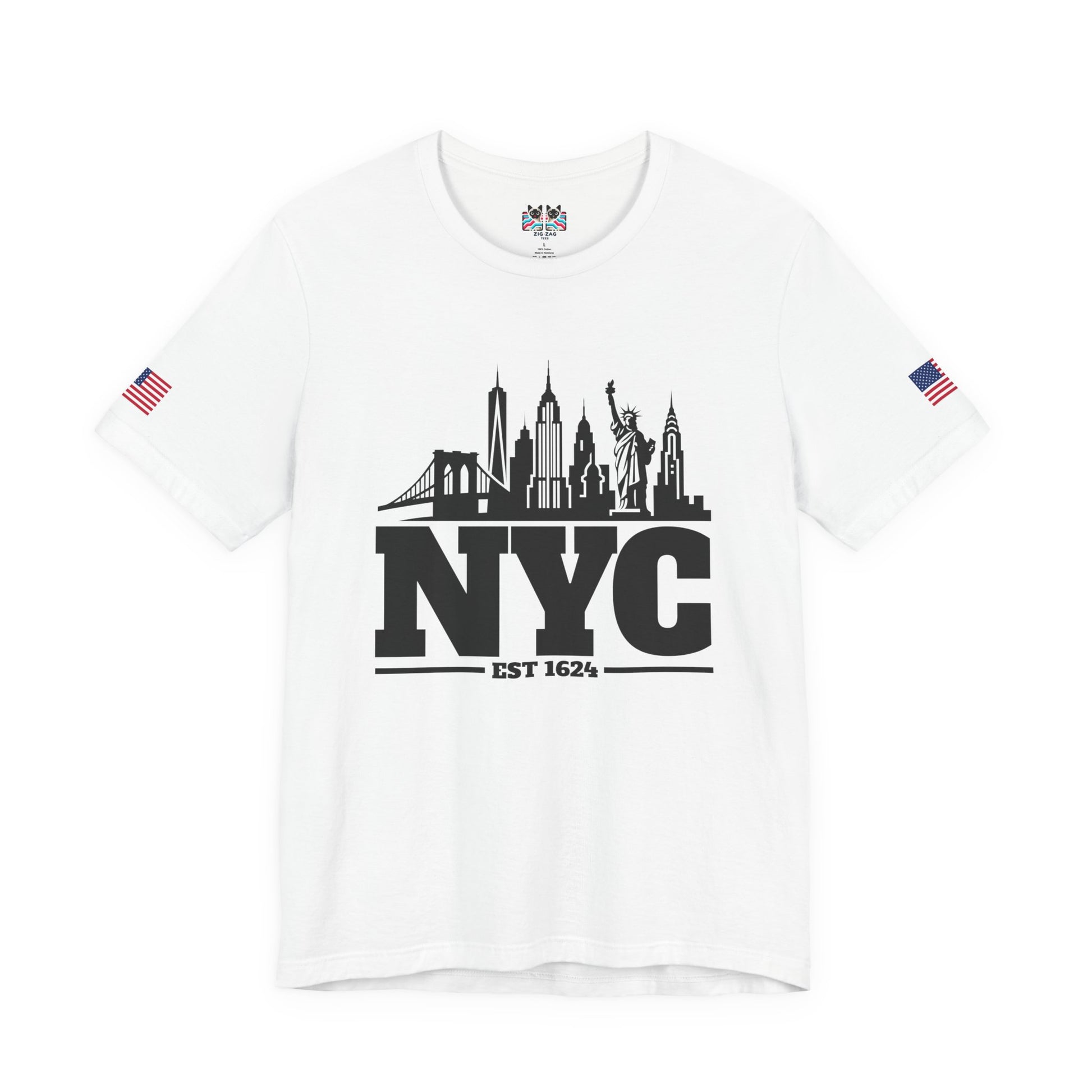Keep it classic with this bold black and white NYC skyline silhouette t-shirt! The minimalist design features "NYC EST 1624" in large letters with the iconic Manhattan skyline incorporated as a silhouette, including One World Trade Center (Freedom Tower), Empire State Building, Chrysler Building, Brooklyn Bridge, and the Statue of Liberty. The clean, simple black-on-white design creates maximum visual impact and timeless style. Perfect for minimalist fashion lovers, modern NYC enthusiasts, urban professionals, or anyone who appreciates clean graphic design and New York City pride. This white t-shirt with American flag sleeve patches works for any occasion - casual everyday wear, business casual Fridays, travel, or as a versatile NYC souvenir. The silhouette style is sophisticated yet bold, making it ideal for both young professionals and classic style enthusiasts who want to represent NYC with understated elegance.
