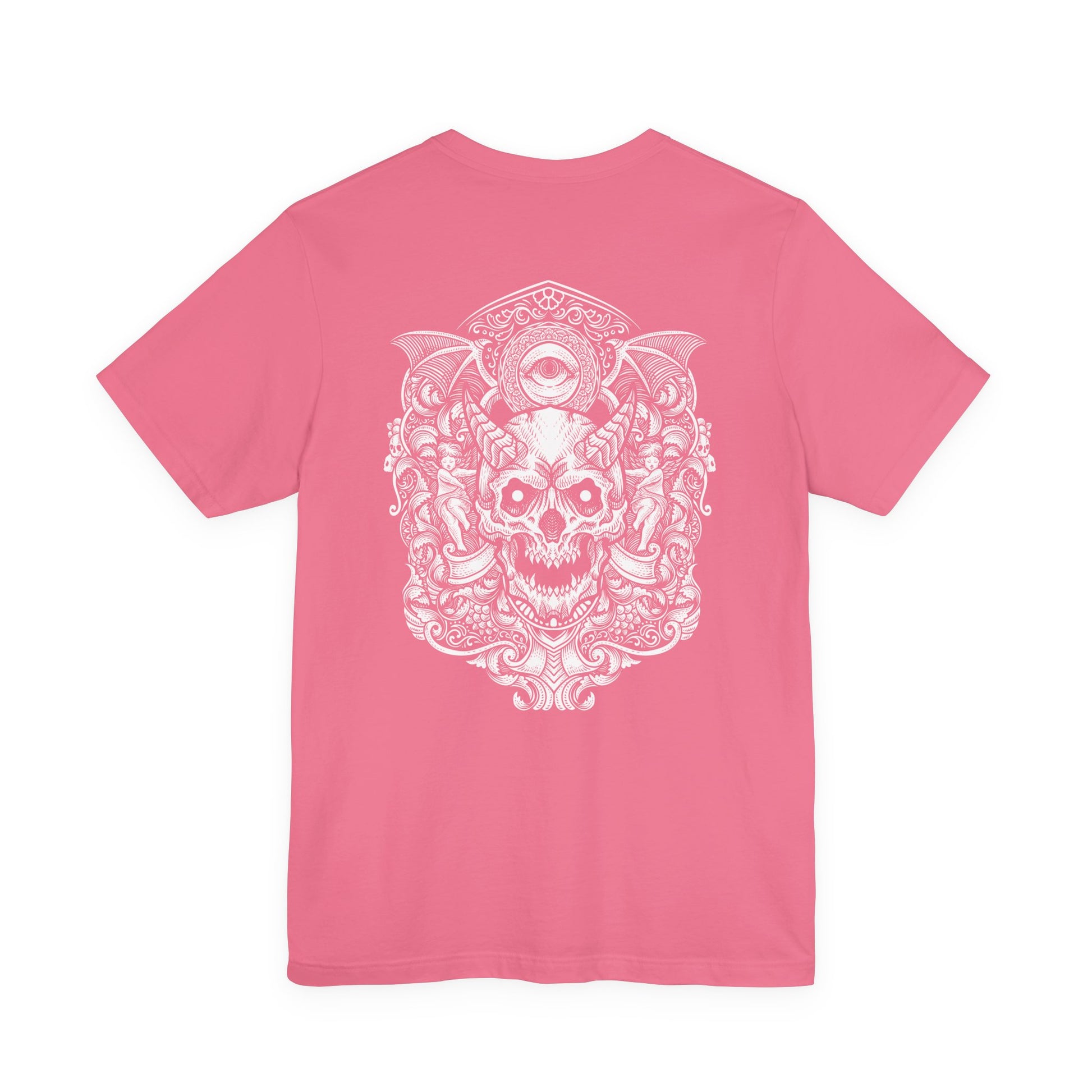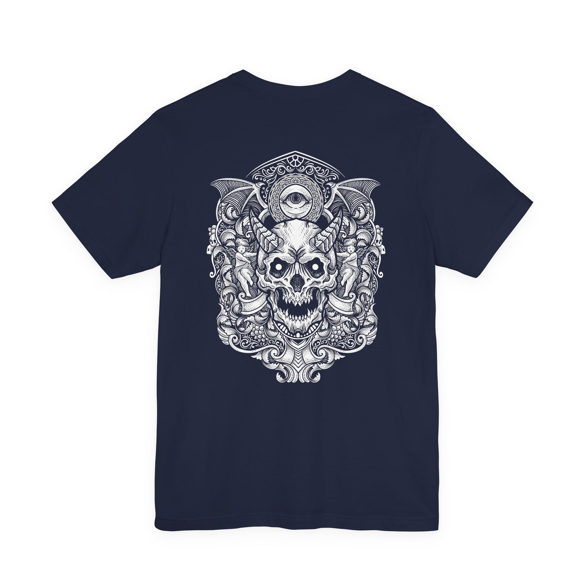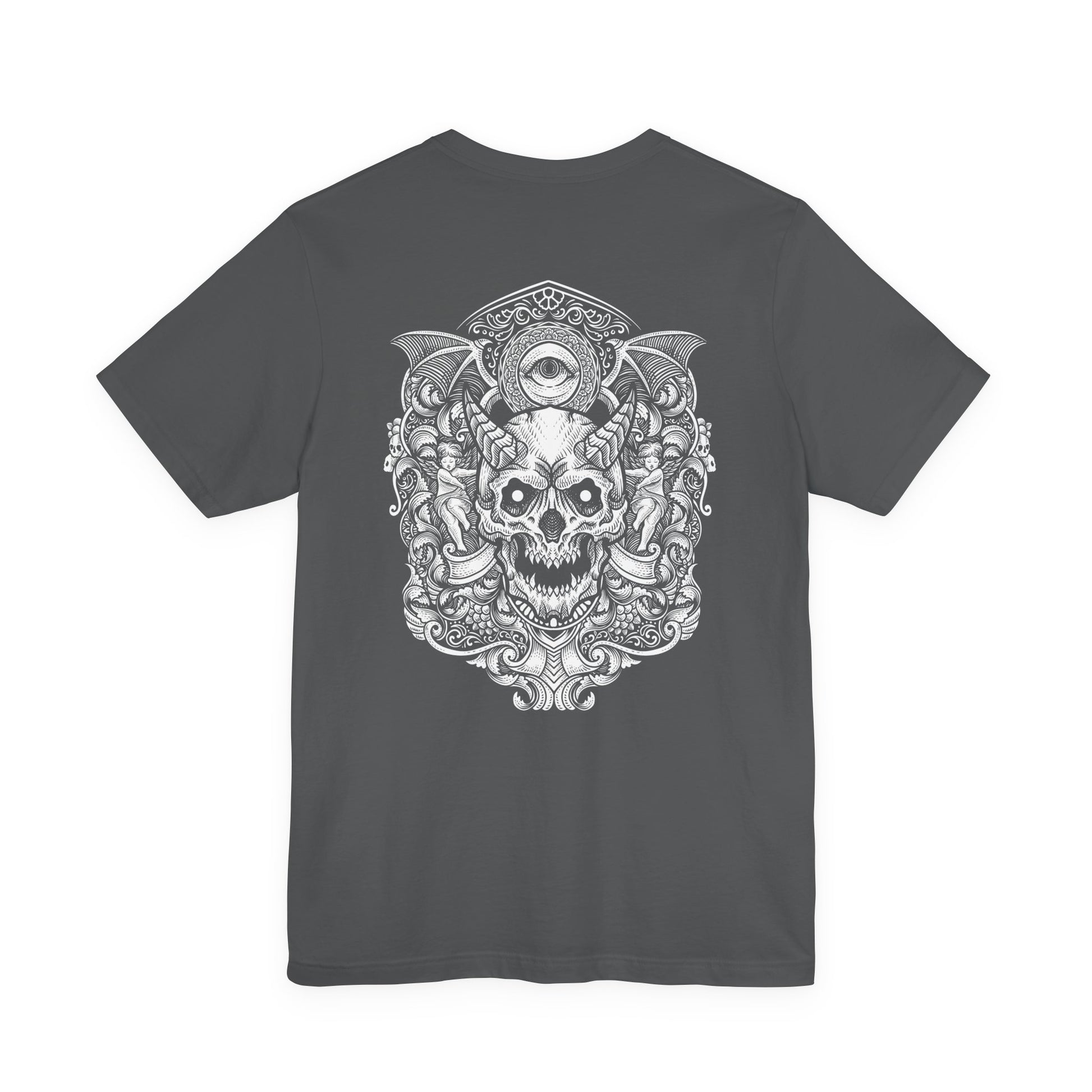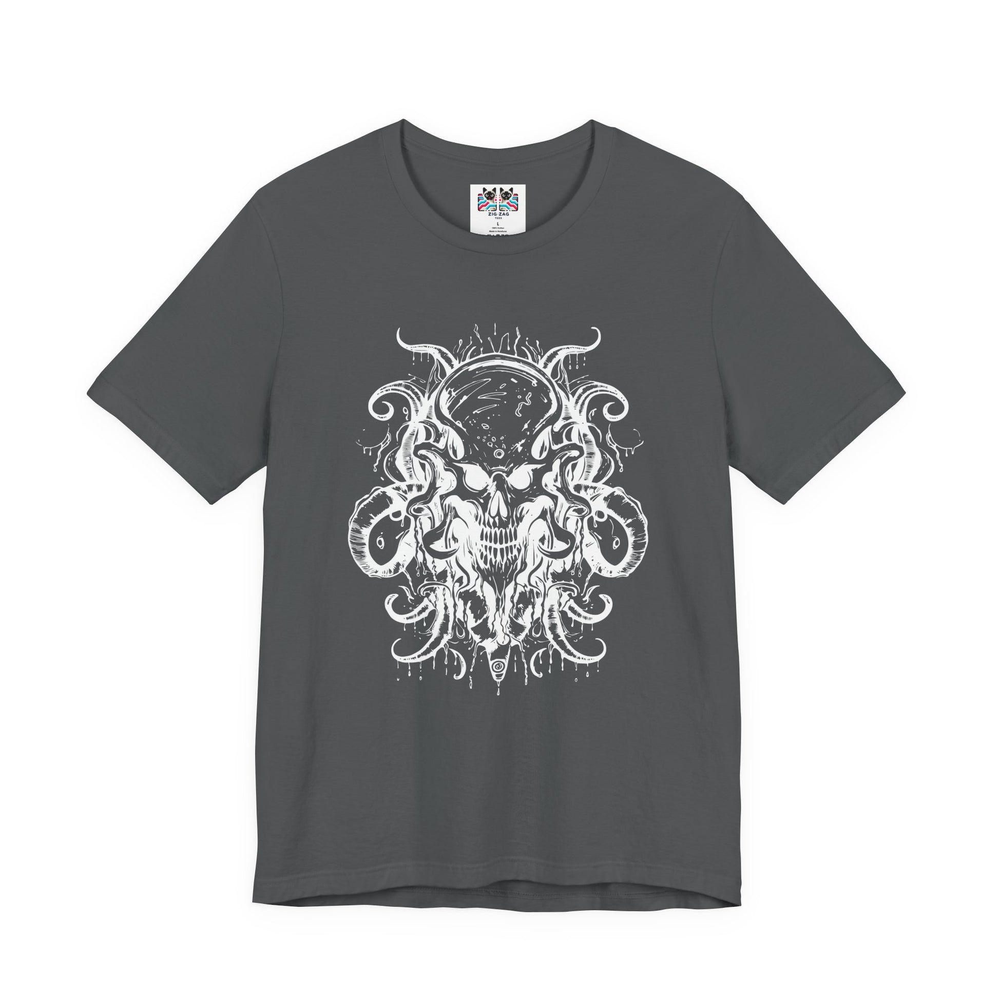 Add dark mystic vibes to your wardrobe with this occult skull t-shirt featuring a twisted horned skull and swirling tentacle-like details on the front, creating a haunting abstract design. The back showcases an elaborate ornamental skull crest with horns, bat wings, an all-seeing eye, and intricate filigree for a powerful gothic statement piece. Perfect for metalheads, goth fashion lovers, and fans of occult and tattoo-style art, this graphic tee is ideal for concerts, festivals, or everyday macabre style.