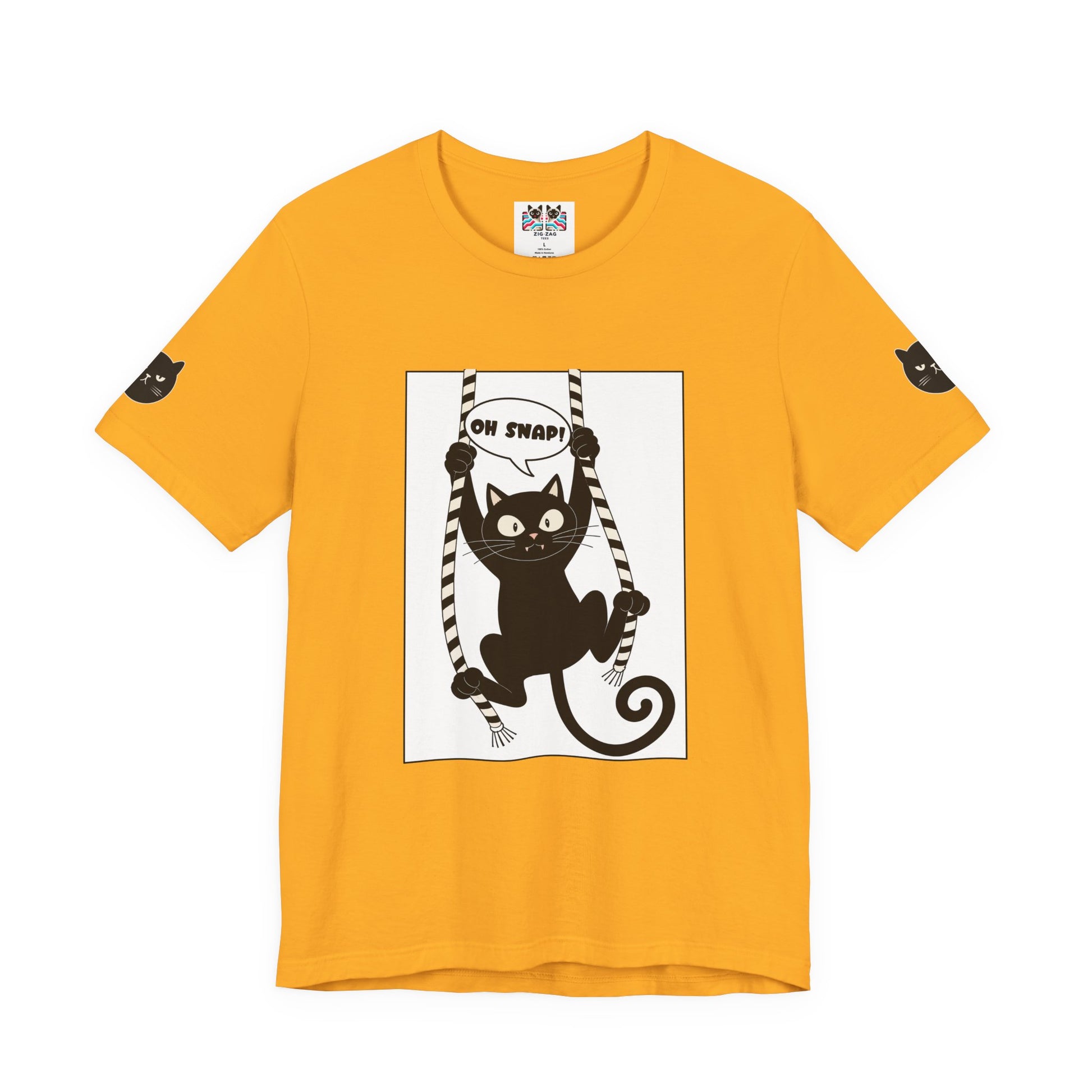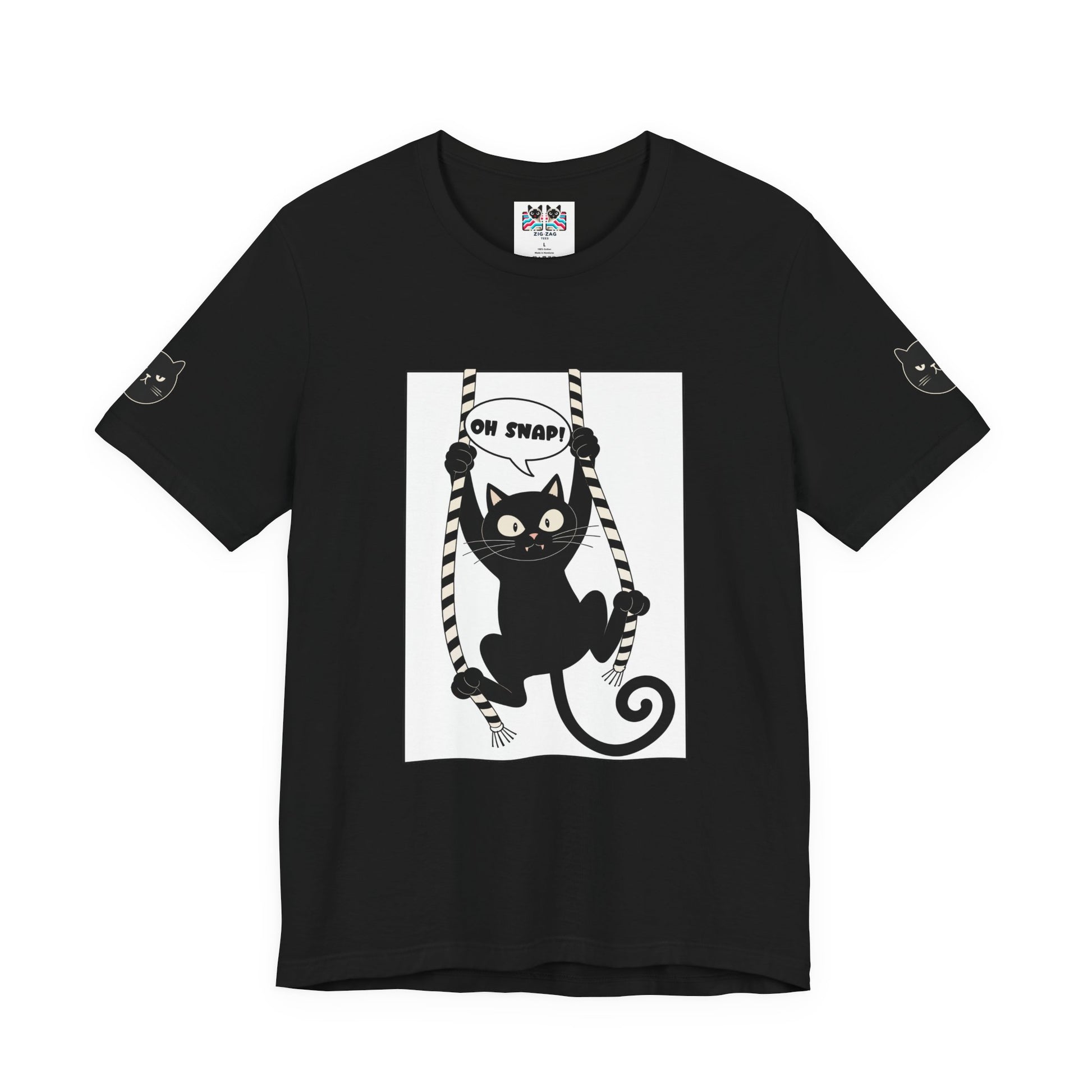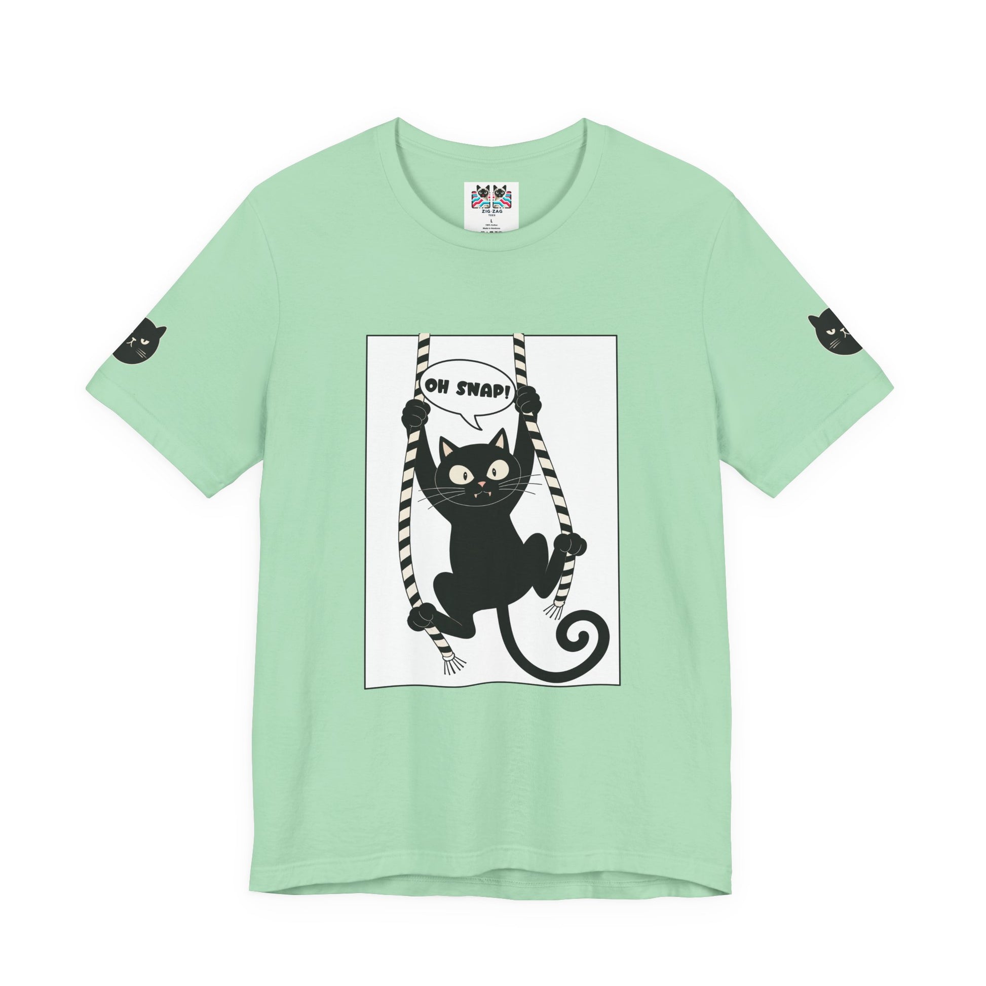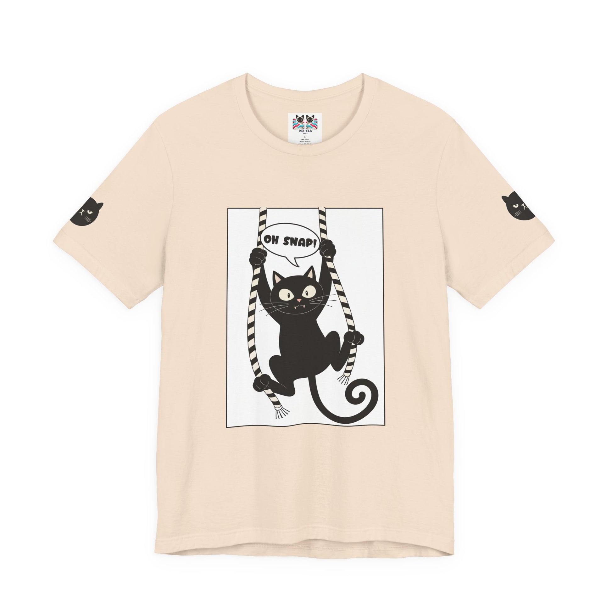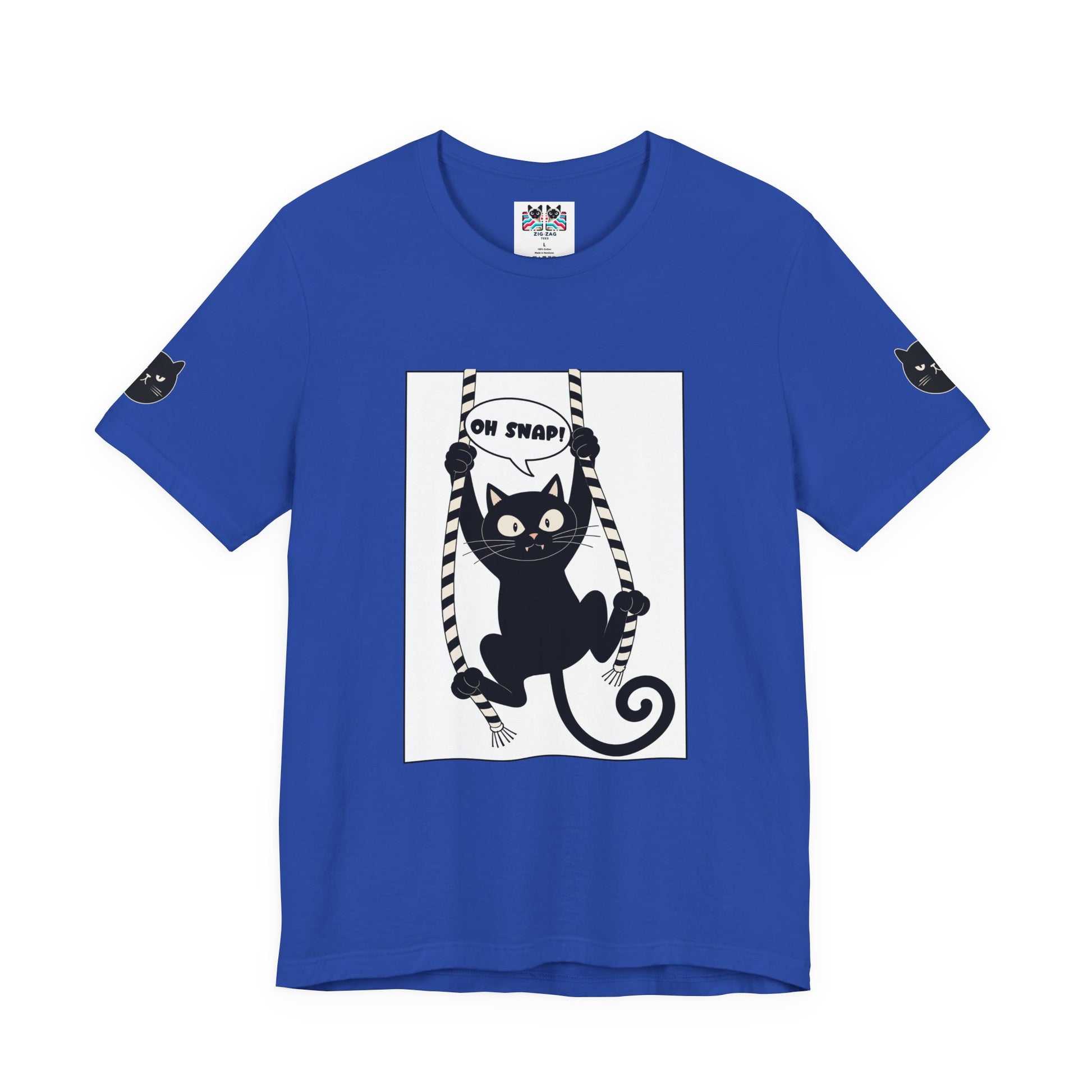 The phrase "Oh Snap!" works on multiple levels—the cat's realization that they're in trouble, the sound of breaking blinds, and the owner's reaction when discovering the latest cat catastrophe. This tee celebrates the unpredictable, often destructive, but always entertaining nature of living with cats who think they own the place (because they do).