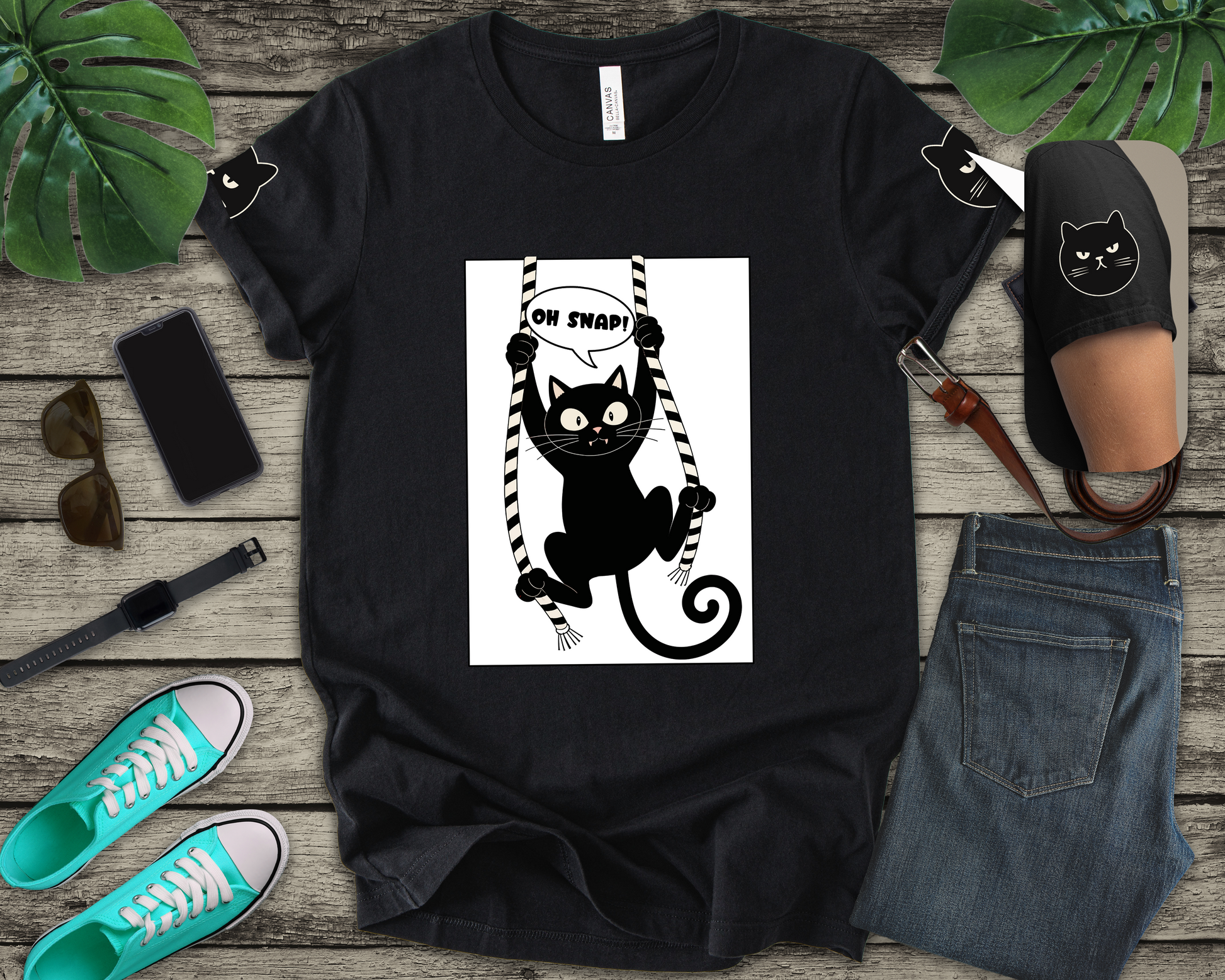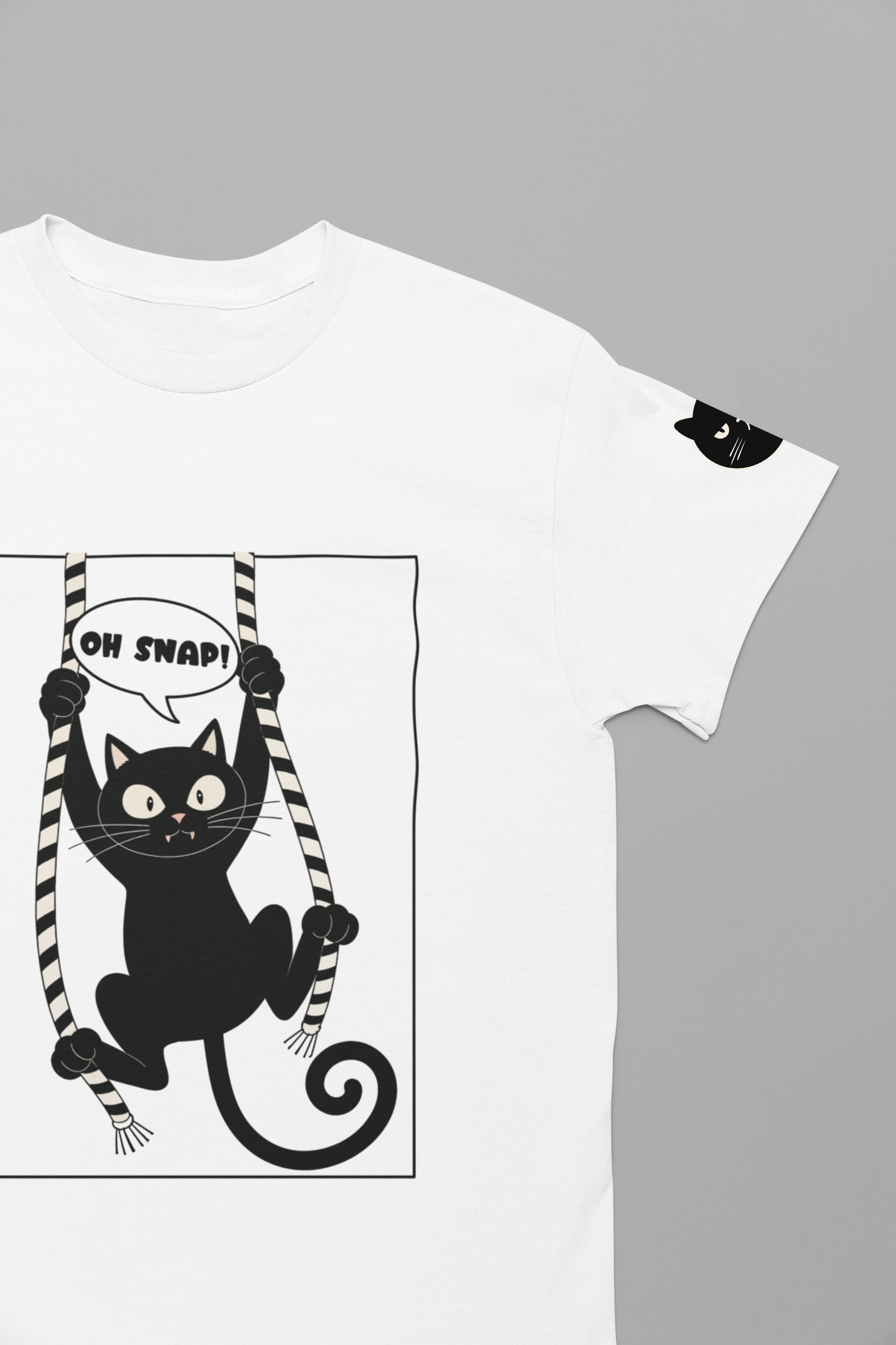 Capture the chaos of cat ownership with this hilarious "Oh Snap!" t-shirt featuring a mischievous black cat hanging desperately from window blinds with wide-eyed panic. This relatable design perfectly depicts that moment every cat owner knows—when your feline friend gets into trouble and immediately regrets their life choices. The simple black and white illustration on a white panel creates maximum comedic impact.