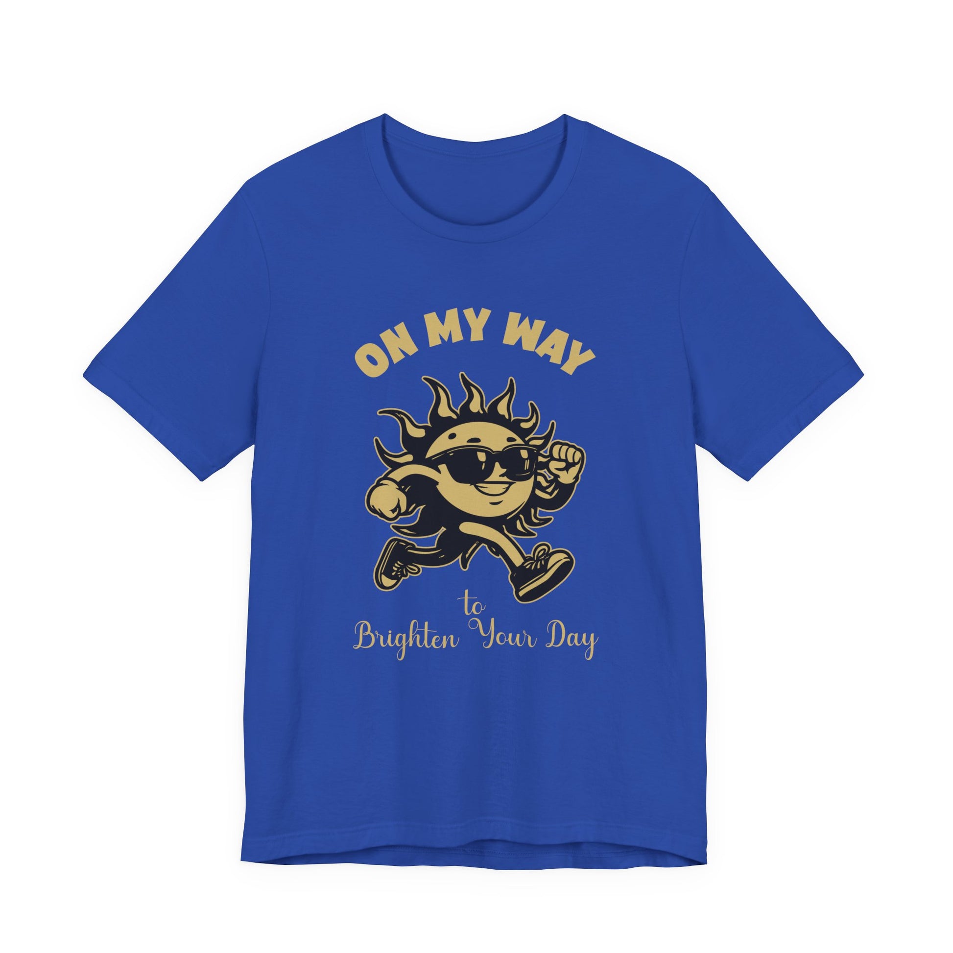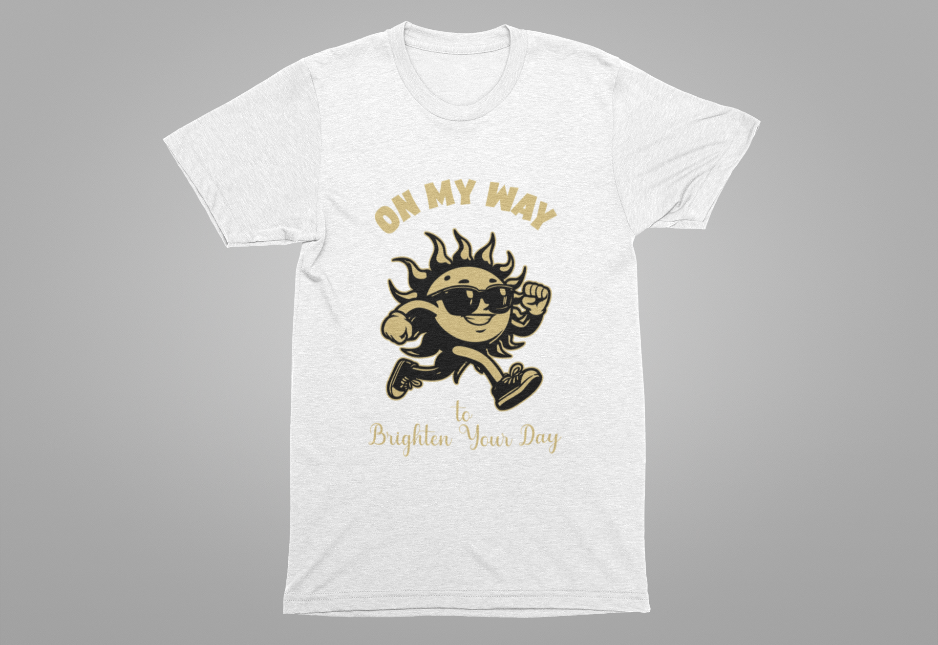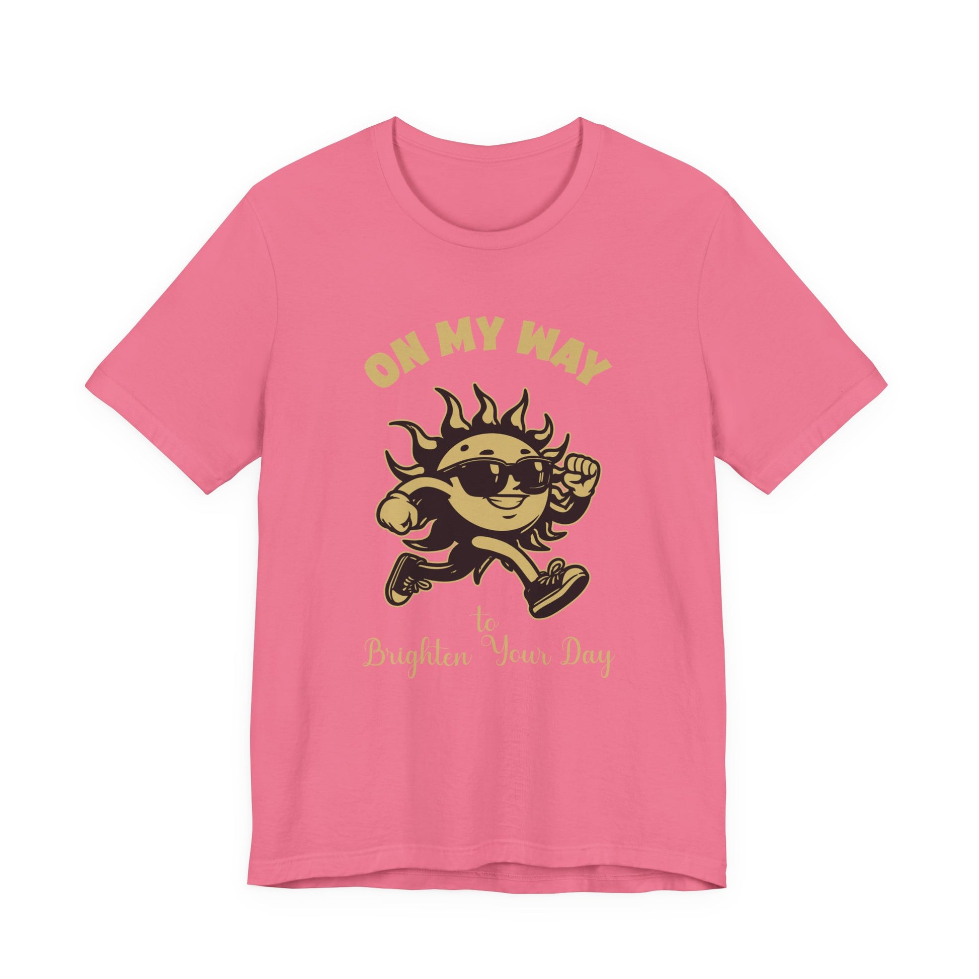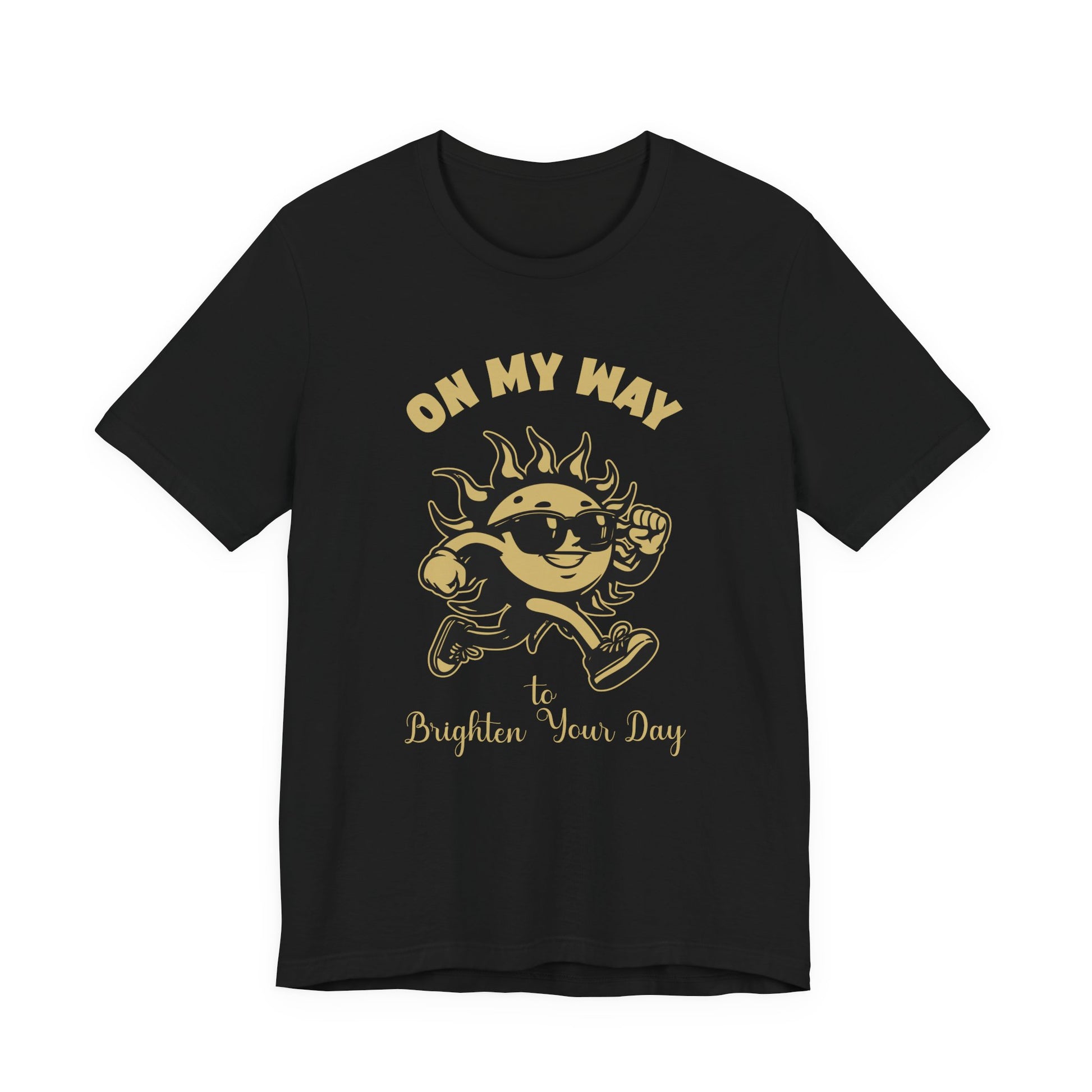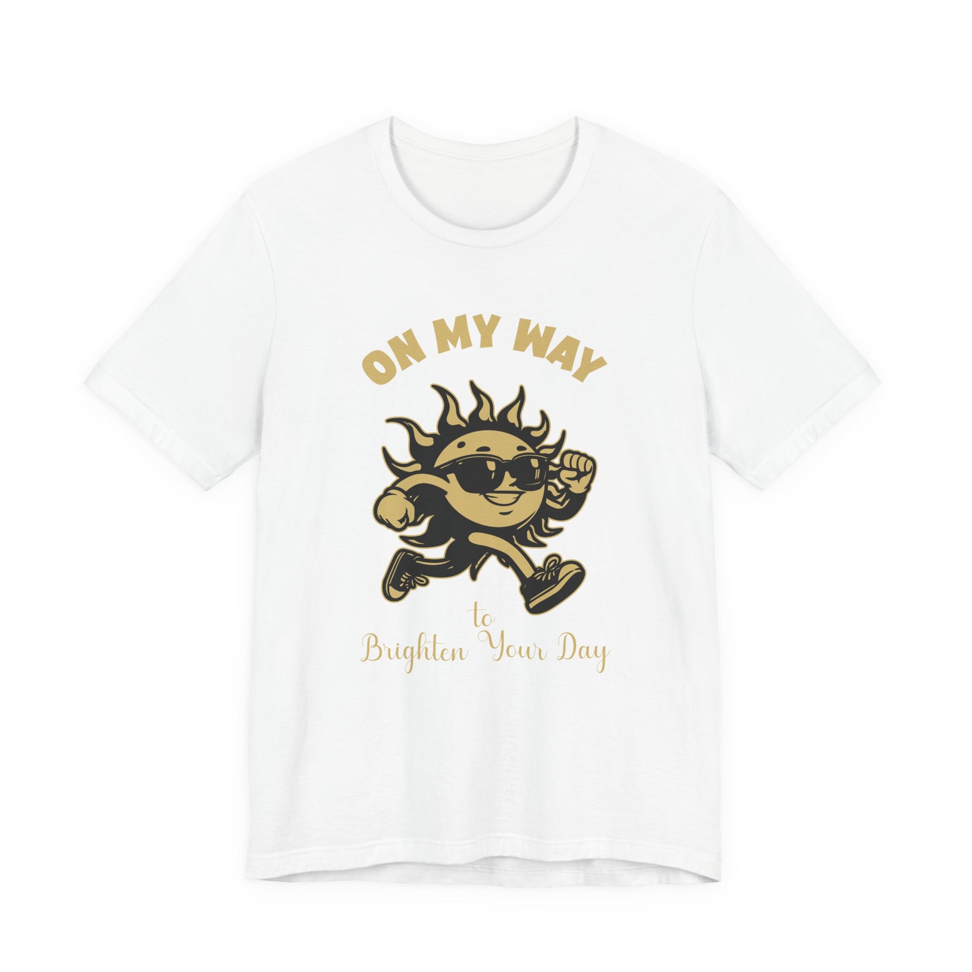 Bring sunshine wherever you go with this cheerful T-shirt showcasing a sun character running forward wearing sunglasses and shoes, accompanied by the uplifting phrase “On My Way to Brighten Your Day.” Perfect for spreading positive vibes and energy, this tee adds a dose of brightness to any outfit. Ideal for casual wear, gifts, or anyone who loves playful, happy designs.