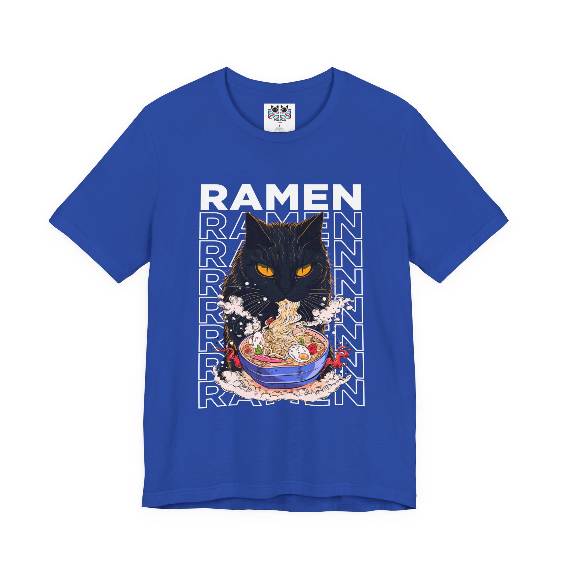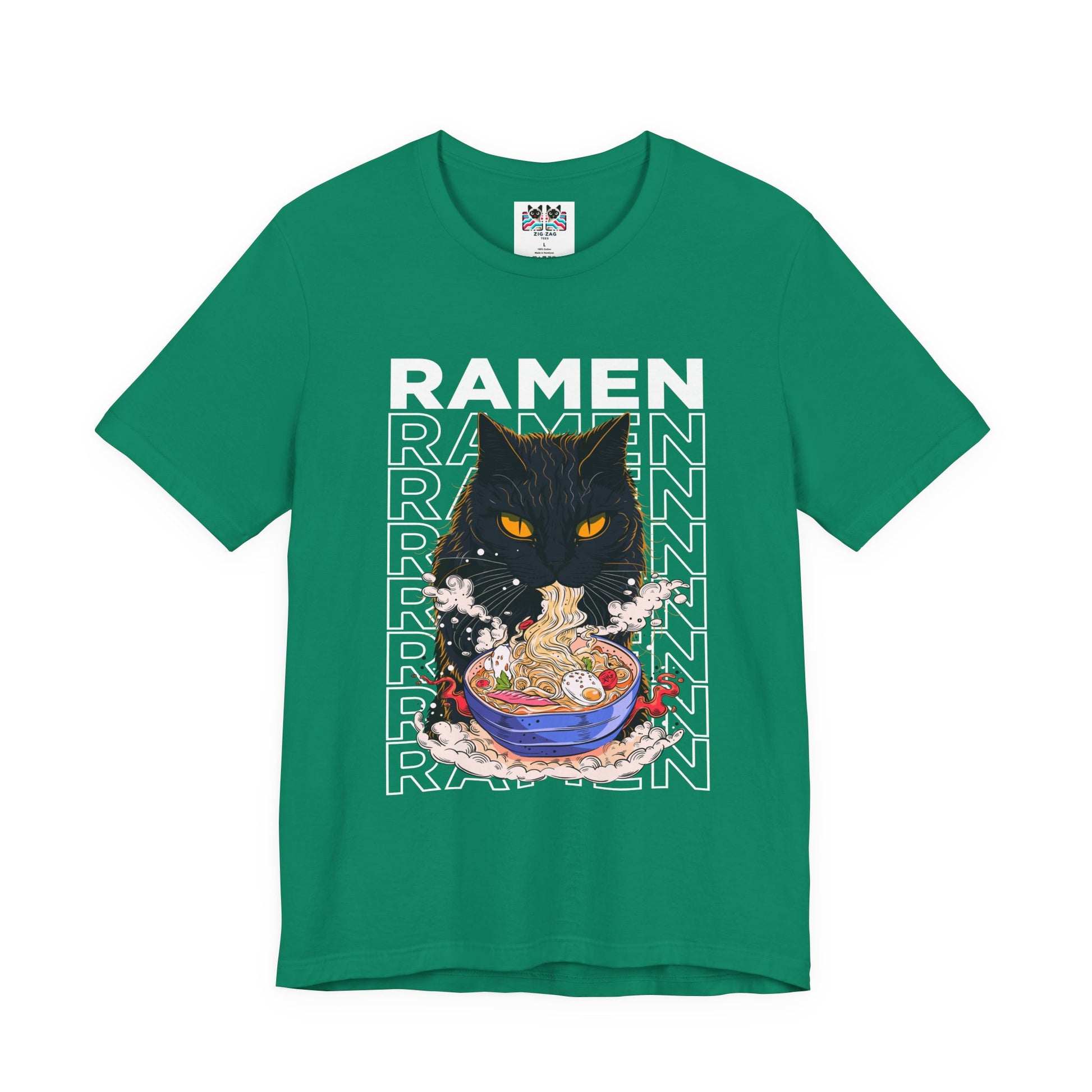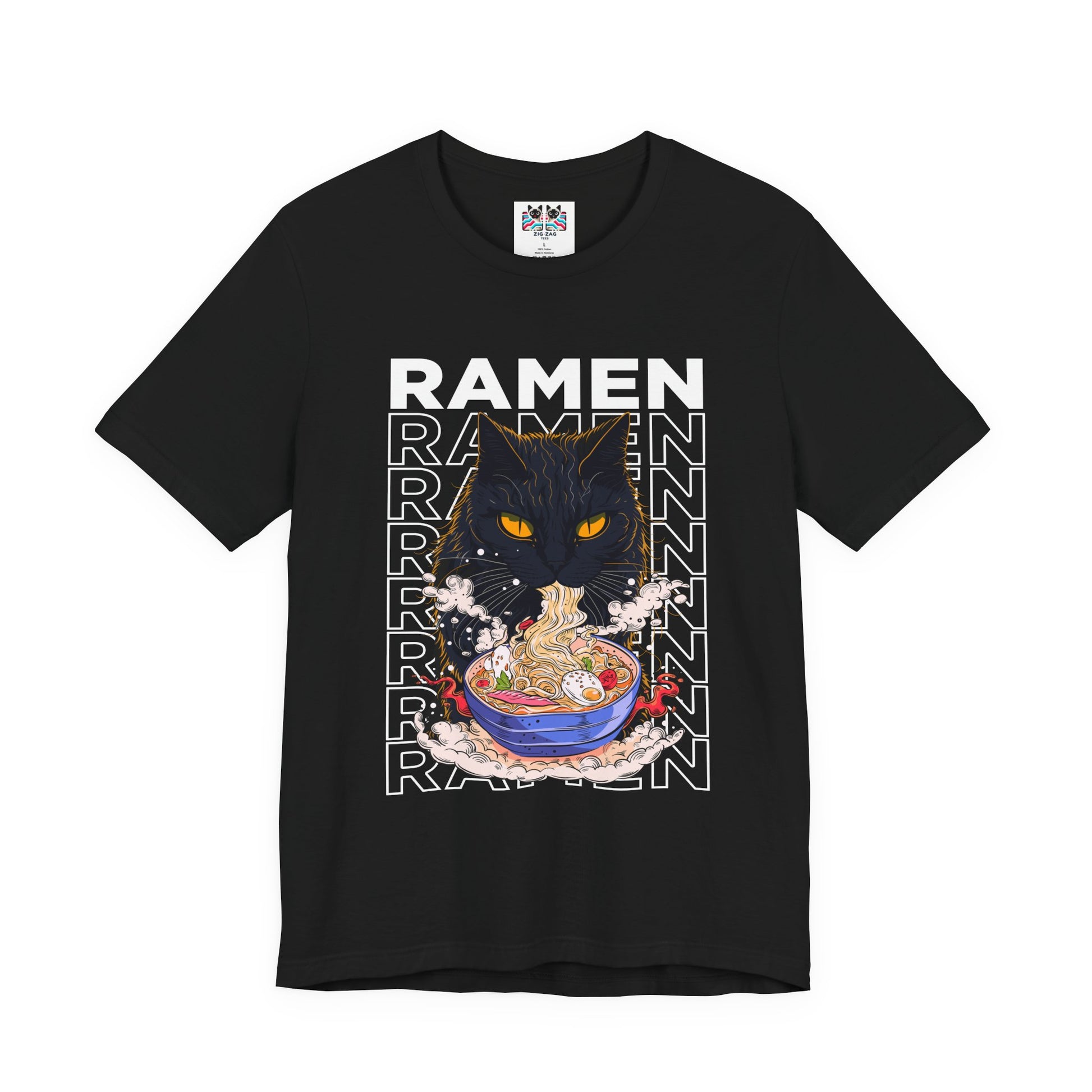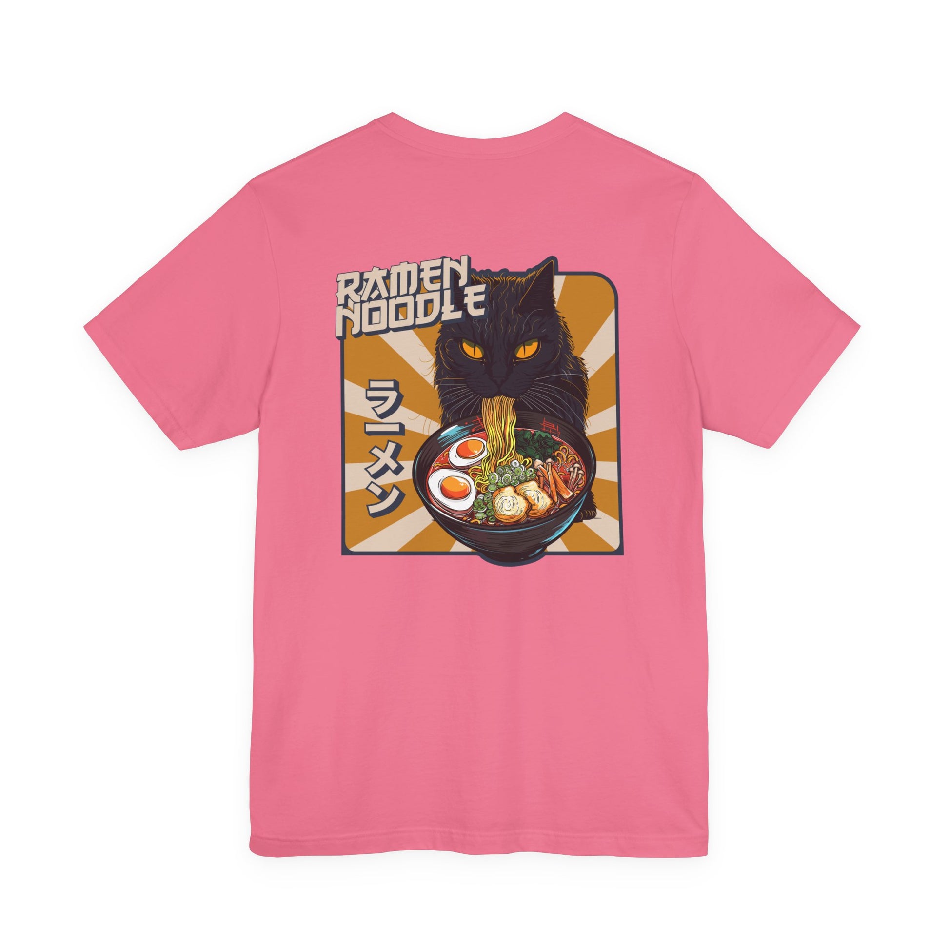 Slurp in style with this fun ramen cat t-shirt featuring a black cat devouring a steaming bowl of ramen with bold “RAMEN” text stacked behind it on the front. The back shows the same intense kitty guarding a detailed bowl of ramen with rising sun rays and “Ramen Noodle” text plus Japanese lettering for an authentic street-food vibe. Perfect for ramen addicts, cat lovers, anime fans, and Japanese food enthusiasts, this graphic tee is great for food runs, festivals, and everyday kawaii streetwear.