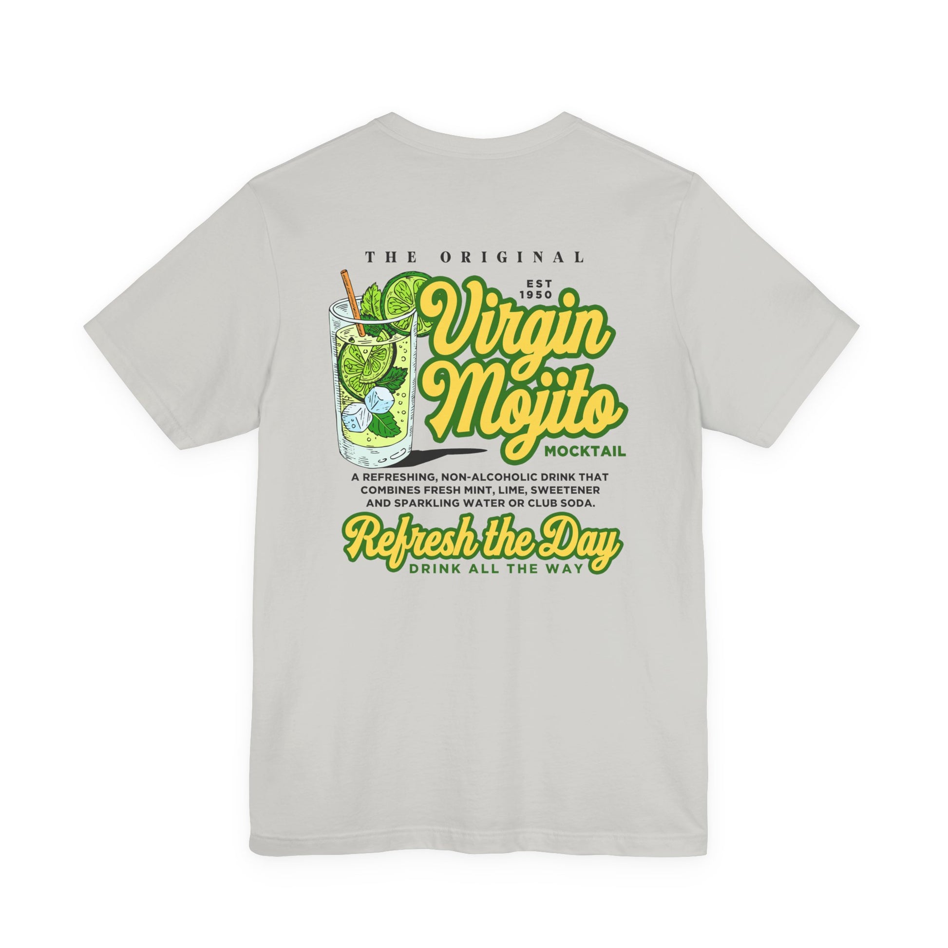 Celebrate the zesty, alcohol-free vibes of a Virgin Mojito with this vibrant mocktail graphic tee featuring a detailed mojito glass packed with mint leaves, ice, and a lime slice garnish, plus bold text “Virgin Mojito mocktail” across the glass. At the bottom, large playful typography reads “Refreshing the day, Drink all the way,” with a small line of drink details highlighting its fresh lime, mint, and sparkling fizz for a cool, relaxed look perfect for summer, parties, or sober social nights.
