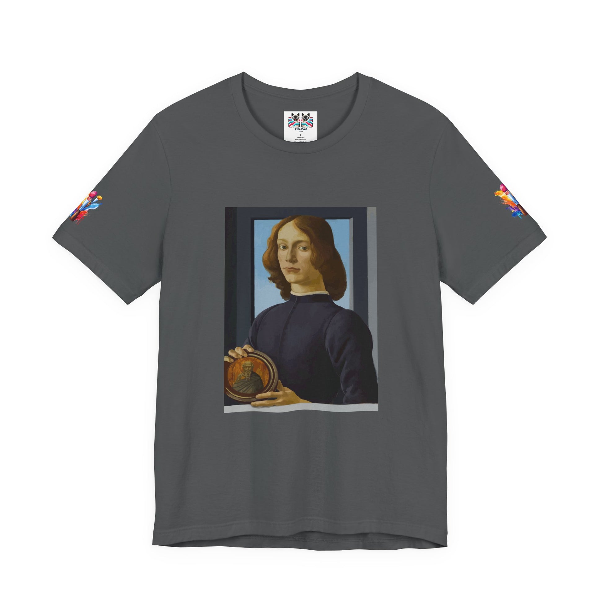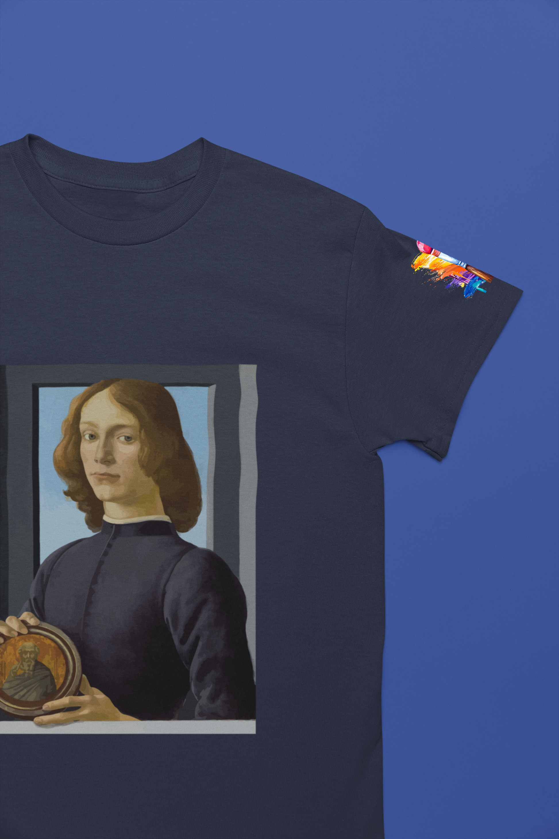 Step into the elegance of the Italian Renaissance with this exquisite portrait art t-shirt. This design features a refined 15th-century portrait of a young man in noble dress, holding a circular medallion containing a religious or classical image. The painting exemplifies the Renaissance ideals of humanism, classical revival, and technical mastery with its careful attention to fabric texture, realistic features, and symbolic objects.