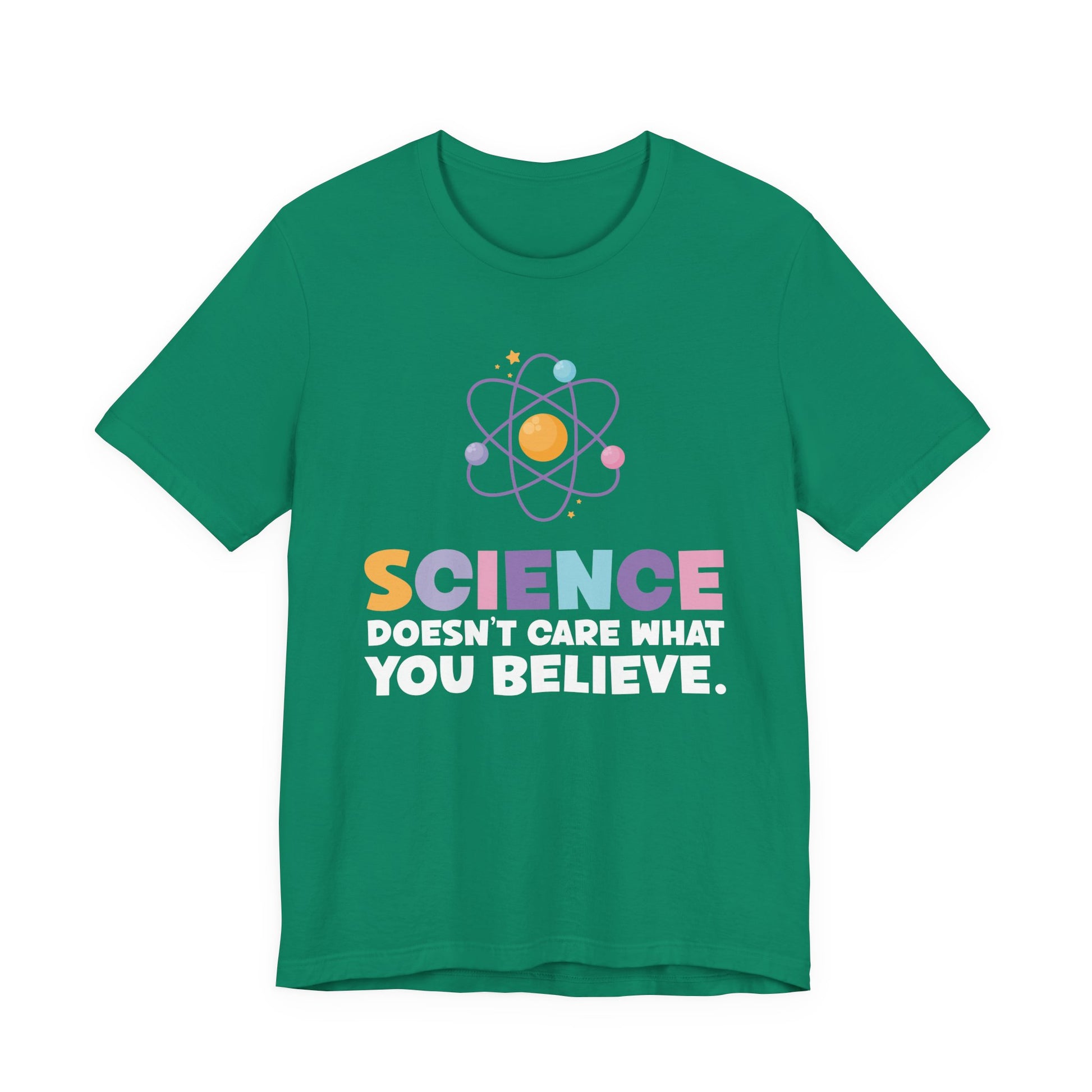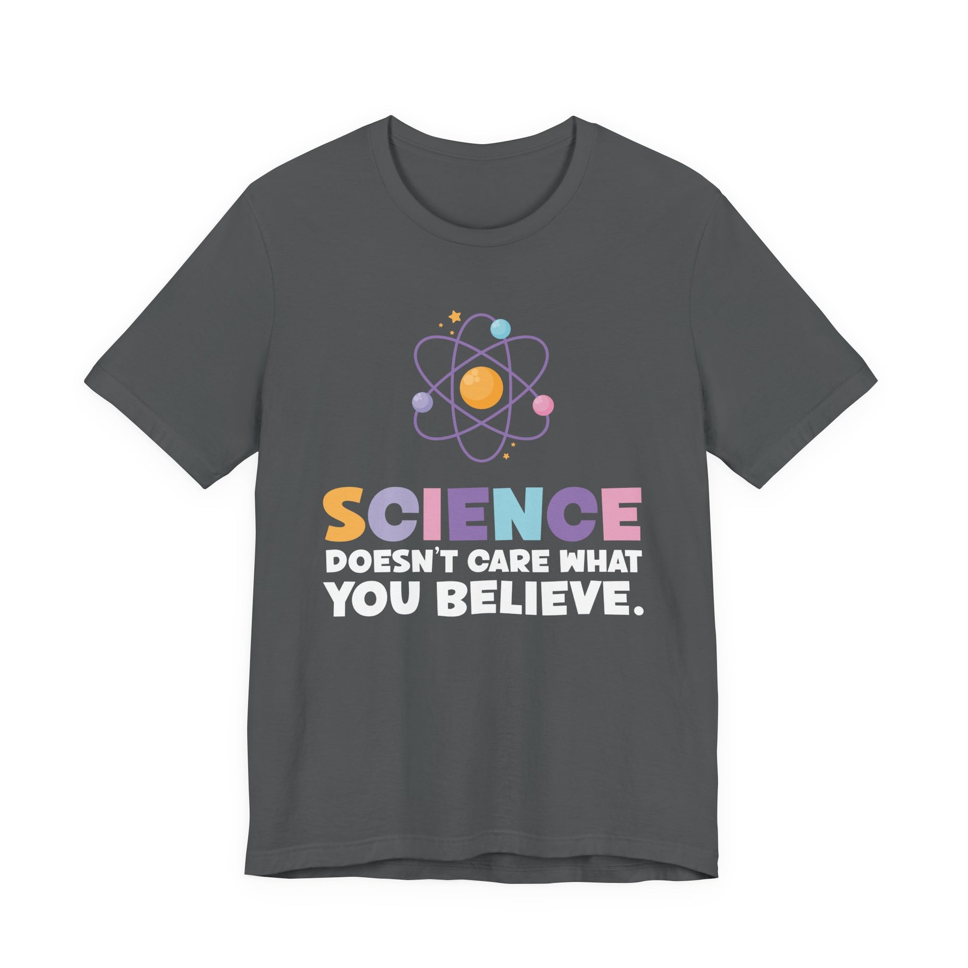 Science Doesn’t Care What You Believe T-Shirt – Atom Graphic STEM Statement Tee