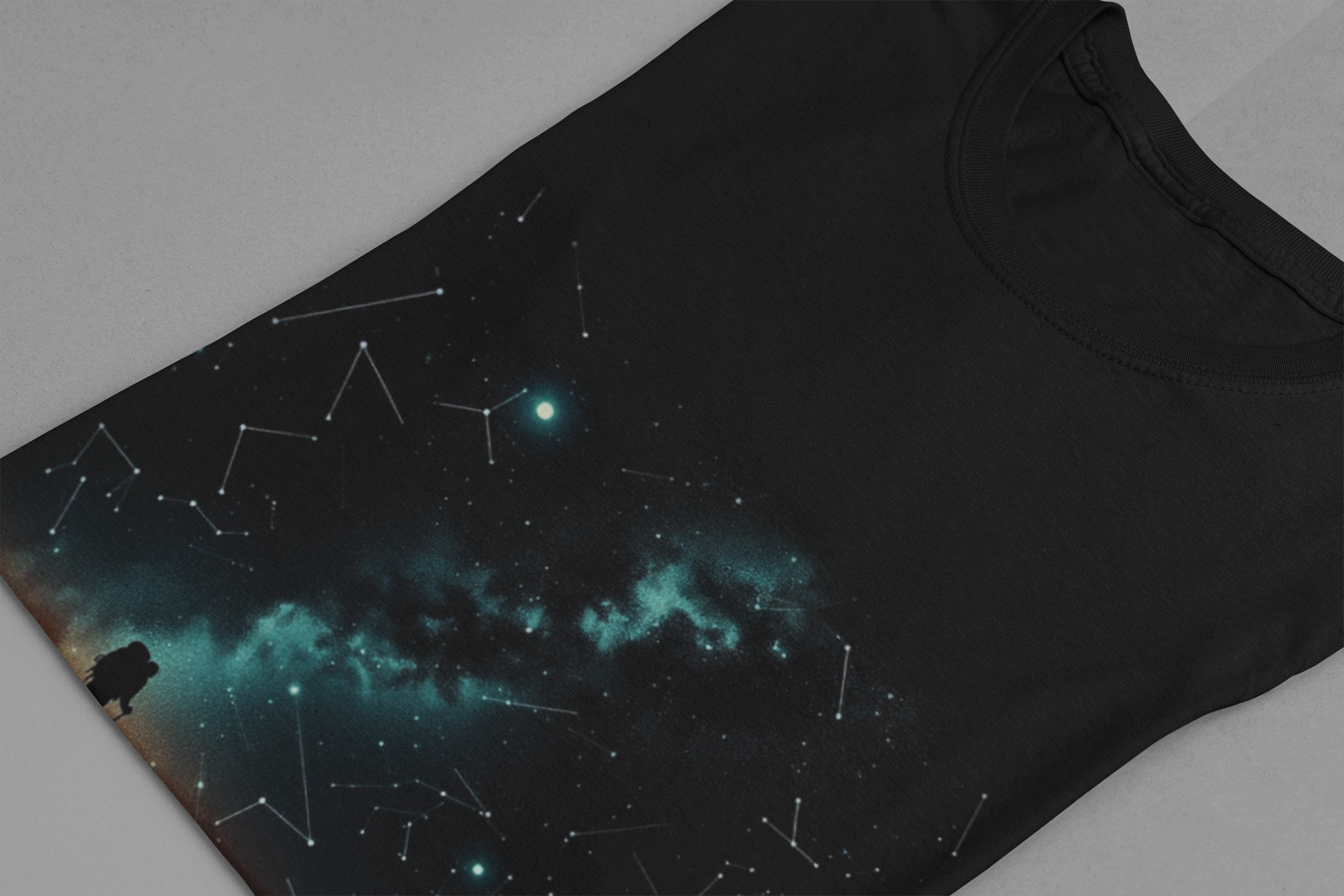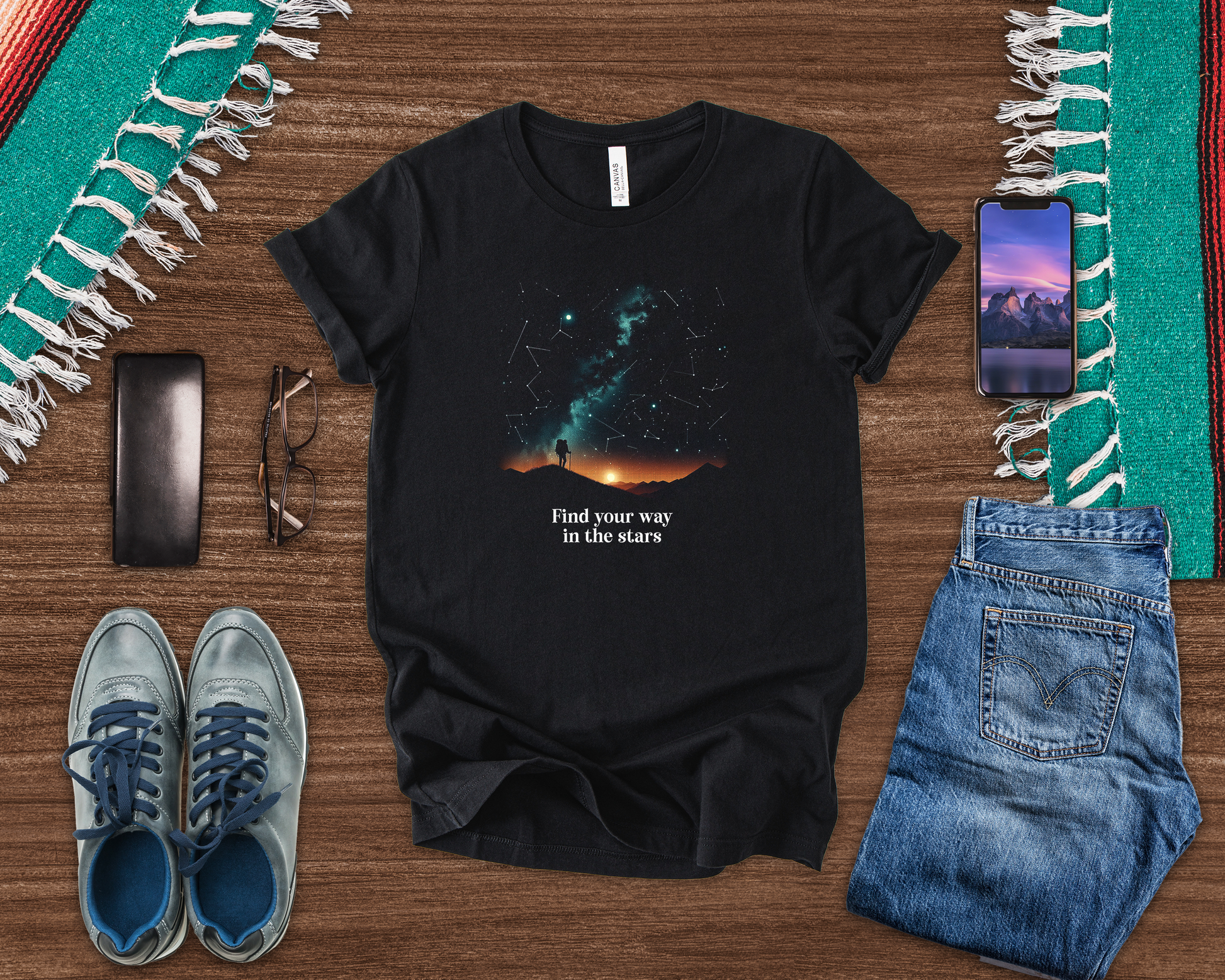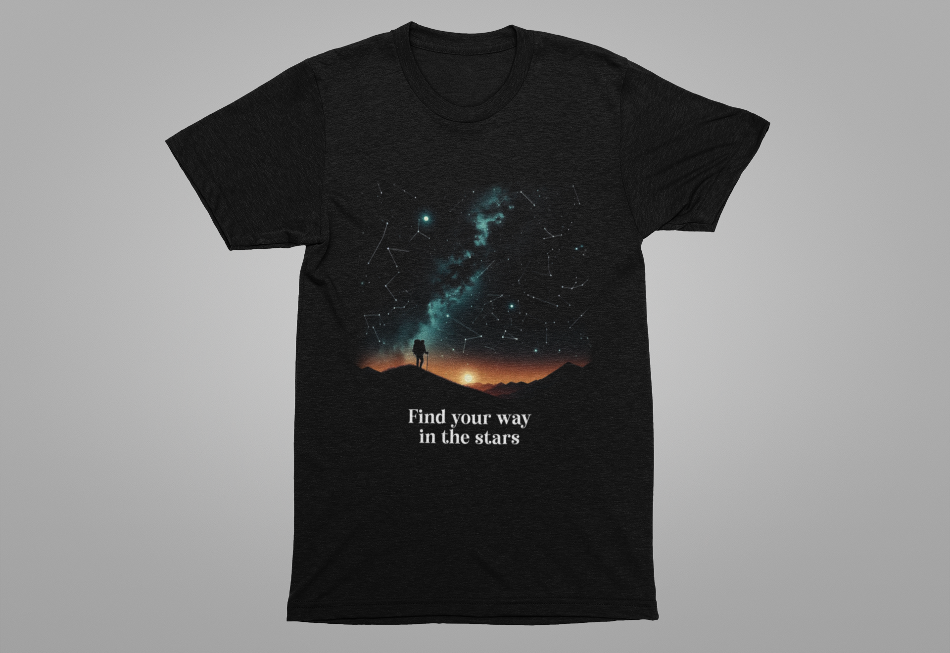There’s magic in the stillness of a star-filled sky and this design captures that perfectly. With constellations guiding the path and a lone hiker standing in awe, this tee speaks to dreamers, stargazers, and wanderers at heart. Find your way and don’t forget to look up. #FindYourWay #StarryNightVibes #StargazerStyle #NightHikeMagic #CosmicJourney #AdventureInTheStars