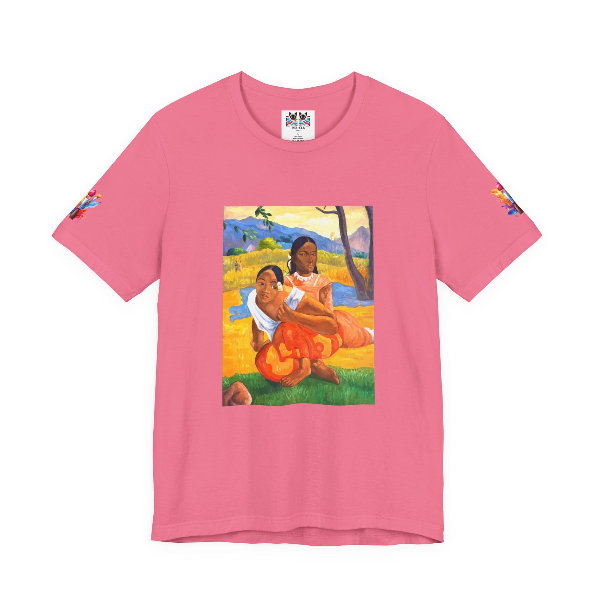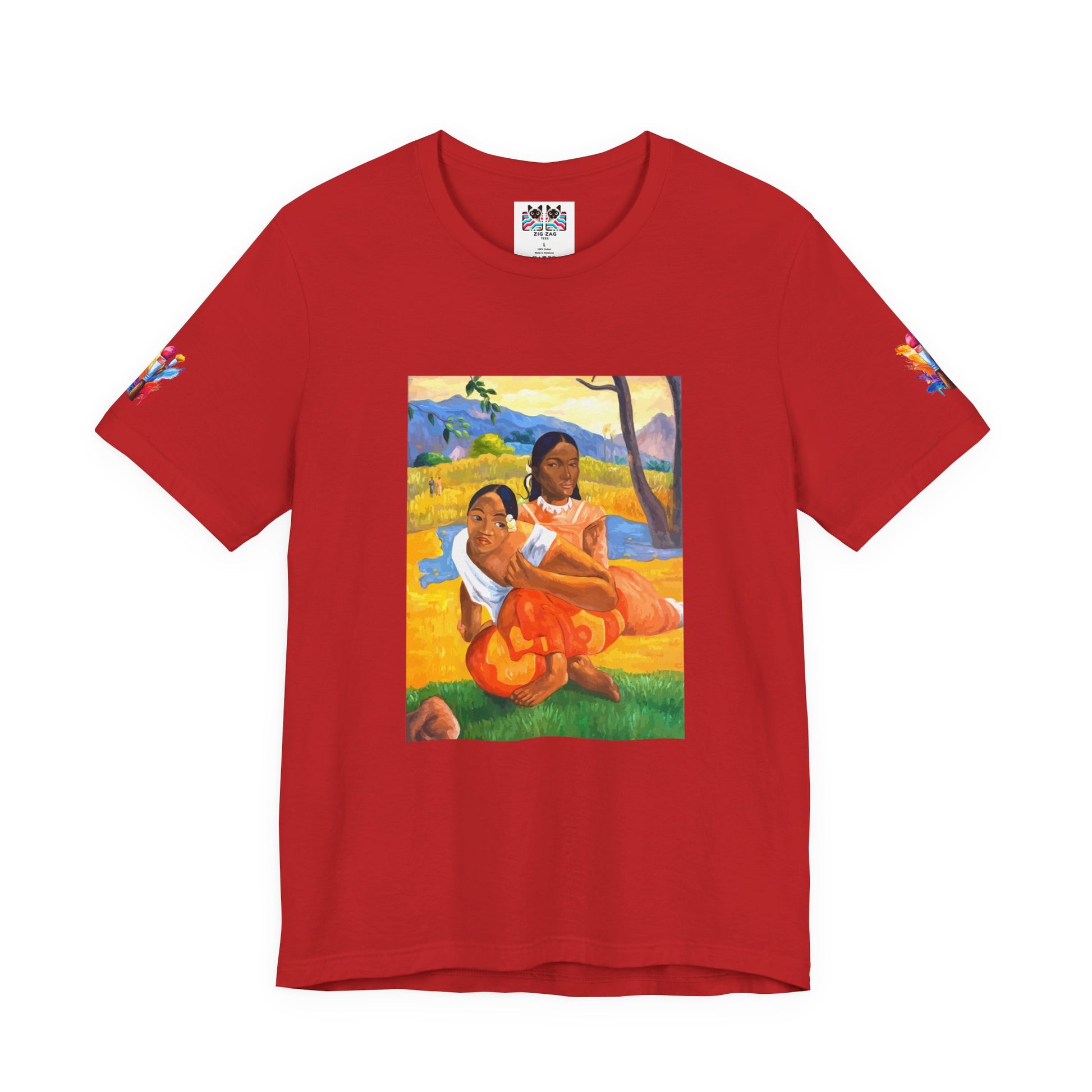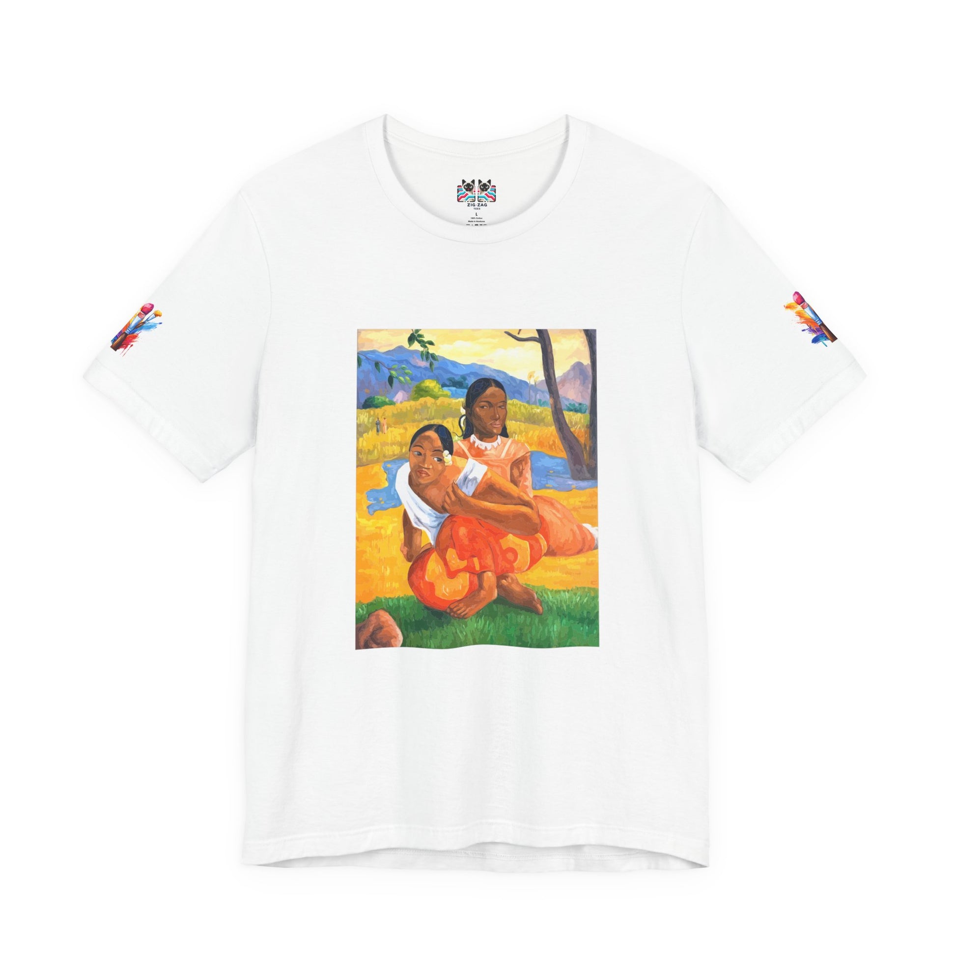 Transport yourself to the vibrant beauty of French Polynesia with this stunning Post-Impressionist art t-shirt. This design features a celebrated painting depicting two Tahitian women in a tropical landscape, rendered in bold colors of yellow, orange, blue, and green. The composition showcases the artist's fascination with exotic cultures and his revolutionary use of flat planes of color and simplified forms that helped pave the way for modern art.