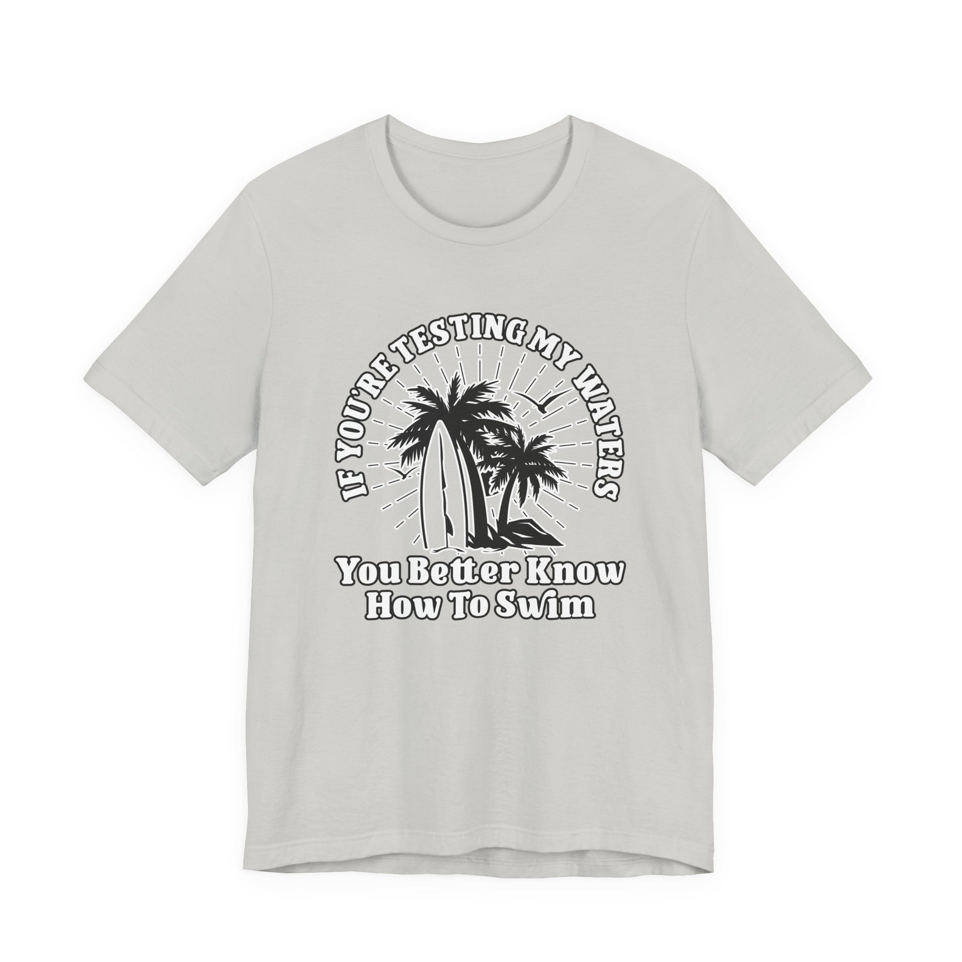 Test My Waters Surf T-Shirt – Beach Palm Trees & Rocks Graphic with Bold Quote
