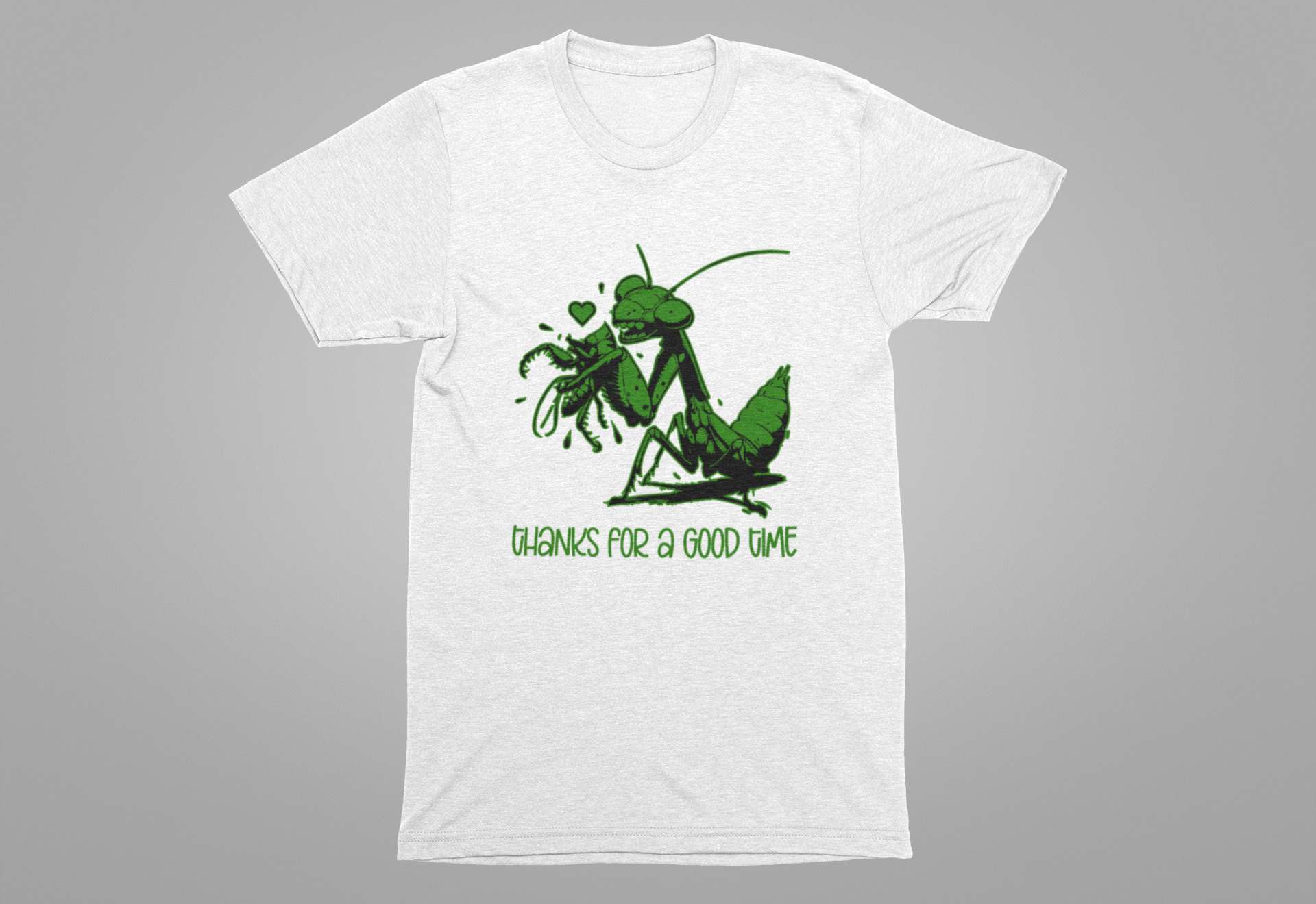 Add some unexpected humor with this playful T-shirt depicting a female grasshopper eating a male, complete with a charming small heart symbol above. Accompanied by the tongue-in-cheek phrase “Thanks for a good time,” this tee is perfect for fans of quirky animal designs and bold statements. A great conversation starter and unique gift for those who appreciate edgy nature-inspired humor.