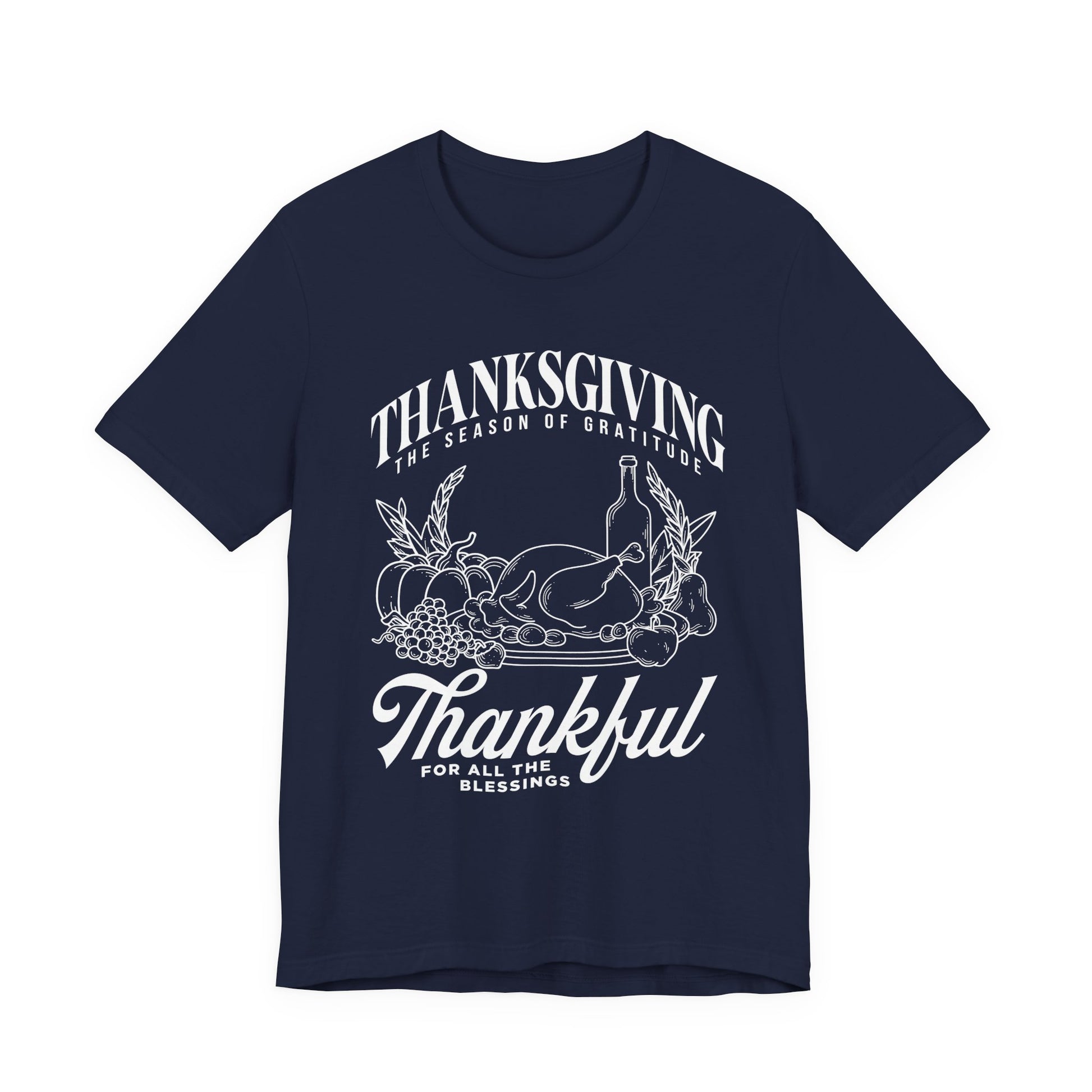 Celebrate the warmth and togetherness of Thanksgiving with this beautifully designed t-shirt featuring a festive food table complete with a prepared turkey, drinks, and fresh fruits. Surrounded by the heartfelt text “Thanksgiving – The Season of Gratitude, Thankful for All the Blessings,” this shirt captures the true spirit of the holiday. Perfect for family gatherings, Friendsgiving, or fall celebrations, its soft, breathable fabric ensures comfort while expressing appreciation for life’s blessings.