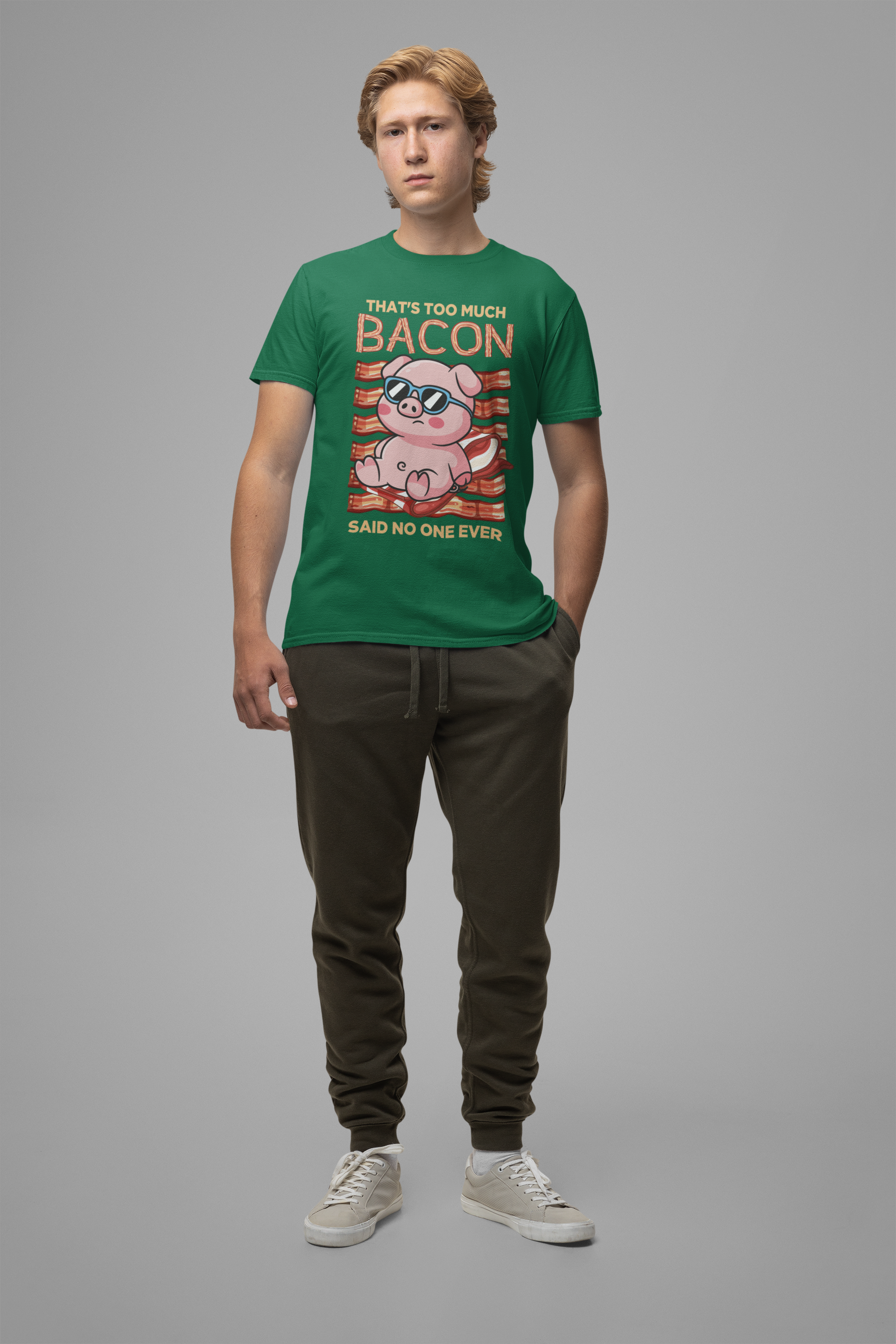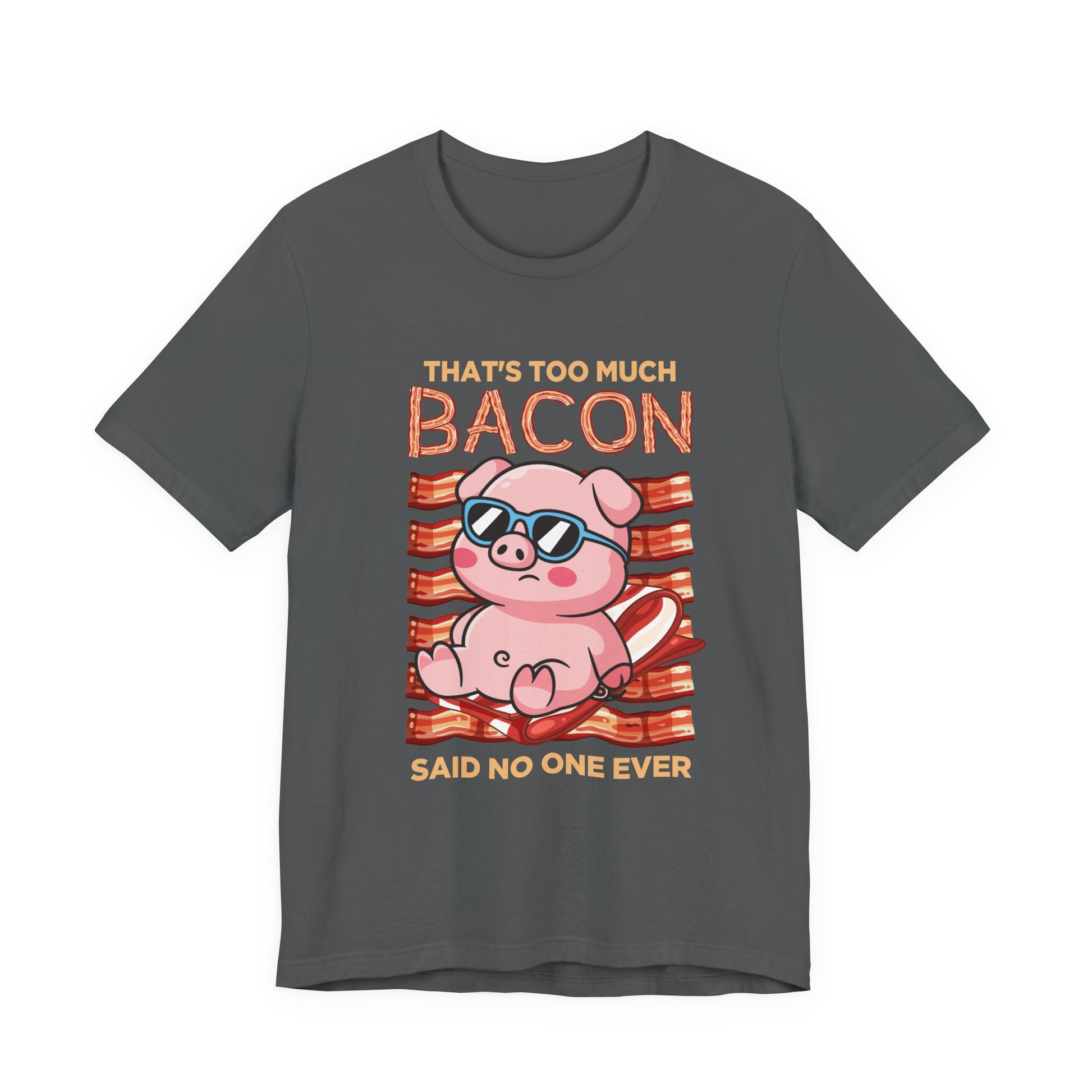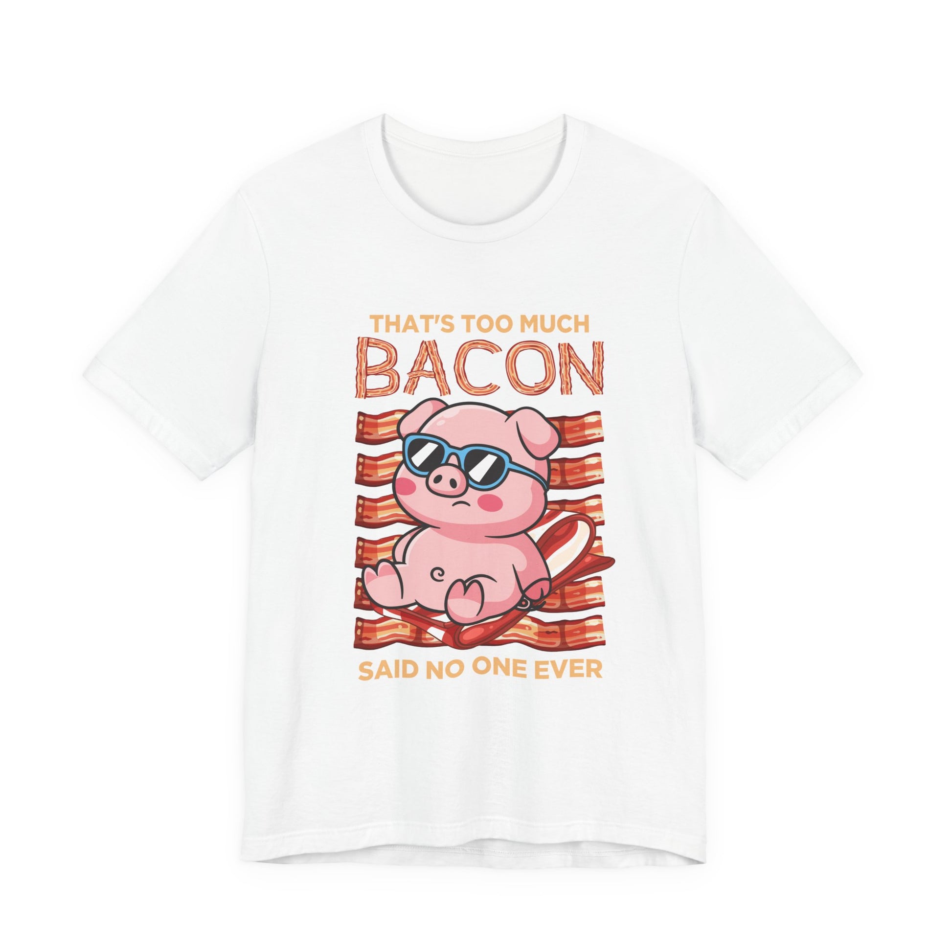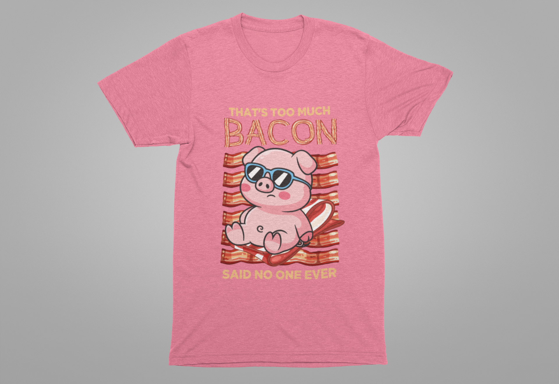 Celebrate your love for bacon with this hilarious T-shirt! The graphic shows a chilled-out pig in sunglasses lying on crispy bacon strips, paired with the witty phrase, “That’s too much BACON said no one ever.” Perfect for foodies, bacon lovers, and anyone with a playful sense of humor. Makes a unique gift and a deliciously fun addition to any casual wardrobe.